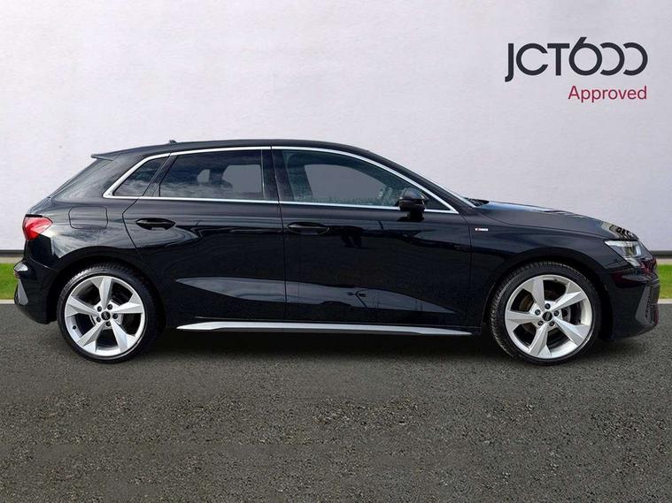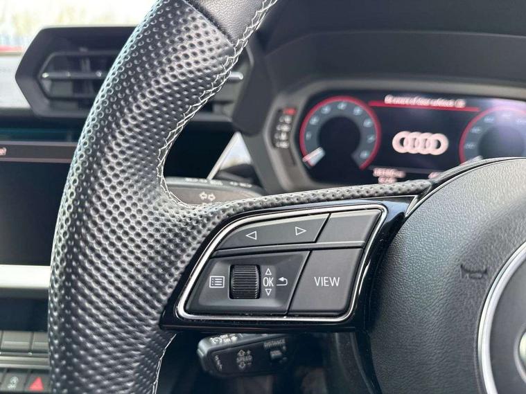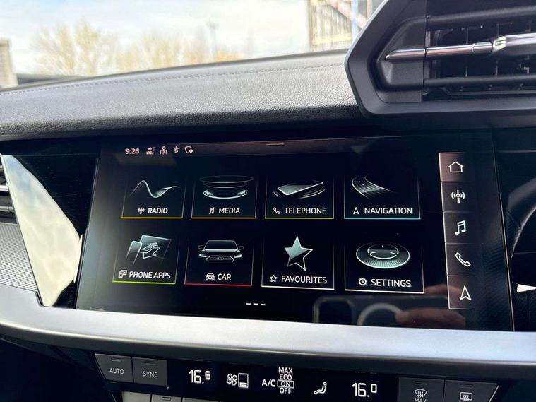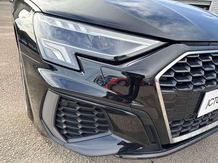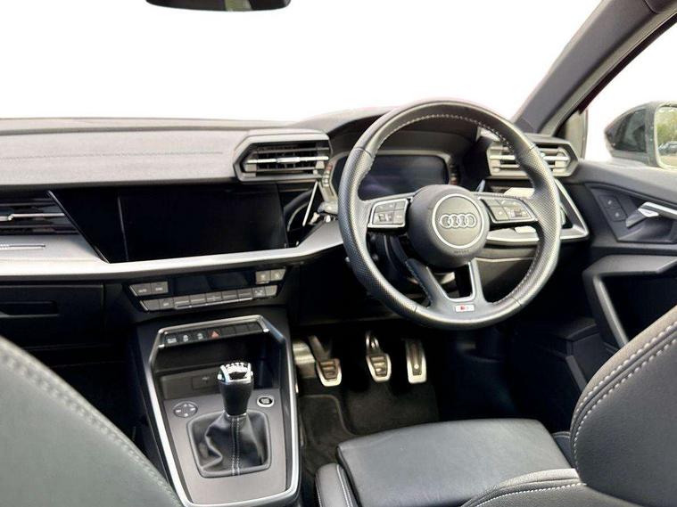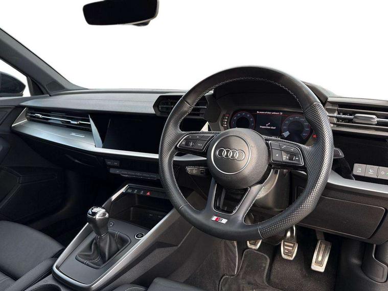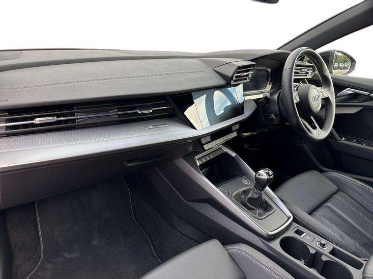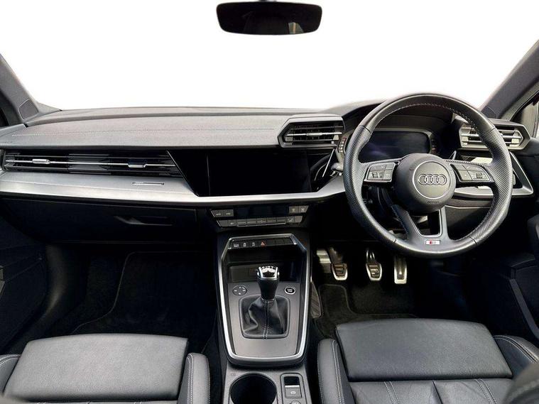 Audi drive select (Auto, Comfort, Dynamic and Individual), Audi smartphone interface, Audi Virtual Cockpit - 10.25" digital and colour instrument cluster, Automatic start/stop system with recuperation, Bluetooth interface, Collision avoidance assistant, Cruise control, e-Call (emergency call), Electromechanical power speed sensitive steering, Lane departure warning system, MMI Navigation Plus with high resolution 10.1" colour touch screen display, Rear parking sensors, Service indicator, Trip computer, Voice control system with natural language interaction, 2xUSB-C connection with data and charging functions, 6 passive loudspeakers, DAB Digital radio, 3rd brake light, Acoustic glass windscreen, Aluminium window trim, Auto dimming frameless rear view mirror, Electrically adjustable/heated/folding/dimming door mirrors with kerb view includes integrated LED indications + kerb view function for passenger side, Front electric windows, Illuminated aluminium inserts front door sills with S logo, LED daytime running lights, LED headlights with LED rear lights and dynamic rear indicators, Light and rain sensors, Privacy glass - dark tinted rear window, rear door and side windows, Rear electric windows, Rear side air outlets in grained matt black, Rear side wing doors, Rear wiper, S line bumpers, S roof spoiler, 12V socket and storage compartment in front centre console, 3 seat bench in 2nd row, 40/20/40 split folding rear seat bench with cupholder, Black cloth headlining, Dual zone electronic climate control, Front and rear centre armrest in leather, Front and rear headrests, Front/rear floor mats, Height and reach adjustable steering wheel, Illuminated vanity mirror, Interior lighting - glove compartment light and right hand side, Luggage compartment floor covering, Manual boot compartment lid, Manually adjustable front seats, Seat side bolsters, Single front passenger seat, Stainless steel pedals and front footrest in black, Twin leather upholstery with front sports seats S embossed logo, Aluminium interior elements pack - A3 Sportback, LED interior lighting pack - A3 Sportback, S line styling pack - A3 Sportback, 3x3 point rear seat belts, Audi pre sense front, Driver and front passenger airbag with passenger airbag deactivation, Electronic Stabilisation Control (ESC) including ABS, ASR and EDL, First aid kit with warning triangle and 2 safety vests, Front side airbags with head airbags and interaction airbag, Pre-sense front with pedestrian and cyclist detection, Seatbelt monitoring, Tyre pressure loss indicator, Anti theft alarm, Anti-theft wheel bolts, Electronically operated child lock, Immobiliser, Remote control central locking, Accent surfaces in the dashboard and centre console in platinum grey silk effect paint finish, Dark spectrum aluminium inlays,