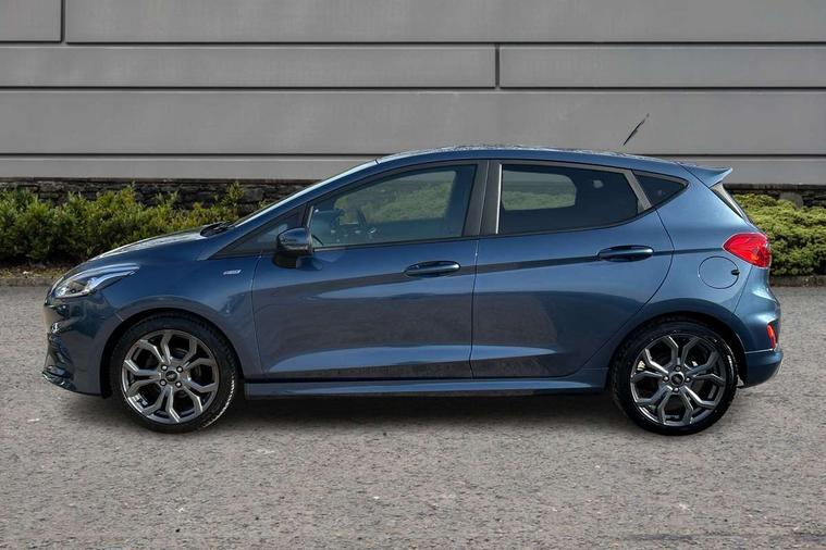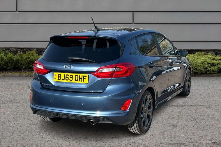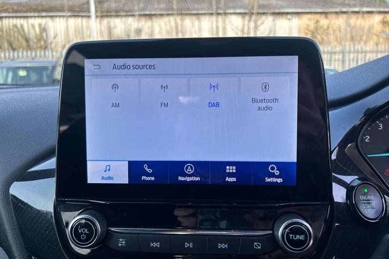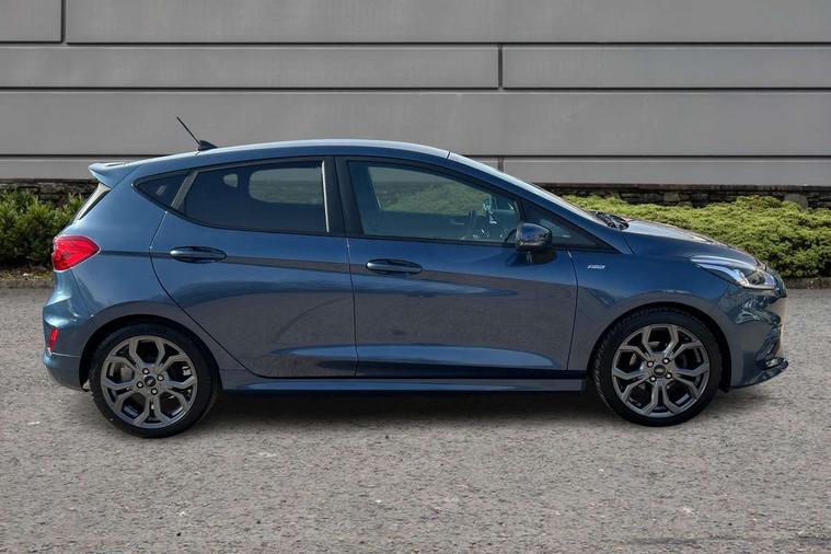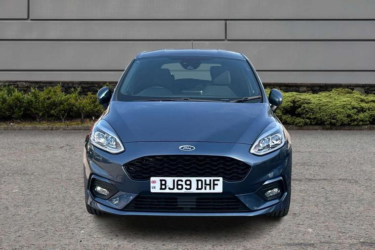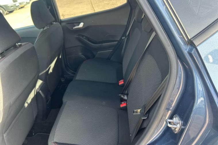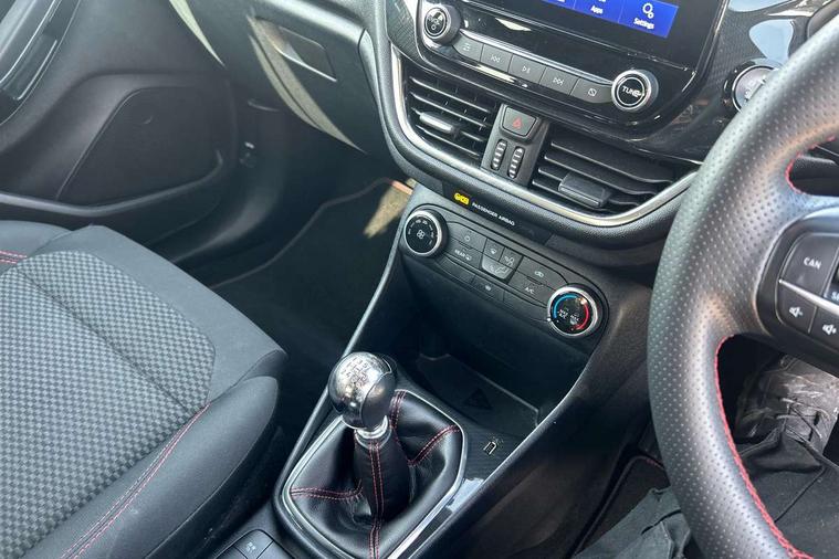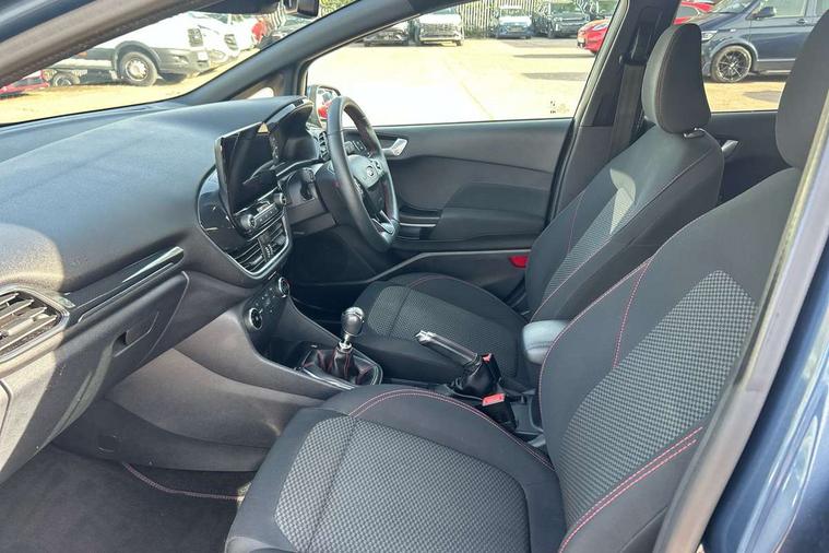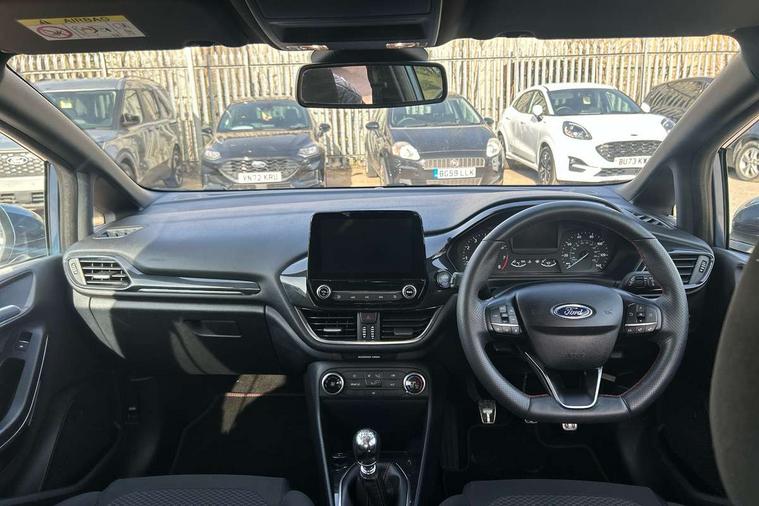 Bluetooth system, Electric power steering, Ford easy fuel, Ford SYNC 3 Navigation system incl 8" touchscreen, 7 speakers, FordPass connect, Apple carplay, android auto, voice control and emergency assistance, Rear parking distance sensors, Trip computer, Sports suspension, 2 USB ports, Auxiliary input socket, DAB Digital radio, Steering wheel mounted controls, Body colour bumpers, Body colour door handles, Body colour large rear spoiler, Body coloured electrically operated and heated door mirrors with side indicators, Cornering front fog lights, Electric front windows/one touch facility, Electric rear windows, LED Night signature to rear lights, Power foldable door mirrors with puddle lights, Quickclear heated windscreen, Rain sensing wipers and auto dimming rear view mirror, Rear privacy glass, Rear wiper, Unique ST-Line upper grille & full bodystyling kit with ST-Line wing badges, 12V Accessory socket in centre console, 3 spoke flat bottomed leather steering wheel, 60/40 split folding rear seat, Adjustable head restraints, Black headlining, Boot carpet, Centre console with armrest and illuminated cupholders, Chrome inner door handles, Cloth upholstery, Footwell illumination, Front map reading lights, Front seat and rear pockets, Front/rear floor mats, Height adjustable driver's seat, Illuminated glovebox, LED ambient lighting, Load area light, Manual air conditioning, Overhead console with sunglasses holder, Pollen filter, Rake/reach adjustable steering wheel, Sensico wrapped handbrake and gearknob, Sports front seats, Sports pedals, NCAP Pack - Fiesta, 3 point seatbelts on all rear seats, ABS+EBA, Curtain airbags, Driver and passenger airbags, Drivers knee airbag, Electronic stability control with hill start assist, Front passenger airbag deactivation, Front side airbags, Seatbelt warning, Two tone horn, Tyre pressure monitoring system, Keyless start with 'Ford Power' starter button, MyKey system, Remote central locking & engine immobiliser, Thatcham Cat.1 alarm, 17" 5 spoke alloy wheels with rock metallic finish,