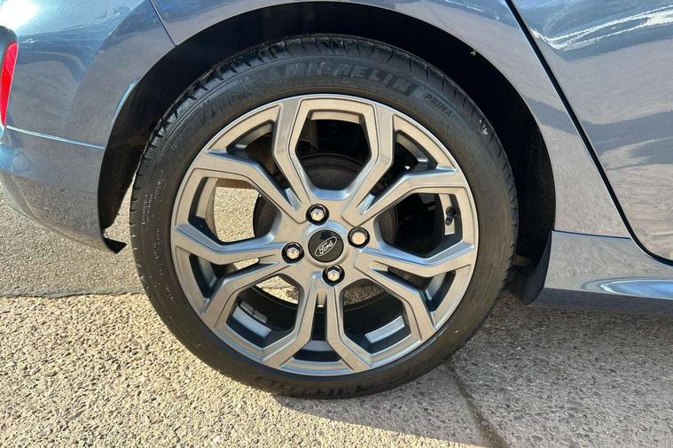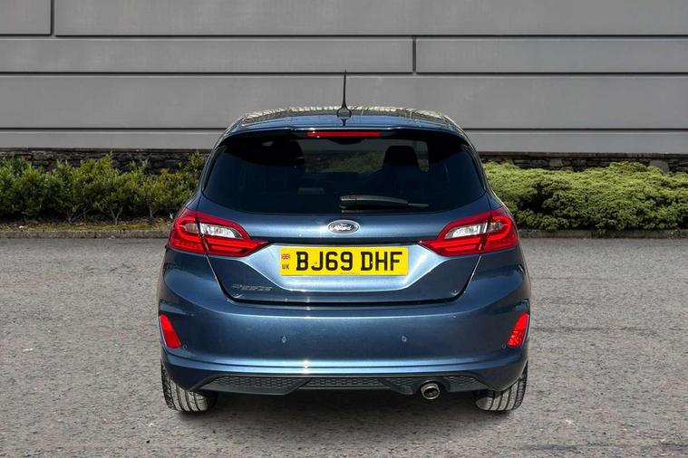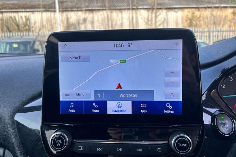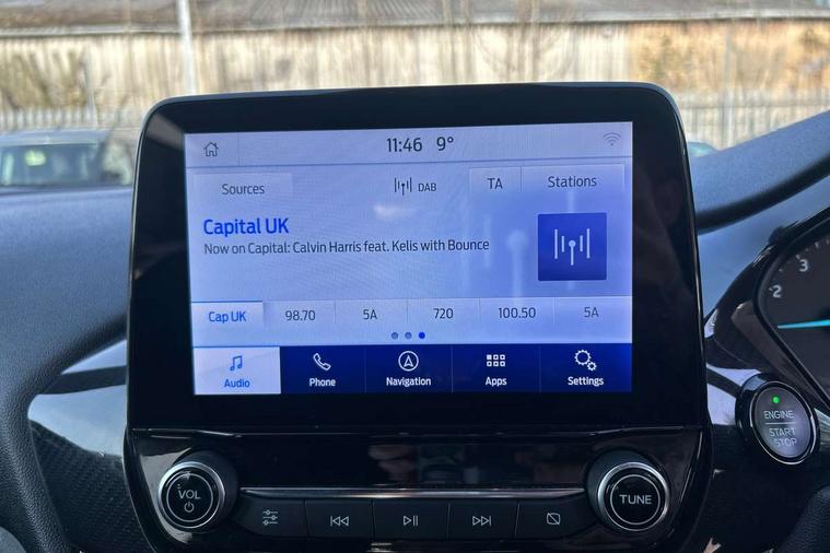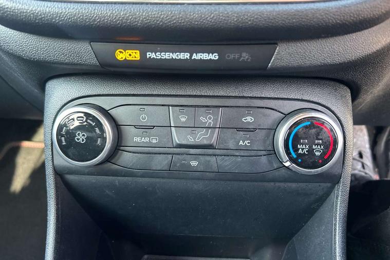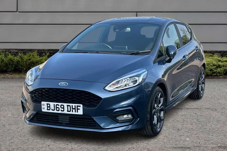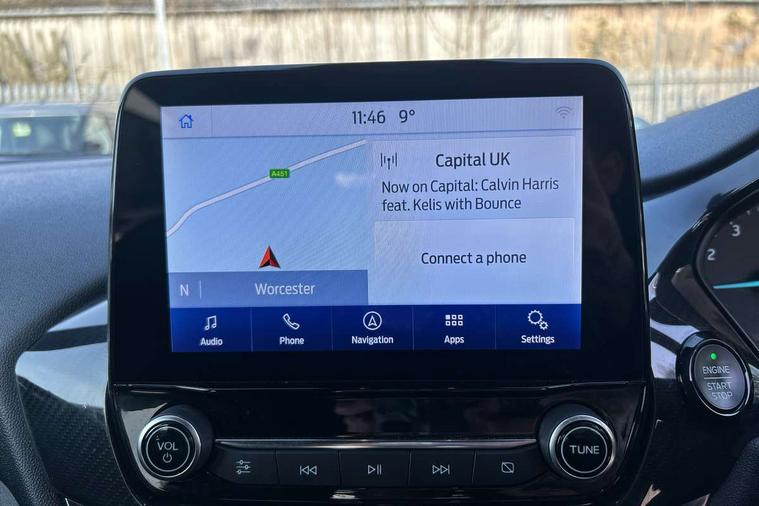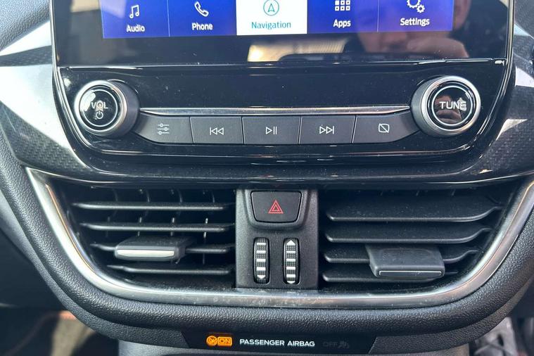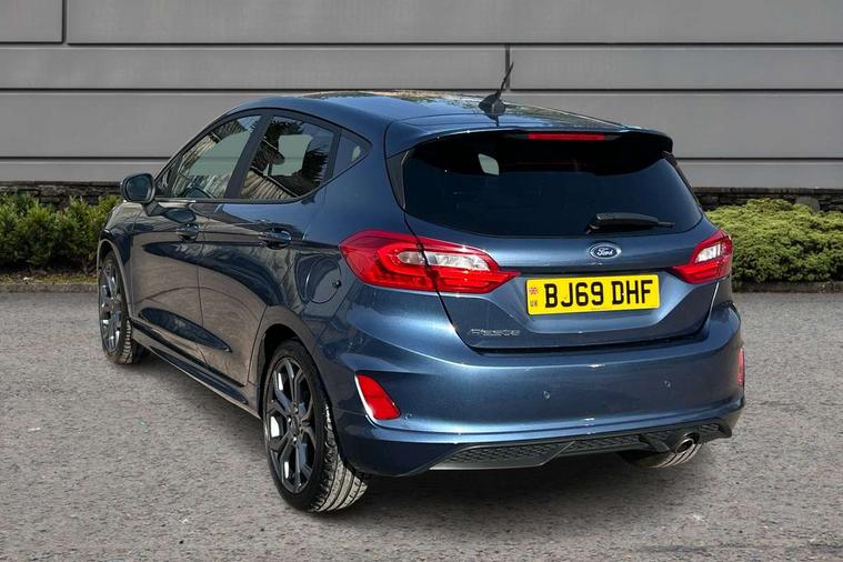 Bluetooth system, Electric power steering, Ford easy fuel, Ford SYNC 3 Navigation system incl 8" touchscreen, 7 speakers, FordPass connect, Apple carplay, android auto, voice control and emergency assistance, Rear parking distance sensors, Trip computer, Sports suspension, 2 USB ports, Auxiliary input socket, DAB Digital radio, Steering wheel mounted controls, Body colour bumpers, Body colour door handles, Body colour large rear spoiler, Body coloured electrically operated and heated door mirrors with side indicators, Cornering front fog lights, Electric front windows/one touch facility, Electric rear windows, LED Night signature to rear lights, Power foldable door mirrors with puddle lights, Quickclear heated windscreen, Rain sensing wipers and auto dimming rear view mirror, Rear privacy glass, Rear wiper, Unique ST-Line upper grille & full bodystyling kit with ST-Line wing badges, 12V Accessory socket in centre console, 3 spoke flat bottomed leather steering wheel, 60/40 split folding rear seat, Adjustable head restraints, Black headlining, Boot carpet, Centre console with armrest and illuminated cupholders, Chrome inner door handles, Cloth upholstery, Footwell illumination, Front map reading lights, Front seat and rear pockets, Front/rear floor mats, Height adjustable driver's seat, Illuminated glovebox, LED ambient lighting, Load area light, Manual air conditioning, Overhead console with sunglasses holder, Pollen filter, Rake/reach adjustable steering wheel, Sensico wrapped handbrake and gearknob, Sports front seats, Sports pedals, NCAP Pack - Fiesta, 3 point seatbelts on all rear seats, ABS+EBA, Curtain airbags, Driver and passenger airbags, Drivers knee airbag, Electronic stability control with hill start assist, Front passenger airbag deactivation, Front side airbags, Seatbelt warning, Two tone horn, Tyre pressure monitoring system, Keyless start with 'Ford Power' starter button, MyKey system, Remote central locking & engine immobiliser, Thatcham Cat.1 alarm, 17" 5 spoke alloy wheels with rock metallic finish,