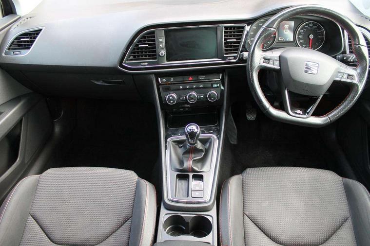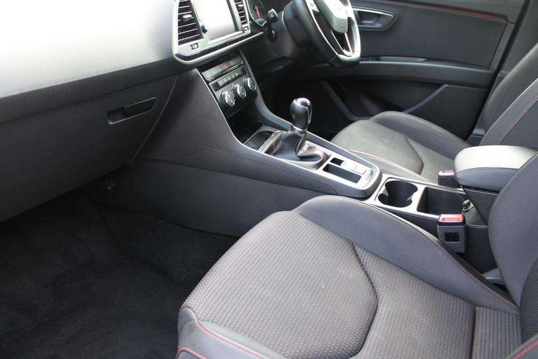 'Lights On' Reminder warning buzzer, 8" touch screen, Bluetooth Handsfree Phone Connection, Low fuel warning light, Outside temperature gauge, Remote fuel flap release, SEAT Drive profile, SEAT logo boot release, Service interval indicator, Touch screen display, Trip computer, Voice control system, XDS electronic differential lock, 2 USB ports, 2x SD card slot, Auxiliary input socket, Bluetooth audio streaming, DAB Digital radio, Radio/CD + MP3, Steering wheel mounted audio/phone controls, Aluminium front door sills, Black grille with chrome surround, Body colour door handles, Body coloured bumpers, Body coloured door mirrors, Dark tinted rear windows, Electric adjustable/heated/folding door mirrors, Electric front/rear windows with one touch/auto up/down, Electric headlamp adjustment, High gloss black finish B and C pillars, LED indicators in door mirrors, Rear wash/wipe, Reverse activated kerb-view adjustment on passenger's door mirror, Twin exhaust pipes, 12v power point in centre console, 3 height adjustable rear headrests, 60/40 split folding rear seat, Active head restraints, Additional heating and ventilation outlet in rear of centre console, Ambient lighting, Boot net, Chrome loading sill, Driver seat lumbar adjustment, Driver/passenger sunvisors with illuminated vanity mirrors, Dual zone climate control, Dust/pollen filter, Front adjustable head restraints, Front armrest with storage box, Front cupholders x 2, Front map reading lights, Front seat and rear pockets, Front sports seats, Front/rear floor mats, Height/reach adjust steering wheel, Illuminated glovebox, Instrument lighting with brightness control, Leather handbrake, Luggage compartment cover, Luggage tie-down hooks, Passenger seat height adjuster, Passenger seat lumbar adjust, Perforated leather steering wheel with red stitching + gear knob, Rear reading lights, Rear top tether child seat ISOFIX attachment, Rear window curtains, Full LED headlight pack - Leon, 3 point seatbelts on all rear seats, ABS + traction control, Child proof door locks, Collision mitigation braking system, Curtain airbags, Driver/Front Passenger airbags, Drivers knee airbag, Electronic parking brake with auto hold, ESP+EBA, Front assist including city emergency braking, Front seatbelt pretensioners, Front Seatbelt warning, Front side airbags, Hill hold control, Manual passenger airbag deactivation function, Tyre pressure monitoring system, 2 folding remote keys with window open/close function, Engine immobiliser, Locking wheel bolts, Remote central locking + deadlocks, Volumetric alarm with back up horn, Chrome interior trim,