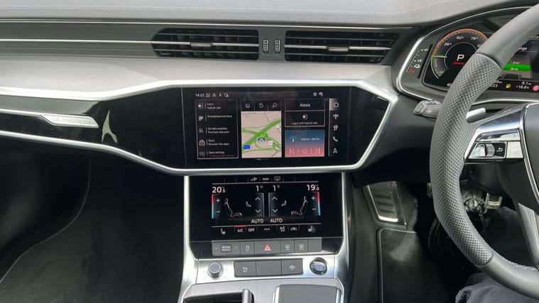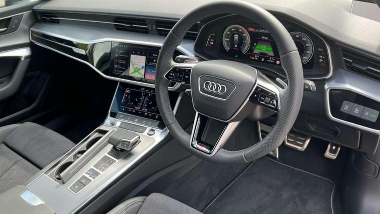 Audi connect safety and service (e-call), Audi connect with Amazon Alexa Integration, Audi drive select, Audi parking system plus - acoustic and visual park assist system for front and rear, Audi virtual cockpit, Automatic start/stop system with coasting functionality, Bluetooth interface, Camera based traffic sign recognition, Lane departure warning system, MMI navigation plus with 10.1" and 8.6" touch screens, Power operated tailgate, Progressive steering, Rear view camera, Service interval indicator, Smartphone interface includes wireless Apple carplay/Android Auto, Voice control system, 3 pin 10 amp domestic charging cable, 52 litre fuel tank, 7.4 kW onboard charger, Compact charging system, Hybrid propulsion system, Industrial connector CEE 32A, 230V, long and straight for the e-tron charging system, Mode 3 charging cable for public charging (AC), Sports suspension, Type 2 socket for AC charging, Audi front music interface, Audi sound system, Auxiliary input socket, DAB Digital radio, USB connection, Aluminium roof rails, Body colour rear roof spoiler, Body coloured door mirrors, Electric front/rear windows, Electrically adjustable heated and folding + automatically dimming exterior mirrors with memory function, Frameless auto dimming interior rear view mirror, Front intermittent wipers, Heat insulating darkened glass in side and rear windows, Heat insulating glass in windshield, LED rear lights with dynamic indicators, LED signature front daytime running light, LED third brake light, Matrix LED headlights, Matt black rear diffuser with diffuser strip and tailpipes in chrome, Matt black side air intake grille with inlay in matt aluminium, Privacy glass, Radiator grille in anthracite black matt, single frame in chrome and horizontal struts in matt aluminium silver, Rain and light sensors, Rear side wing doors, Rear wiper, 3 spoke high multi-function perforated leather steering wheel with contrast stitching and shift paddles, 4 zone deluxe automatic climate control, 40/20/40 split folding 3 rear seat bench in 3 parts with rear centre armrest, Audi phone box light, Black cloth headlining, Electrically adjustable front seats including seat height, fore/aft position, backrest angle and 4-way lumbar with memory for driver's seat, Front and rear floor mats, Front centre armrest, Front head restraints, Heated front seats, Height/reach adjust steering wheel, Illuminated door sill trims with S logo, Illuminated sun visors with vanity mirrors, Leather gear knob, Luggage compartment system, Rear headrests, Single front passenger seat, Stainless steel pedals and foot rest, Tool kit and car jack, LED Interior Ambient Lighting Pack - A6, Non smoking pack - A6, S line exterior style pack - A6, 3 point seatbelts on all seats, Airbags - Front side, front and rear including head, Audi pre-sense front, EBD - Electronic brakeforce distribution, Electromechanical parking brake, Electronic Stability Control (ESC) including ABS, ASR and EDL, Extended pedestrian protection measures, ISOFIX child seat mounting for front passenger seat and ISOFIX child seat mounting with Top Tether for outer rear seats, Manual child proof rear door locks, Seatbelt monitoring, Tyre pressure warning light, Warning triangle and first aid kit, Anti theft alarm with tow away protection, Anti-theft wheel bolts and wheel loosening detection, Immobiliser, Keyless Go, Remote central locking, Matt brushed aluminium inlays, Tyre repair kit,