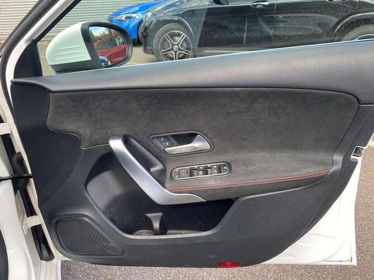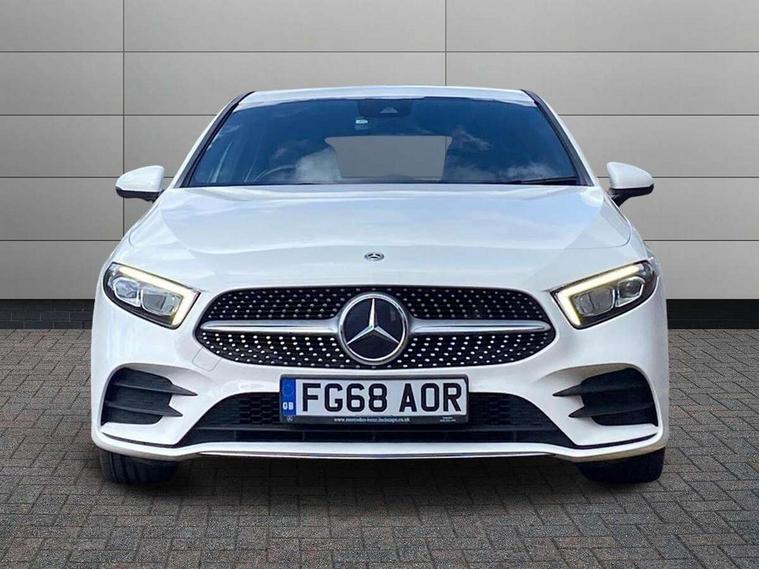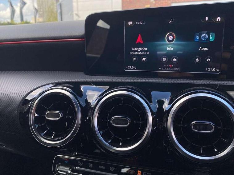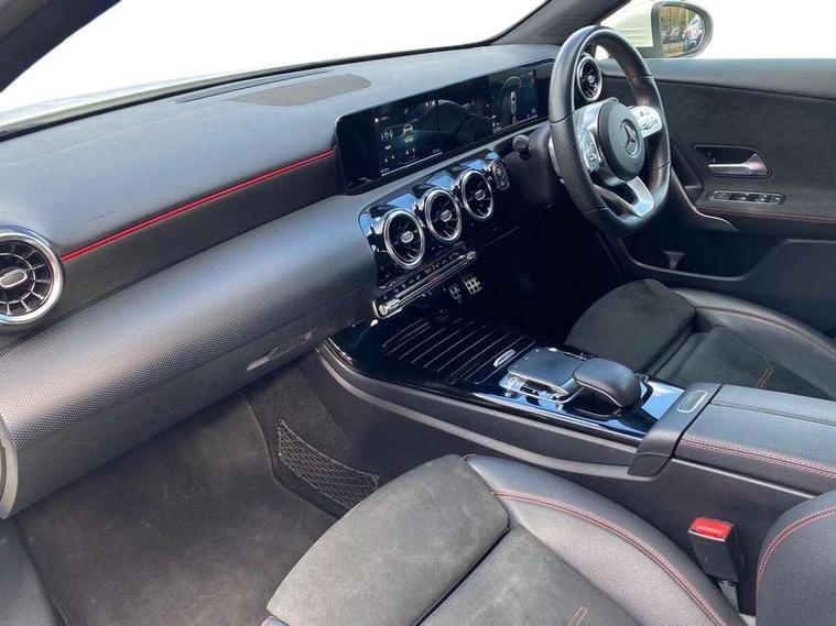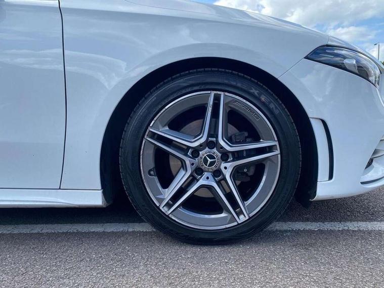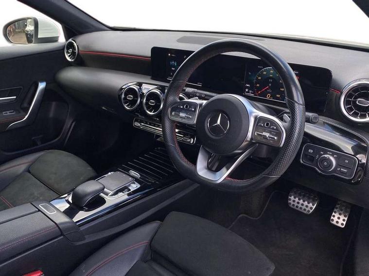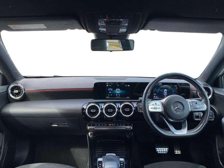 7" colour screen in instrument panel, 7" tablet style colour display, Active lane keep assist, Attention assist, Bluetooth interface for hands free telephone, Bulb failure indicator, Cruise control + speed limiter, Direct steering, DYNAMIC SELECT with a choice of driving modes (ECO, Comfort, Sport, Sport+ and Individual), External temperature gauge, HDD Navigation system, Low fluid warning light, Mercedes connect me with remote online services, Radio aerial integrated into roof spoiler, Reversing camera, Service indicator (ASSYST PLUS), Speed sensitive power steering, Stop/start system, Trip computer, Voice control system, Warning lamp for direction indicators, Lowered comfort suspension, 2 USB ports in centre console, DAB Digital radio, MBUX Multimedia system including digital instrument cluster and phone mirroring, Adaptive brake lights, AMG body styling, Body colour bumpers, Body colour door handles, Body colour side skirt, Body coloured door mirrors, Chrome beltline trim, Diamond radiator grille with chrome pins and silver louvre + chrome insert, Electric adjustable heated door mirrors, Electric front windows, Electric rear windows, Headlamp assist, Heated rear window with timer, High level third brake light, LED daytime running lights, LED Headlights, LED rear lights, Rain sensor windscreen wipers, Rear fog lights, Rear wiper, Twin Trapezoidal tailpipes, 1/3 to 2/3 split folding rear seats, 12V socket, 3 spoke flat bottomed nappa leather sport steering wheel, AMG floor mats with red stitching, Artico man-made leather/Dinamica upholstery, Auto Mercedes-Benz child seat recognition sensor, Black headlining, Brushed stainless steel sports pedals with rubber studs, Controller on centre console with chrome surround, Dual zone automatic climate control, Exit lights, Footwell lights, Front and rear reading lights, Front centre armrest with storage compartment, Front door sills with Mercedes Benz lettering, Front head restraints, Front seat backs luggage nets, Front sport seats, Gearshift paddles on steering wheel, Height adjustable front seats, Height/reach adjustable steering column, Illuminated cup holders, Illuminated glovebox, Illuminated storage compartment, Integrated head restraints, Interior door handle illumination, Isofix rear child seat preparation, Load securing rings in luggage compartment, Luggage compartment cover, Multifunction steering wheel, Oddments tray lighting, Reading lights, Rear head restraints, Storage compartment under load area floor, Sunvisors with illuminated vanity mirrors, Touchpad, Twin front cupholders, Seat comfort pack - A Class, 3 rear 3 point seatbelts, ABS with Brake Assist, Active bonnet, Brake calipers with Mercedes-Benz lettering + perforated brake discs, Child proof door locks, Crash responsive emergency lighting, Drivers knee airbag, Dual stage driver/passenger airbags, Electronic parking brake, ESP with ASR, Front and rear seatbelt reminder, Front head airbags, Front passenger seat occupancy sensor, Front side airbags, Hill start assist, Tyre pressure monitoring system, Warning triangle and first aid kit, Window airbags, Alarm system/interior protection/immobiliser, Keyless ignition, Remote central locking, Chrome air vent surrounds, 18" AMG 5 twin spoke light alloy wheels in titanium grey with highsheen finish, Tirefit sealant with electric air pump,