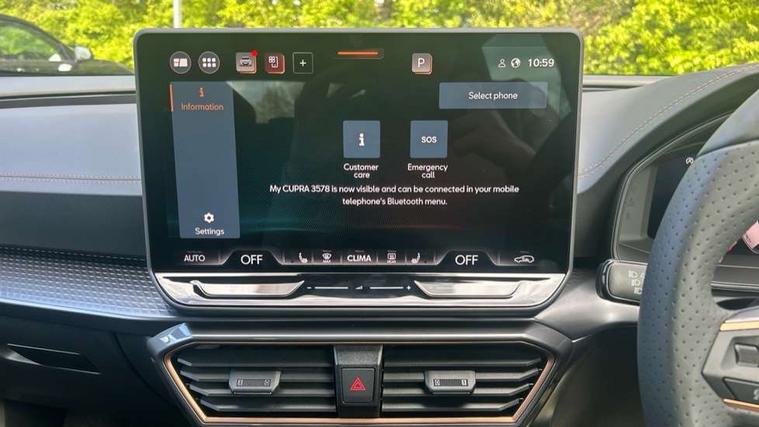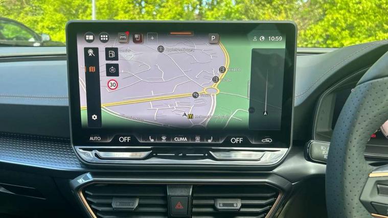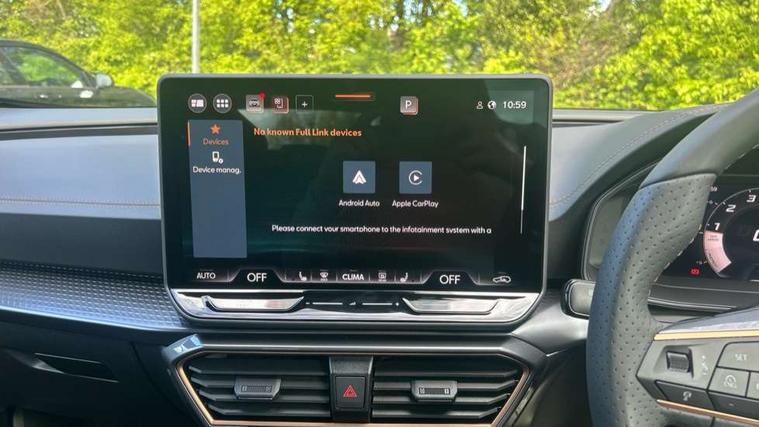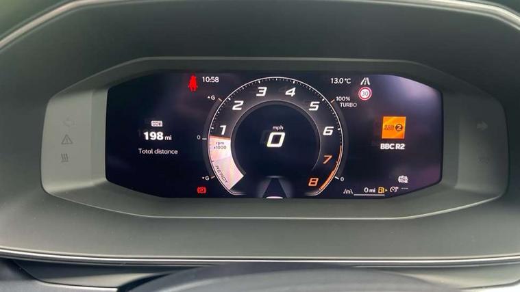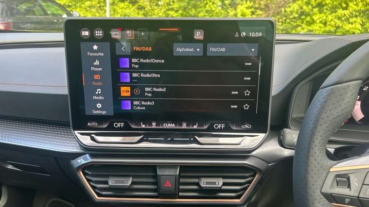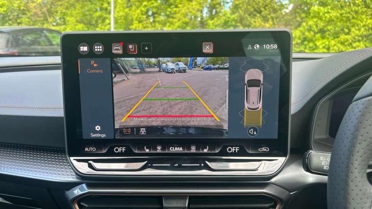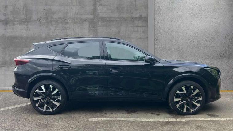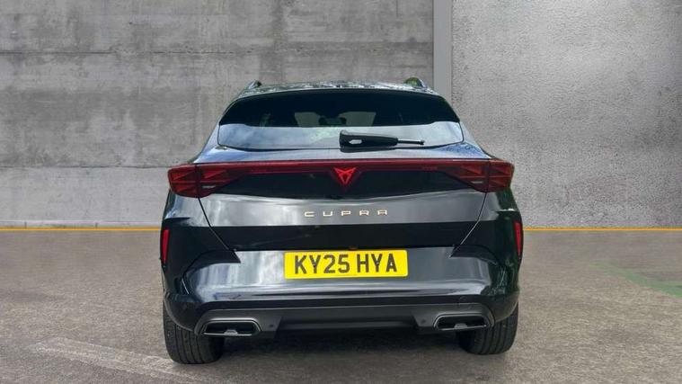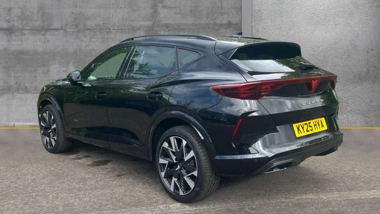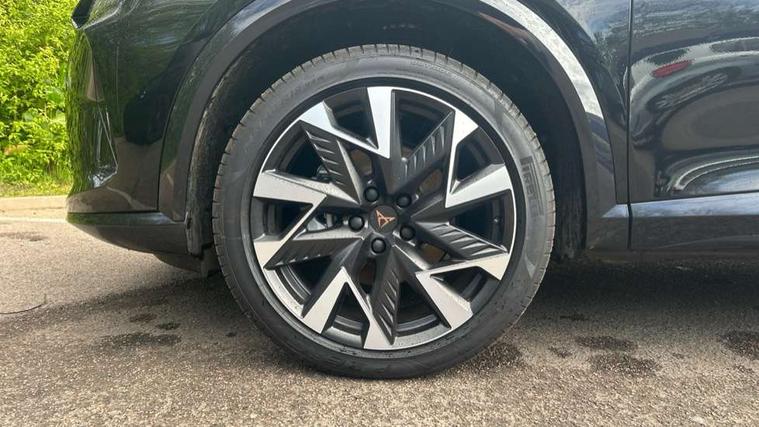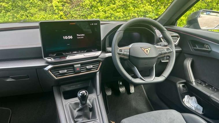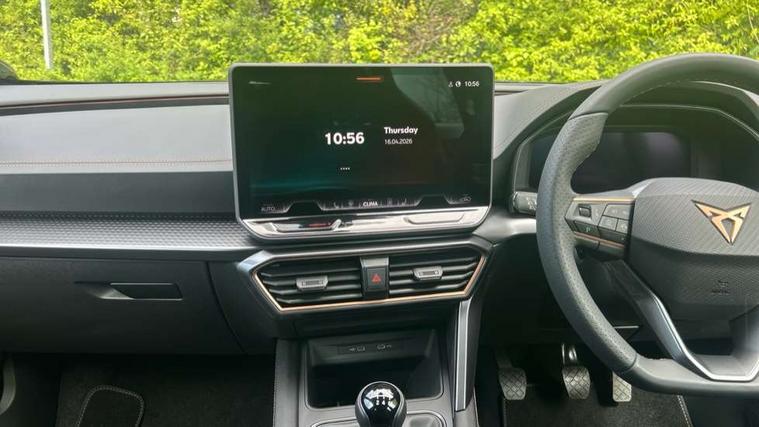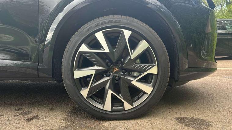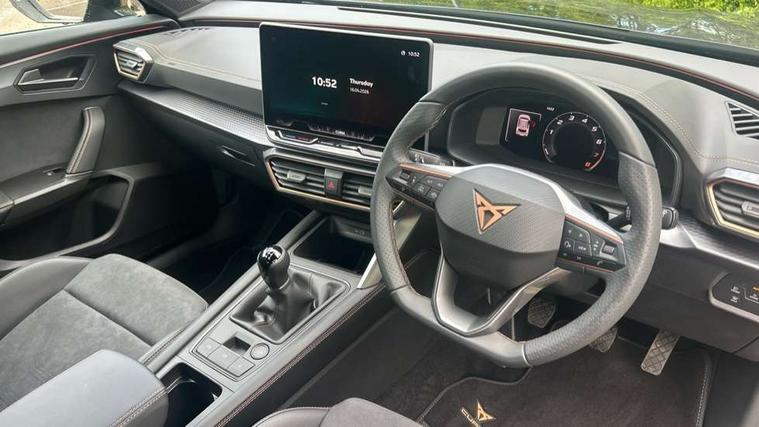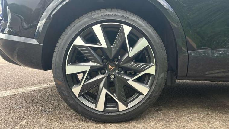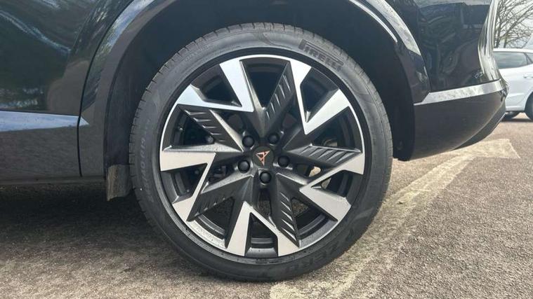 10.25" digital cockpit and configurable dashboard, Adaptive cruise control with follow-to-stop and speed limiter, Advanced driver alert system, Driving profile selection, Dynamic road sign display, Emergency steering support with turn assist, Forward collision warning with automatic braking, Front and rear parking sensors, Full link phone integration, Lane assist, Progressive steering, Rear view camera, RPM, trip computer, outside temp gauge, instrument light brightness, low fuel warning light, lights on reminder, gearshift indicator, Service interval indicator, Start/stop system with regenerative braking, Virtual pedal and electric tailgate, Voice control system, Wired Android Auto, Wireless apple carplay, Wireless phone charger, CUPRA sport suspension, Electronic locking differential and dynamic traction support, 2 front and 2 rear USB type C sockets, Media system with navigation, 12.9" touchscreen display, voice control, DAB, steering wheel mounted controls, Auto dimming rear view mirror, Body colour door handles, Body coloured bumpers, Dark grey wing mirror, Daytime running light with automatic headlight control and coming home feature, Door panel ambient lighting, Dynamic headlight range control, Electric front/rear windows, Electrically adjustable heated and folding door mirrors with memory function, Gloss black roof rails and window surrounds, High beam assist, LED 3rd brake light, LED front fog lamps with cornering function, LED Headlights, LED Taillights with dynamic indicator, Rain sensing wipers, Rear diffuser with black simulated exhaust pipes, Rear fog lights, Rear side wing doors, Rear wash/wipe, Tinted rear windows, Welcome lights (within exterior mirror housing), 12V socket, 2 front and 2 rear reading lights, 3 seat bench in 2nd row, 60/40 split rear bench seat with armrest and mechanical seat release, Black headlining, Black interior roof lining, Dust/pollen filter, Electrically adjustable driver's seat with memory and lumbar support, Front and rear head restraints, Front centre armrest, Heated front seats, Height/reach adjust steering wheel, Illuminated aluminium doorsteps, Illuminated interior front door sills, Illuminated sunvisor with mirror, Isofix, Leather dashboard, door insert and side trim panel, Leather multi function steering wheel, LED smart wraparound lighting, PVC/Dinamica microfiber upholstery + bucket seats, Single front passenger seat, Storage pockets on rear of front seats, Three zone climate control with control panel in rear, Variable luggage/load compartment floor, 3 point seatbelts on all rear seats, ABS, Brake control system - ESC and brake booster, Child proof door locks, Driver and front passenger airbags with front passenger airbag de-activation, Electronic parking brake, Front and rear disc brakes, Front side curtain airbags, Hill hold control, Public e-call, Seat belt reminder for front and rear seats, Tyre pressure monitoring system, Anti theft alarm system, KESSY Advanced - Keyless start, keyless entry with SAFELOCK, Locking wheel bolts, Copper and aluminium interior detailing, 19" Sandstorm machined sport black and silver alloy wheels,