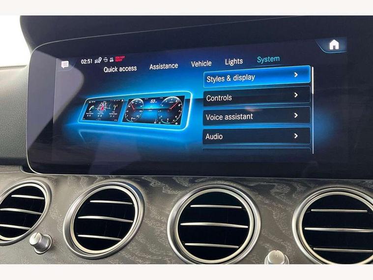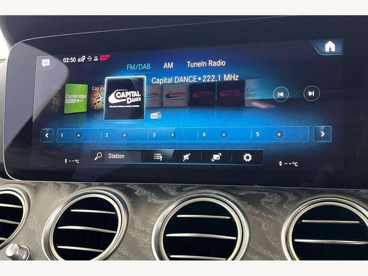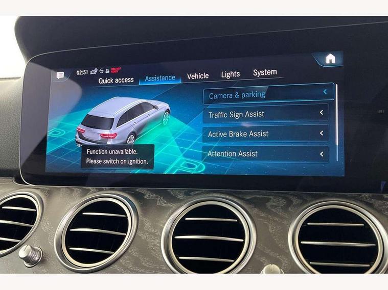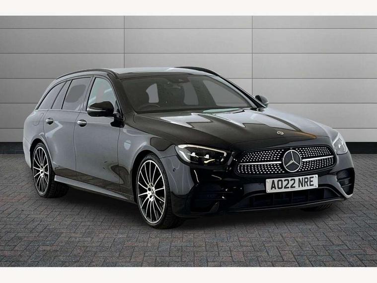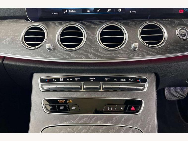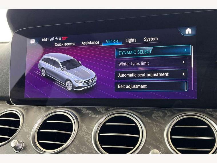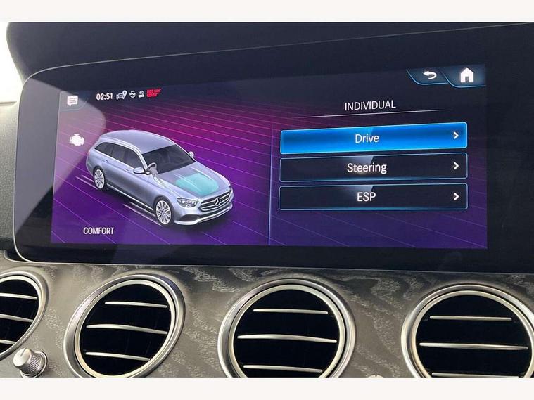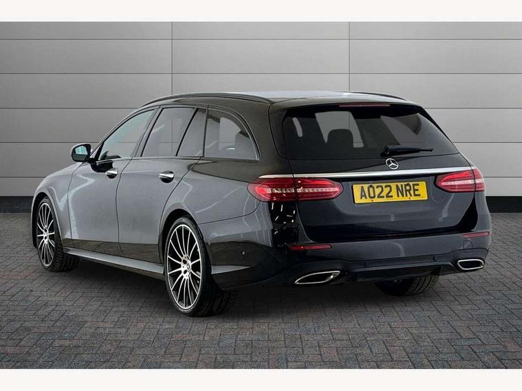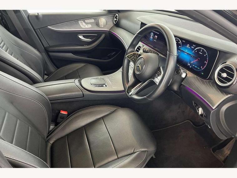 Attention assist, Brake wear warning display, Cockpit display 10.25" widescreen digital instrument cluster, Direct steer speed sensitive steering, DYNAMIC SELECT with a choice of driving modes (ECO, Comfort, Sport, Sport+ and Individual), Easy-pack tailgate - Powered opening/closing automatically, ECO start/stop function, Emergency call service, High resolution 10.25" multimedia colour display, MBUX voice control activated by keywords "Hey Mercedes", Mercedes connect me, Outside temperature display, Remote boot release, Service indicator (ASSYST), Smartphone integration via Android Auto/Apple CarPlay, Media Interface, USB and Bluetooth interface, Status display for rear seat belts in instrument cluster, Touchpad with controller, Traffic sign assist, Trip computer in multifunction display showing current fuel consumption, Wireless charging, 25 litre AdBlue tank, 66 litre fuel tank, 9G TRONIC 9 speed automatic transmission, Agility control sports suspension with selective damping system and lowered by 15mm, Diesel particulate filter, Incorrect fuelling protection, Rear air suspension with level control, 2 USB ports in centre console, 2 USB ports in the rear, Burmester surround sound system with 13 speakers and a 9 channel amplifier with total output of 590 watts, MBUX multimedia system with DAB digital radio and touchpad including satellite navigation, 3rd brake light, Adaptive brake lights, Aerial integrated in rear window, AMG bodystyling front and rear aprons and side sill panels, Chrome roof rails, Electric windows with one touch opening/closing and obstruction sensors, Electrically adjustable and heated door mirrors, Front apron in high gloss black, High gloss black exterior mirror housing, High gloss black rear bumper with chrome trim, Illuminated front door sill panels with Mercedes-Benz lettering, LED High Performance headlamps including integral LED daytime running lamps, LED rear lights, Panoramic electric glass sunroof, Privacy glass Includes rear side windows and rear windscreen, Radiator grille with integral star and 2 louvres in high gloss black, Rain sensor with automatic headlight activation, Rear side wing doors, Rear wiper, Tail lights, Top surround of side windows in polished aluminium, Visible twin pipe exhaust system integrated into bumper, Waistline trim strip in high gloss black, 3 seat bench in 2nd row, 3 spoke multifunction flat bottom AMG steering wheel with chrome inserts and touch control buttons, trimmed in black nappa leather, 40:20:40 split folding rear bench seat, Artico man-made leather upper dashboard and beltlines with contrast stitching, Automatic child seat recognition sensor, Black door pins, Black roof lining, Central stowage compartment with 12 V socket in centre console, USB socket for use with Android Auto and Apple CarPlay, Courtesy lights in rear grab handles with reading light functionality, Floor mats with AMG lettering, Four way partially front electric seat adjustment, Front centre armrest with stowage compartment, Glasses compartment in overhead control panel, Glove compartment - lockable, air conditioned and illuminated, Head restraints for driver and front passenger (four-way adjustability) and in rear (two-way), Heated front seats, Interior lighting - 64 colour Ambient lighting, Leather upholstery, Seat occupancy sensor for front passenger seat, Single front passenger seat, Sports pedals in brushed stainless steel with black rubber studs, Steering column electrically adjustable for height and reach, Steering wheel multifunction with gearshift paddles, Steering wheel touch control buttons for audio and onboard settings, Sunvisors with illuminated vanity mirrors, THERMOTRONIC automatic climate control system with 3 climate zones, Mirror pack - E Class, Parking package including 360 degree camera - E Class, Seat comfort pack - E Class, Stowage pack - E Class Estate, 3x3 point rear seatbelts, Active bonnet pedestrian safety measure which detects an impact and raises bonnet, Adaptive brake system with HOLD function and brake drying in the wet, Airbags - sidebag for driver and front passenger with combined thorax/pelvis bag, Anti-lock braking system (ABS), Childproof locks manually operated for rear doors and electrically operated for rear power windows, Driver and adaptive front passenger airbags, Drivers knee airbag, Electronic parking brake, Hill start assist, ISOFIX child seat attachment points two outer rear seats, Perforated brake discs with Mercedes Benz lettering, Pre-Safe anticipatory safety system, Tyre pressure monitoring system, Warning triangle and first aid kit, Window airbags, Alarm system/interior protection/immobiliser, Central locking with interior switch, automatic locking and crash sensor with emergency opening function, Chrome surround in electric key, Keyless entry go starting function, Grey open pore ash wood trim and centre console in grey open pored ash wood, 20" AMG multi spoke light alloy wheels painted in high gloss black with high sheen finsih, Summer tyres, TIREFIT with tyre inflation compressor,