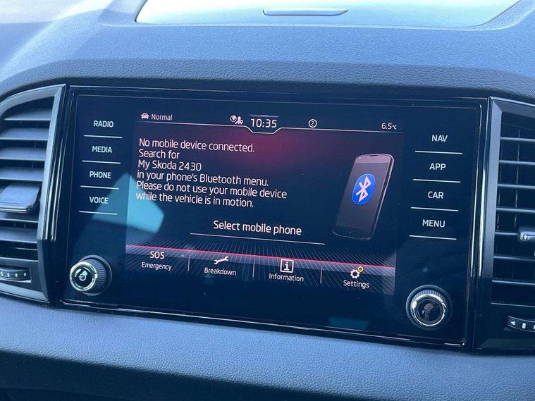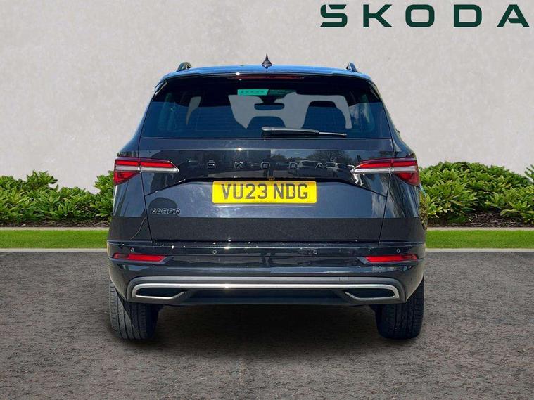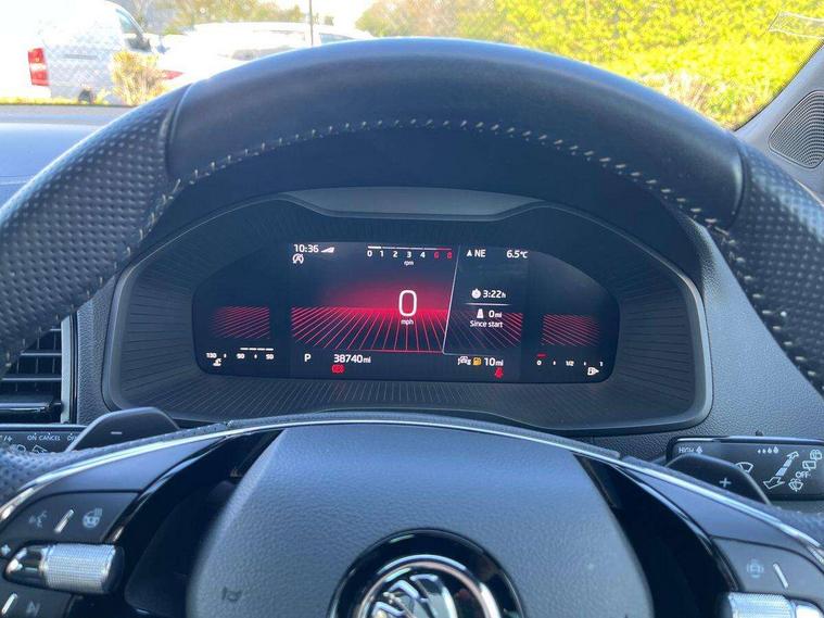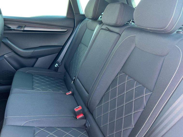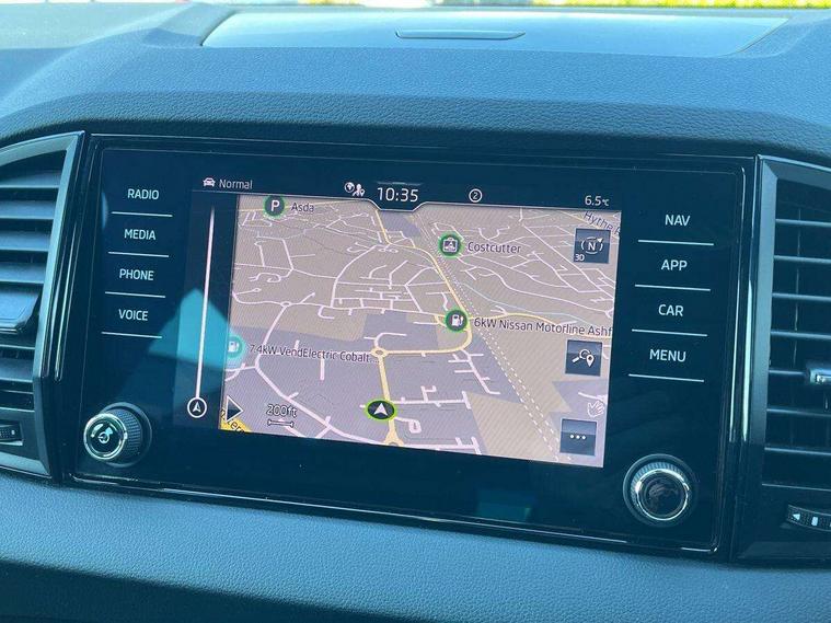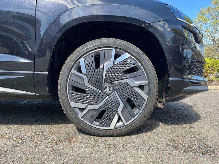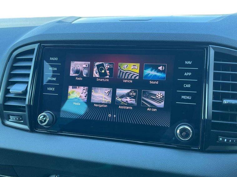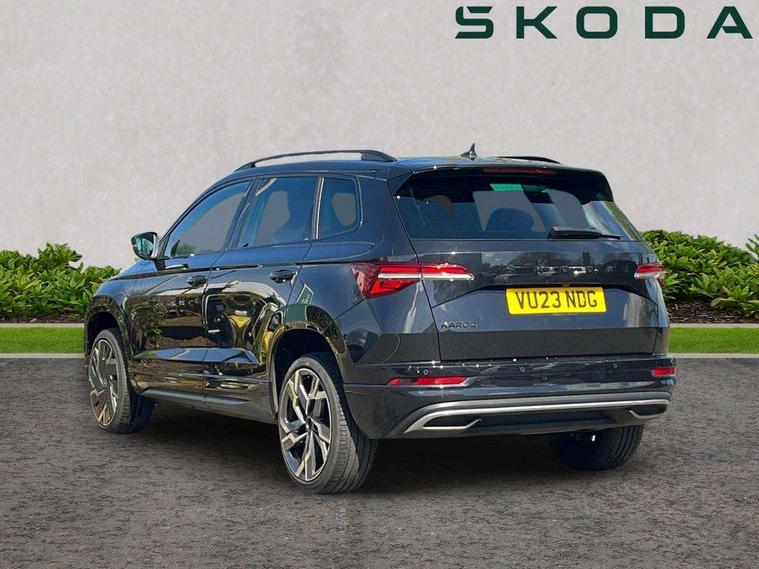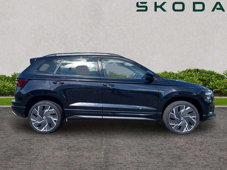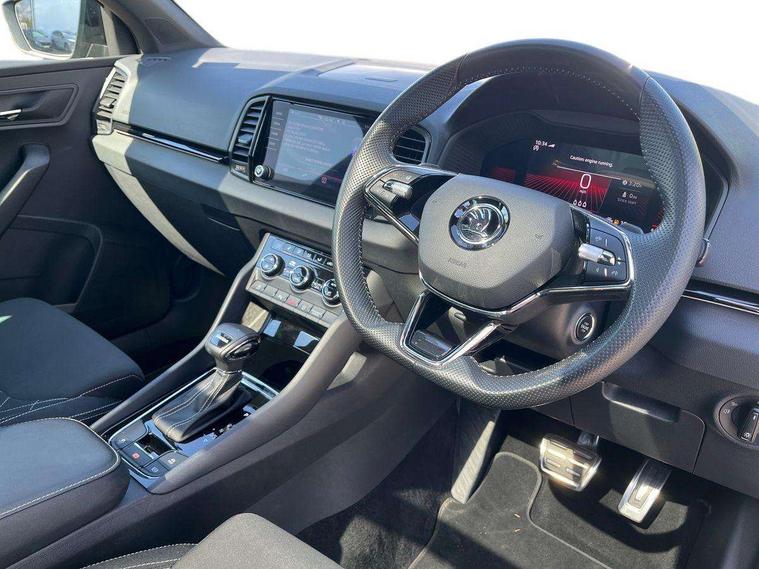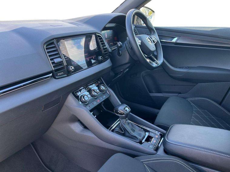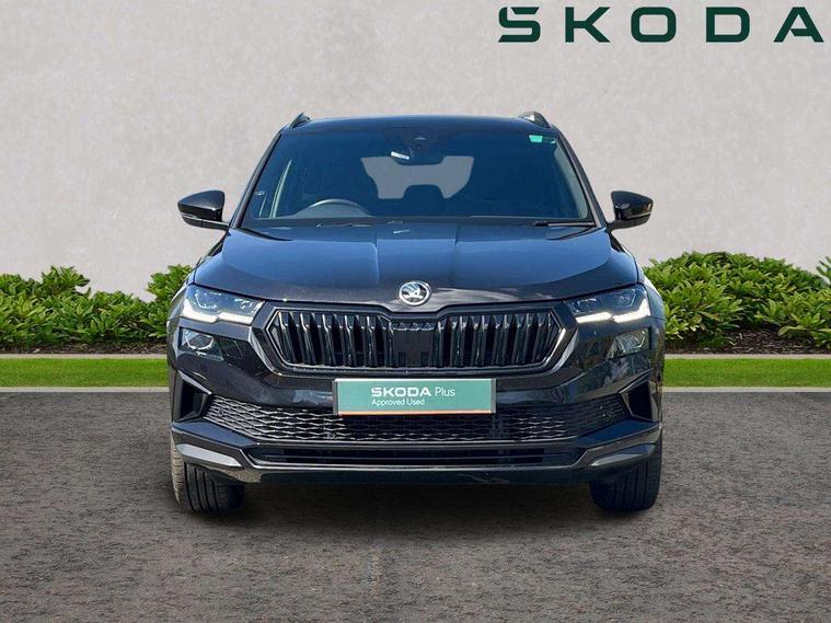 8" Digital display, Care connect, Driver fatigue sensor, Emergency services call system, Outside temperature gauge, Service interval indicator, SmartLink wireless for Apple and wired for Android, Start/stop system with regenerative braking, USB C Port x 2 in front centre console, Virtual cockpit, Virtual pedal with electrically operated boot door, 8 Speakers, DAB radio with Bluetooth, USB connection, Acoustic glass, Aero front windscreen wipers with intermittent function, Auto dimming rear view mirror with light and rain sensors, Black door mirrors, Black electric window control buttons, Black radiator grille, Black roof rails, Body colour door handles, Dynamic headlight range control with cornering light function, Electric front and rear windows with child proof lock, Front door steps with SportLine logo, Heated rear windscreen, LED daytime running lights, LED rear lights with high functionality welcome effect and dynamic indicators, Light assistant (coming/leaving home/tunnel light), Panoramic sliding sunroof, Plastic scuff plates, Privacy glass, Protective door side sills in body colour, Rear diffuser, Rear side wing doors, Rear spoiler, Rear window wiper with washer system and intermittent control, Safety reflectors on front doors, Skoda lettering on tailgate in black, Sportline badge on front fender, Sportline decorative inserts with badging, Sports front and rear bumpers, 1.5 litre bottle holders in driver and front passenger door panels, 12V socket in boot, 12v socket in front centre armrest with storage compartment and rear air vents, 2 Folding hooks and nets in boot, 3 rear height adjustable headrests, 3 seat bench in 2nd row, 3 spoke leather sports multifunction steering wheel and silver stitching with gear shift paddles, 4 foldable roof handles with rear coat hooks, Black floor carpet, Black roof headlining, Chrome inner door handles, Double sided boot floor, Foldable hooks in the boot, Front head restraints, Height adjustable front three point seats belts with tensioners, Height/reach adjust steering wheel, Ice scraper, Illuminated glovebox, Illuminated luggage compartment, Isofix child seat preparation outer rear, Manual lumbar support for front seats, Pen holder, Pollen filter, Rear boot cover, Rear reading lights, Rear seats fixed folding and divided 60:40, Rubbish bin door, Safety vest holder, Single front passenger seat, Storage box in upper central dashboard closed, Sunvisors with illuminated vanity mirrors, Textile floor mats, Ticket holder, Titan black interior ceiling, Welcome animation with sportline logo, Light Pack - Karoq, Parking pack - Karoq, Automatic door unlocking in case of crash, Automatic fuel cut off in case of crash, Child locks on rear doors, Driver airbag, Electronic parking brake with auto hold function, Emergency rear braking signal, ESC including ABS, MSR, ASR, EDS, HBA, DSR, RBS, MKB and traction control, Front side airbags, Hill hold control, Knee airbags, Passenger airbag with switch-off function, Pedestrian monitor, Seatbelt reminder signalisation and pretensioner for all seats, Three point seatbelts rear, Two tone horn, Tyre pressure display, Tyre pressure monitor, Alarm with interior monitoring, back up horn and tilt sensor with safe function, Electronic engine immobiliser, Keyless entry and start/stop, Remote central locking with 2 remote folding keys, Black air vent surround, Black centre console, Satin black dashboard, Satin black door trim, 19" Vega black polished alloy wheels, Anti-theft wheel bolts protection, Matt black aero hub caps, Storage on wheel cover, Tool kit,