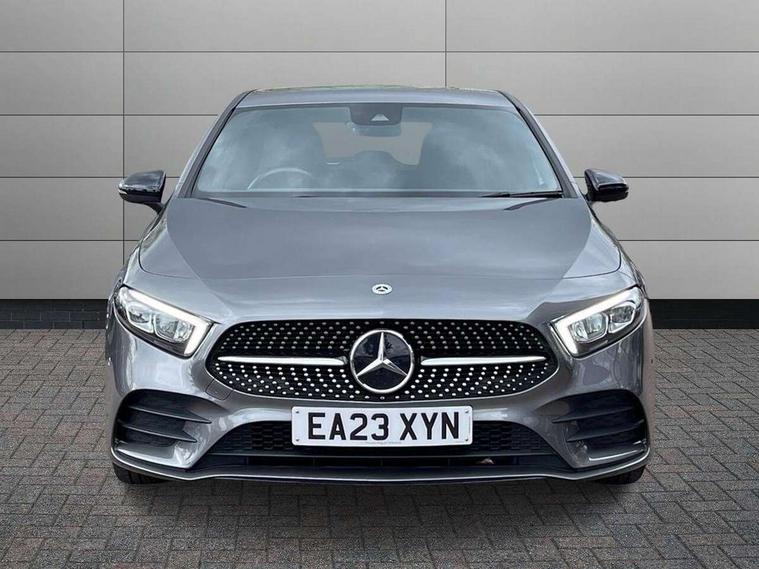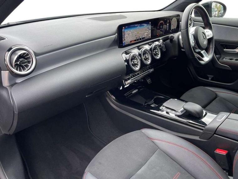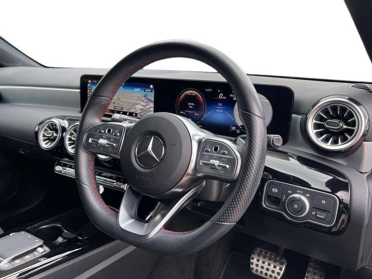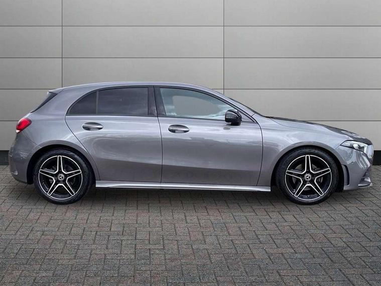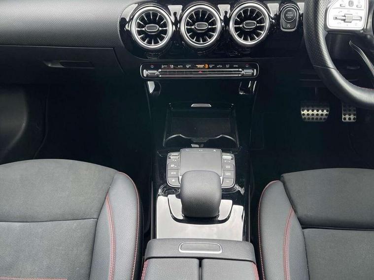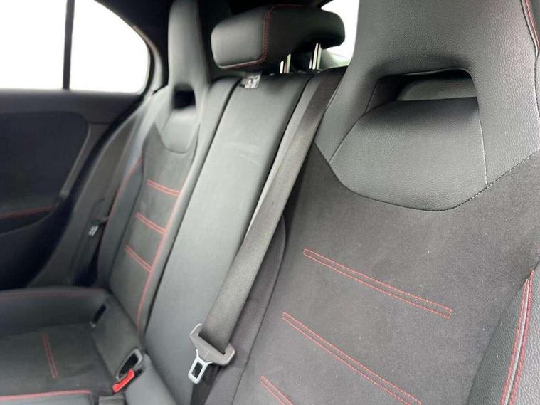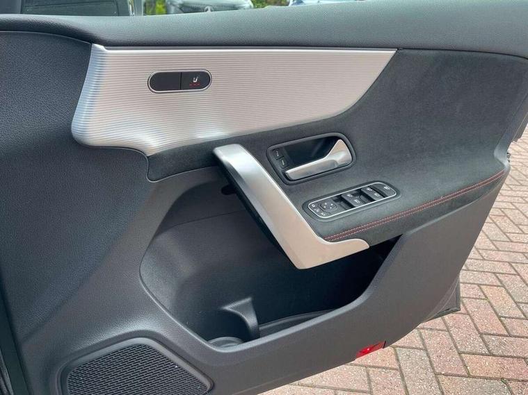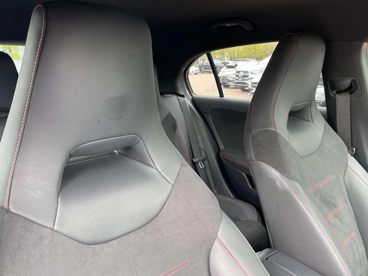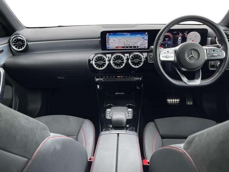 Ultrasonic sensors positioned in the front and rear bumpers, 10.25" Digital instrument cluster display screen, 10.25" media display, 180 degree rear view camera with parking guidelines, Active parking assist with visual and audible warning of detected obstacles, Attention assist, Brake pad wear indicator warning light, Car wash mode, Cruise control + speed limiter, Direct steering, Dual bluetooth interfaces, DYNAMIC SELECT with a choice of driving modes (ECO, Comfort, Sport and Individual), ECO start/stop function, Fluid level warning indicator for fuel, oil, coolant and washer fluid, Hard-disk navigation, Hey Mercedes Voice activation, Lamp failure indicator, Lane keeping system, Mercedes me connect including emergency call system, accident recovery, breakdown management and maintenance, Mercedes me remote services, Outside temperature gauge, Owners manual in English, Pre-installation for car sharing, Preinstallation for Mercedes Benz link, Service indicator (ASSYST), Smartphone integration with Apple CarPlay and Android auto, Speed limit assist, Speed sensitive power steering, Trip computer, Lowered comfort suspension, Rear axle torsion beam, 2 USB ports (type C) in rear stowage compartment and one in front of center console, 6 speakers, DAB Digital radio, MBUX multimedia system with DAB digital radio and touchpad including satellite navigation, Mercedes-Benz sound system - 100W, 4 Electric Front and Rear windows, Adaptive brake lights, AMG bodystyling - Front apron with splitter in chrome, rear apron with chrome trim and chrome visible trim elements in tailpipe, Automatic headlights, Black weather strip, Body colour bumpers, Body colour door handles with chrome inserts, Body colour side skirt, Electric adjustable and heated door mirrors with integrated LED side indicators, Exclusive diamond radiator grille, Exhaust system - Twin visible tailpipes in polished stainless steel, Headlamp assist automatic headlamp activation, Heated glass rear windscreen + timer control, LED High level third brake light, LED high performance headlamps with integrated LED daytime running lights, LED tail lamp, Privacy glass, Radio aerial, Rain sensing windscreen wipers with two sensitivity settings, Rear fog lights, Rear side wing doors, Rear wiper, 3 seat bench in 2nd row, 3 Spoke flat bottom leather multi function steering wheel with perforated leather in grip area, 40:20:40 split folding rear seats, Artico man-made leather/Microfibre Dinamica upholstery with red contrast stitching, Auto Mercedes-Benz child seat recognition sensor, Black air vents with surround in silver chrome, Black roof lining, Brushed stainless steel sports pedals with rubber studs, Controller on centre console with chrome surround, Floor mats with AMG lettering, Front centre armrest with storage compartment, Front seat backs luggage nets, Galvanished gear shift paddles on steering wheel, Heated front seats, Height/reach adjustable steering column, Illuminated Mercedes Benz lettering front door sills with changeable cover, Interior lighting - 64 colour Ambient lighting, Interior mirror with reading lamps in black and frameless, ISOFIX and top tether child seat fixing points in two outer rear seats, Manual height adjustable front seats, Rear head restraints, Seat occupancy sensor for front passenger seat, Single front passenger seat, Sports seats with integrated headrests, Stowage compartment in centre console with retractable cover, Sunvisors with illuminated vanity mirrors, Touchpad on center console, Twin front cupholders, Two zone thermotronic luxury automatic climate control, Light and sight pack - A Class, Mirror package - A Class, Night pack - A Class Saloon/Hatchback, Seat comfort pack - A Class, 3 rear 3 point seatbelts, ABS with Brake Assist, Active bonnet, Active brake assist includes forward collision warning system with autonomous braking, Adaptive brake assist with hold function and hill start assist, Black seatbelts, Childproof locks manually operated for rear doors and electrically operated for rear power windows, Crash responsive emergency lighting, Driver and passenger head and side airbags, Drivers knee airbag, Dual stage driver/passenger airbags, Electronic parking brake, ESP curve dynamic assist, ESP with ASR, Front and rear seatbelt reminder, Front brake callipers with Mercedes Benz lettering, Tyre pressure monitoring system, Warning triangle and first aid kit, Window airbags, Alarm system/interior protection/immobiliser, Keyless Go, Remote central locking and crash sensor with emergency opening function, Urban guard vehicle protection system with immobiliser and interior protection, Matrix look light longitudinal grain aluminium trim element, 18" AMG 5 twin spoke light alloy wheels aerodynamically optimised painted in black with highsheen finish, Summer tyres, Tirefit sealant kit,