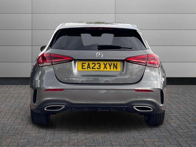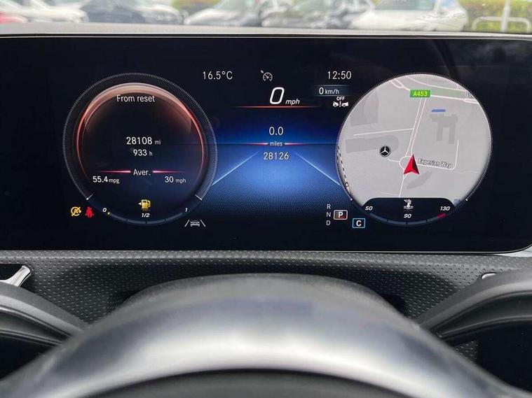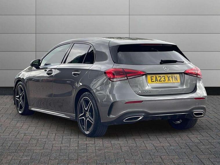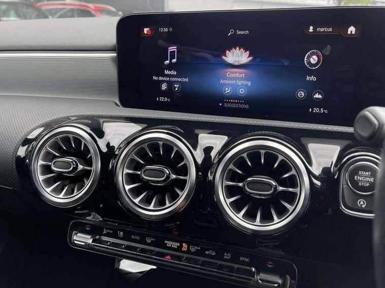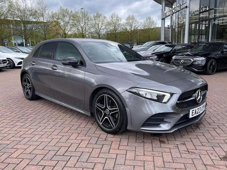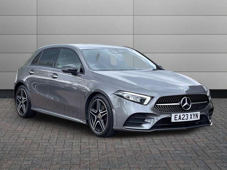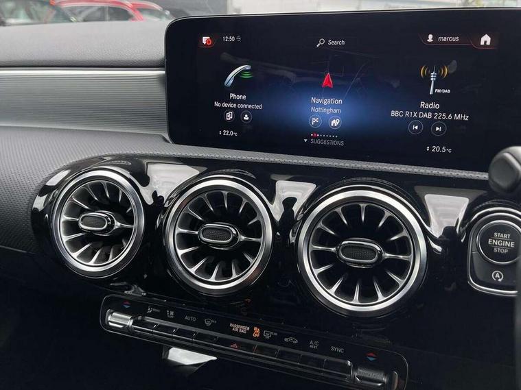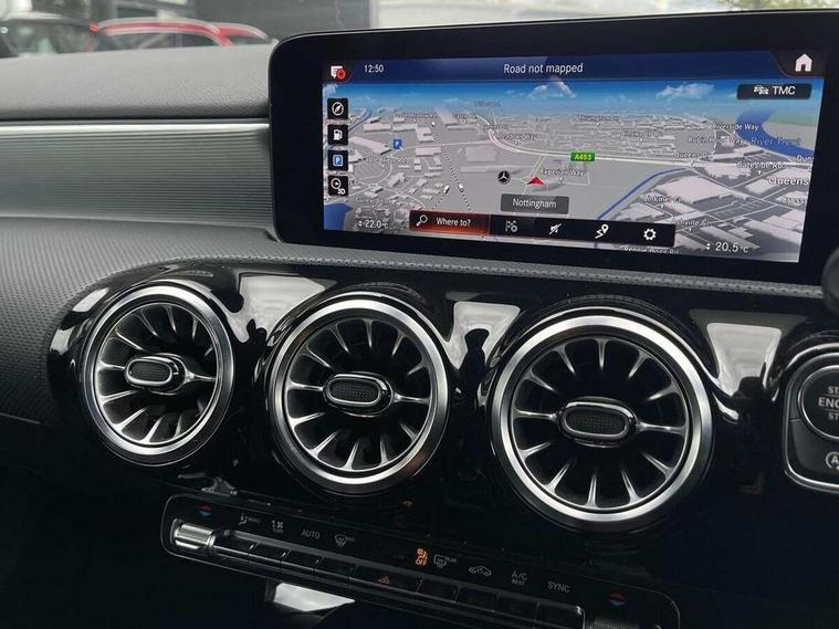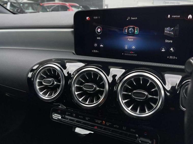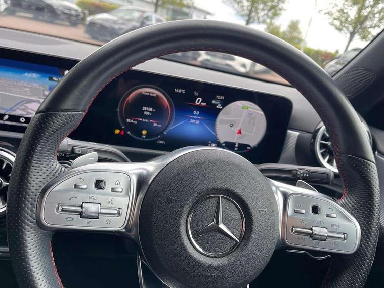 Ultrasonic sensors positioned in the front and rear bumpers, 10.25" Digital instrument cluster display screen, 10.25" media display, 180 degree rear view camera with parking guidelines, Active parking assist with visual and audible warning of detected obstacles, Attention assist, Brake pad wear indicator warning light, Car wash mode, Cruise control + speed limiter, Direct steering, Dual bluetooth interfaces, DYNAMIC SELECT with a choice of driving modes (ECO, Comfort, Sport and Individual), ECO start/stop function, Fluid level warning indicator for fuel, oil, coolant and washer fluid, Hard-disk navigation, Hey Mercedes Voice activation, Lamp failure indicator, Lane keeping system, Mercedes me connect including emergency call system, accident recovery, breakdown management and maintenance, Mercedes me remote services, Outside temperature gauge, Owners manual in English, Pre-installation for car sharing, Preinstallation for Mercedes Benz link, Service indicator (ASSYST), Smartphone integration with Apple CarPlay and Android auto, Speed limit assist, Speed sensitive power steering, Trip computer, Lowered comfort suspension, Rear axle torsion beam, 2 USB ports (type C) in rear stowage compartment and one in front of center console, 6 speakers, DAB Digital radio, MBUX multimedia system with DAB digital radio and touchpad including satellite navigation, Mercedes-Benz sound system - 100W, 4 Electric Front and Rear windows, Adaptive brake lights, AMG bodystyling - Front apron with splitter in chrome, rear apron with chrome trim and chrome visible trim elements in tailpipe, Automatic headlights, Black weather strip, Body colour bumpers, Body colour door handles with chrome inserts, Body colour side skirt, Electric adjustable and heated door mirrors with integrated LED side indicators, Exclusive diamond radiator grille, Exhaust system - Twin visible tailpipes in polished stainless steel, Headlamp assist automatic headlamp activation, Heated glass rear windscreen + timer control, LED High level third brake light, LED high performance headlamps with integrated LED daytime running lights, LED tail lamp, Privacy glass, Radio aerial, Rain sensing windscreen wipers with two sensitivity settings, Rear fog lights, Rear side wing doors, Rear wiper, 3 seat bench in 2nd row, 3 Spoke flat bottom leather multi function steering wheel with perforated leather in grip area, 40:20:40 split folding rear seats, Artico man-made leather/Microfibre Dinamica upholstery with red contrast stitching, Auto Mercedes-Benz child seat recognition sensor, Black air vents with surround in silver chrome, Black roof lining, Brushed stainless steel sports pedals with rubber studs, Controller on centre console with chrome surround, Floor mats with AMG lettering, Front centre armrest with storage compartment, Front seat backs luggage nets, Galvanished gear shift paddles on steering wheel, Heated front seats, Height/reach adjustable steering column, Illuminated Mercedes Benz lettering front door sills with changeable cover, Interior lighting - 64 colour Ambient lighting, Interior mirror with reading lamps in black and frameless, ISOFIX and top tether child seat fixing points in two outer rear seats, Manual height adjustable front seats, Rear head restraints, Seat occupancy sensor for front passenger seat, Single front passenger seat, Sports seats with integrated headrests, Stowage compartment in centre console with retractable cover, Sunvisors with illuminated vanity mirrors, Touchpad on center console, Twin front cupholders, Two zone thermotronic luxury automatic climate control, Light and sight pack - A Class, Mirror package - A Class, Night pack - A Class Saloon/Hatchback, Seat comfort pack - A Class, 3 rear 3 point seatbelts, ABS with Brake Assist, Active bonnet, Active brake assist includes forward collision warning system with autonomous braking, Adaptive brake assist with hold function and hill start assist, Black seatbelts, Childproof locks manually operated for rear doors and electrically operated for rear power windows, Crash responsive emergency lighting, Driver and passenger head and side airbags, Drivers knee airbag, Dual stage driver/passenger airbags, Electronic parking brake, ESP curve dynamic assist, ESP with ASR, Front and rear seatbelt reminder, Front brake callipers with Mercedes Benz lettering, Tyre pressure monitoring system, Warning triangle and first aid kit, Window airbags, Alarm system/interior protection/immobiliser, Keyless Go, Remote central locking and crash sensor with emergency opening function, Urban guard vehicle protection system with immobiliser and interior protection, Matrix look light longitudinal grain aluminium trim element, 18" AMG 5 twin spoke light alloy wheels aerodynamically optimised painted in black with highsheen finish, Summer tyres, Tirefit sealant kit,