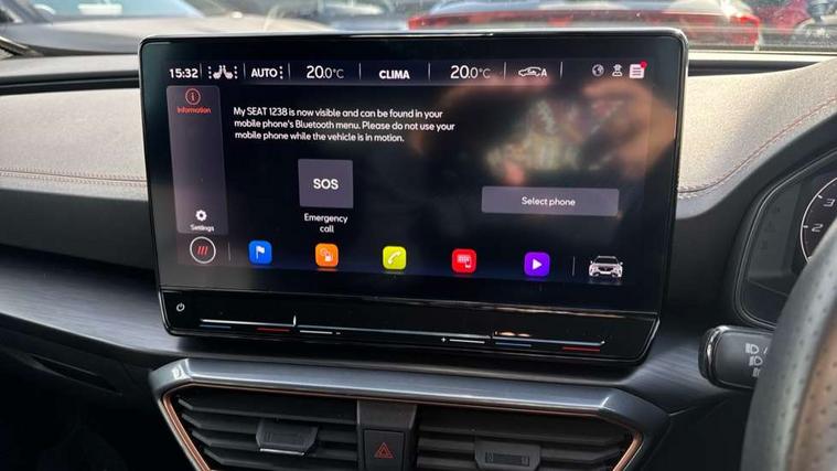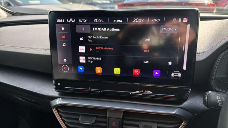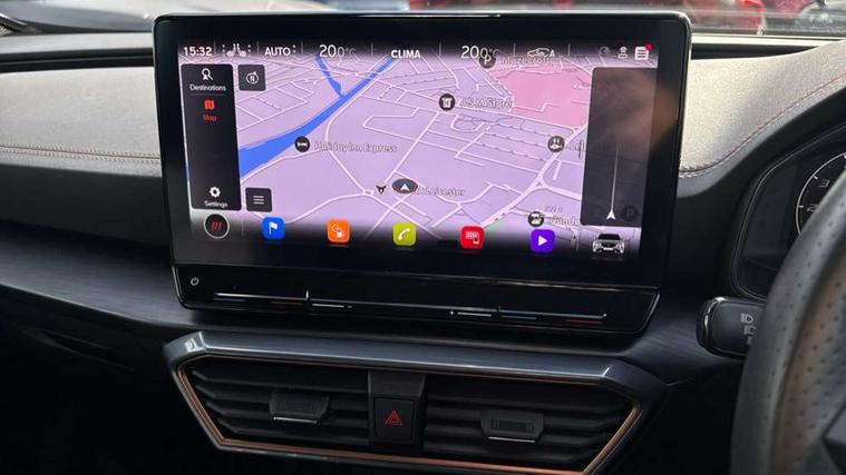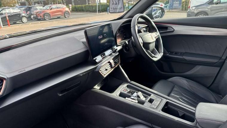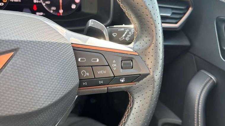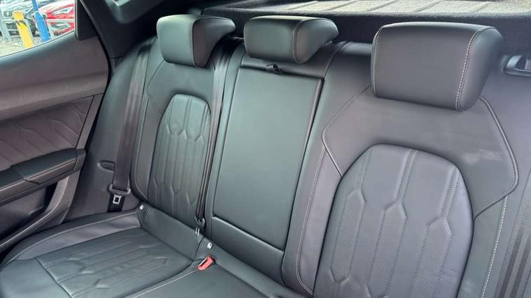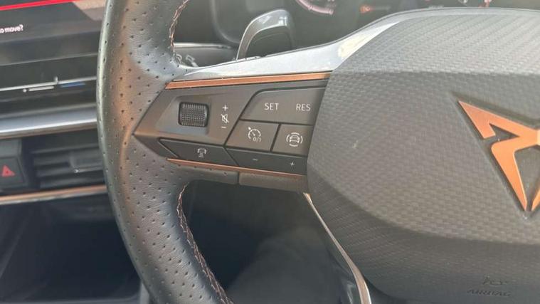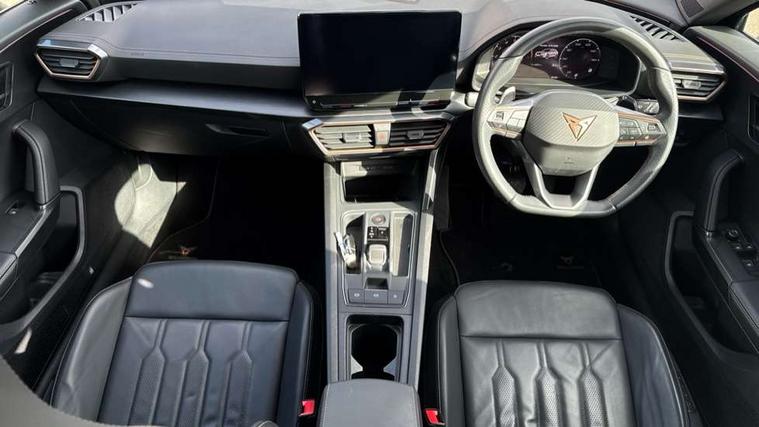 Digital cockpit and configurable dashboard, Driver alert system, Driving profile selection, Forward collision warning with automatic braking, Lane assist, Navigation system with 12'' Touchscreen Display, Park assist (inc front/rear parking sensors), PAS, Predictive adaptive cruise control with speed limiter, Rear view camera, RPM, trip computer, outside temp gauge, instrument light brightness, low fuel warning light, lights on reminder, gearshift indicator, Service interval indicator, Start/stop system with regenerative braking, Voice control system, Wireless apple carplay, Wireless phone charger, Electronic locking differential and dynamic traction support, Standard suspension, 2 front and 2 rear USB type C sockets, Auxiliary input socket, DAB radio, Auto dimming rear view mirror, Body colour door handles, Body coloured bumpers, Dark grey wing mirror, Daytime running light with automatic headlight control and coming home feature, Dynamic headlight range control, Electric front/rear windows, Electrically adjustable heated and folding door mirrors with memory function, Front fog lamps with cornering function, Gloss black roof rails and window surrounds, LED Headlights, LED Taillights with dynamic indicator, Rain sensing wipers, Rear diffuser with black simulated exhaust pipes, Rear side wing doors, Rear wash/wipe, Third brake light, Tinted rear windows, Welcome lights, 12v power supply in centre console, 12V socket, 12v socket in loadspace, 2 front and 2 rear reading lights, 230V socket, 3 seat bench in 2nd row, 60/40 split rear bench seat with armrest and mechanical seat release, Black headlining, Dust/pollen filter, Front and rear head restraints, Front centre armrest, Height/reach adjust steering wheel, Illuminated interior front door sills, Illuminated sunvisor with mirror, Isofix, Leather multi function heated steering wheel with gear shift paddles, Luggage tie-down hooks, Single front passenger seat, Three zone climate control with control panel in rear, Variable luggage/load compartment floor, Wraparound lighting, Genuine Nappa leather Pack - Cupra, 3 point seatbelts on all rear seats, ABS, Brake control system - ESC and brake booster, Child proof door locks, Driver and front passenger airbags with front passenger airbag de-activation, Electronic parking brake, Front and rear disc brakes, Front side curtain airbags, Hill hold control, Public e-call, Seat belt reminder for front and rear seats, Tyre pressure monitoring system, Anti theft alarm system, Keyless entry and start system (KESSY), Locking wheel bolts, Copper and aluminium interior detailing, 19" 'Exclusive' machined sport matte black and silver alloy wheels,