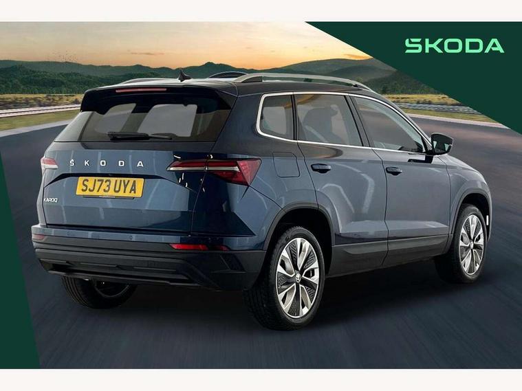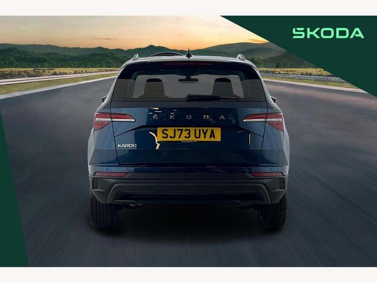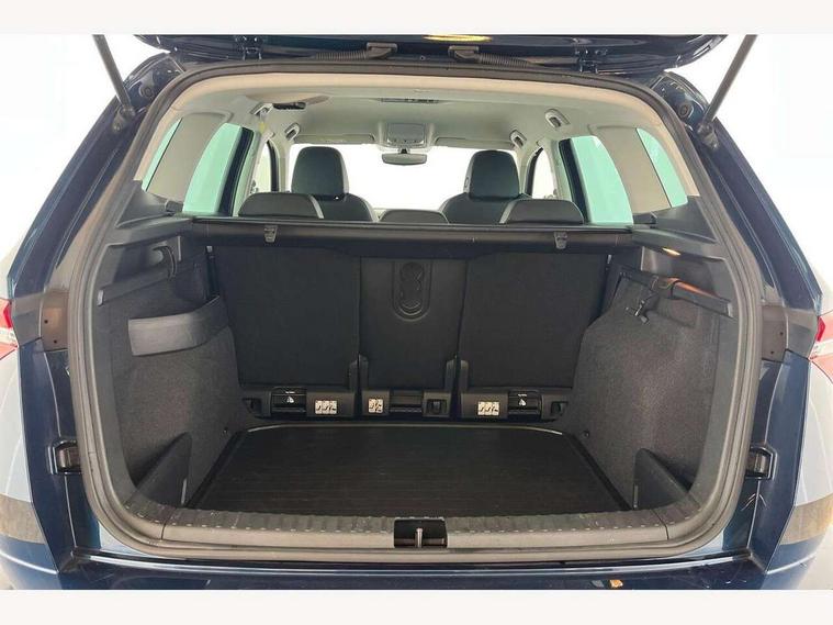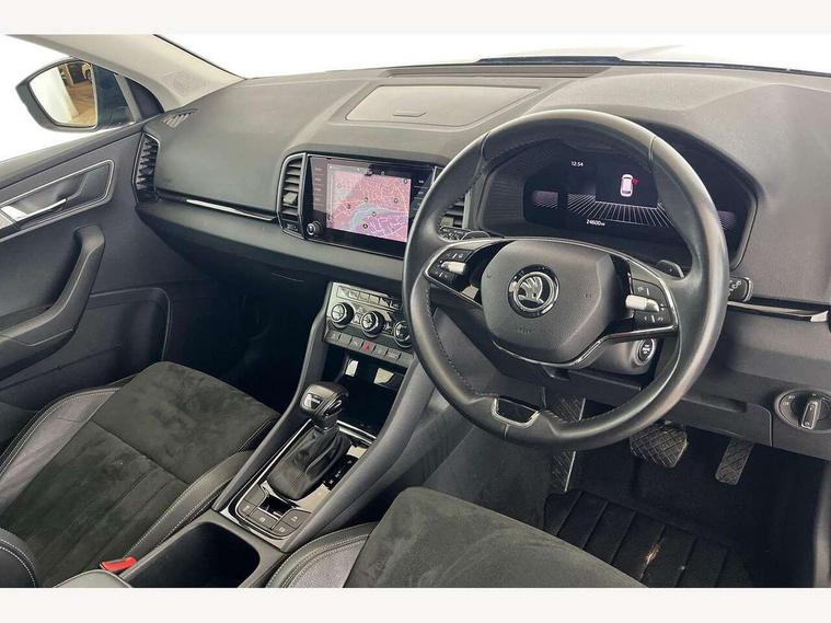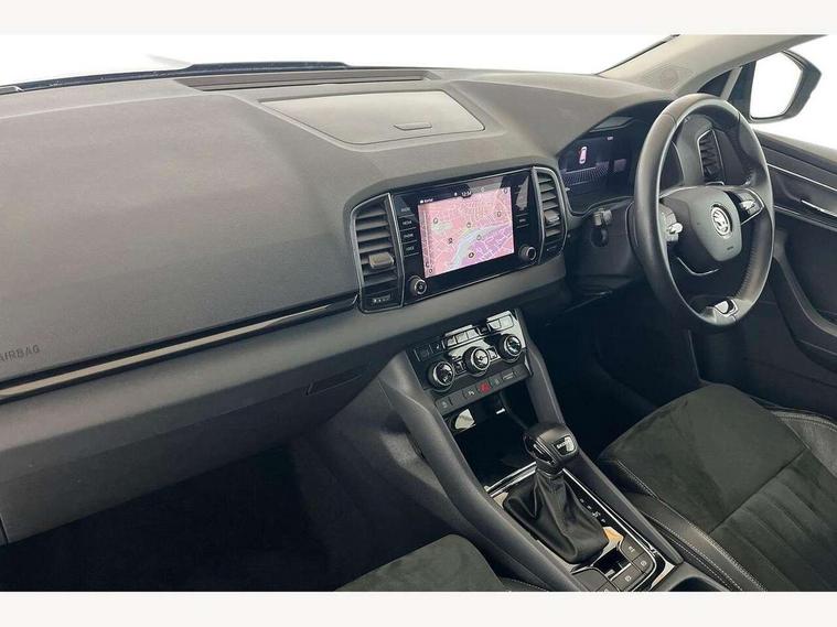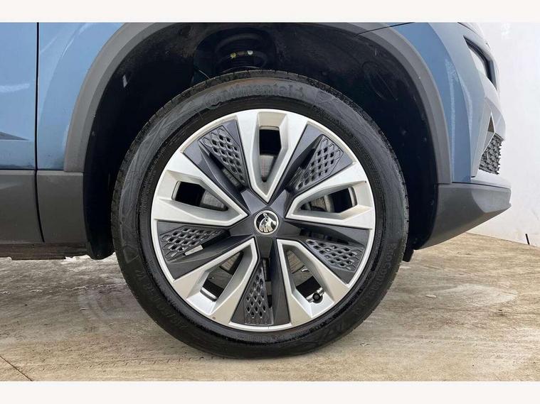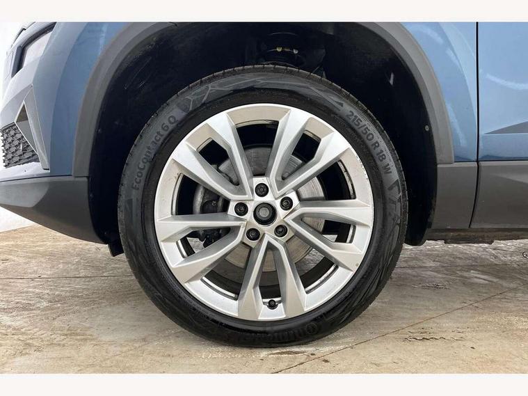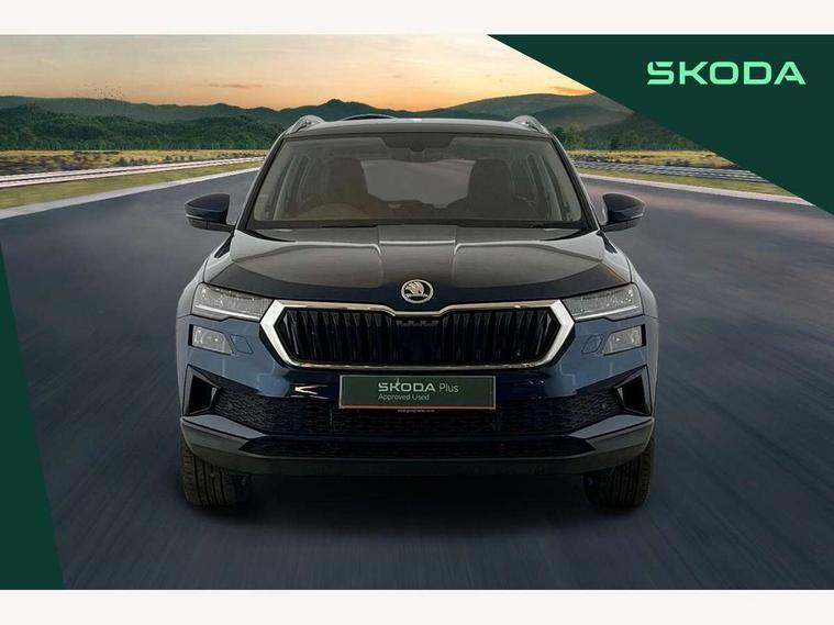 8" Digital display, Care connect, Driver fatigue sensor, Emergency services call system, Outside temperature gauge, Service interval indicator, SmartLink wireless for Apple and wired for Android, Start/stop system with regenerative braking, USB C Port x 2 in front centre console, 8 Speakers, DAB radio with Bluetooth, USB connection, Acoustic glass, Aero front windscreen wipers with intermittent function, Auto dimming rear view mirror with light and rain sensors, Black electric window control buttons, Body colour door mirrors and handles, Dynamic headlight range control with cornering light function, Electric front and rear windows with child proof lock, Heated rear windscreen, LED daytime running lights, LED rear lights with high functionality welcome effect and dynamic indicators, Light assistant (coming/leaving home/tunnel light), Plastic scuff plates, Privacy glass, Rear side wing doors, Rear spoiler, Rear window wiper with washer system and intermittent control, Safety reflectors on front doors, 1.5 litre bottle holders in driver and front passenger door panels, 12V socket in boot, 12v socket in front centre armrest with storage compartment and rear air vents, 2 spoke leather heated multifunction steering wheel with DSG paddles, 2 x Tablet holder, 3 rear height adjustable headrests, 3 seat bench in 2nd row, 4 foldable roof handles with rear coat hooks, Black floor carpet, Chrome inner door handles, Decorative door sills with KAROQ badging, Double sided boot floor, Foldable hooks in the boot, Front head restraints, Height adjustable front three point seats belts with tensioners, Height/reach adjust steering wheel, Ice scraper, Illuminated glovebox, Illuminated luggage compartment, Isofix child seat preparation for front passenger seat, Isofix child seat preparation outer rear, Manual lumbar support for front seats, Pen holder, Pollen filter, Rear boot cover, Rear reading lights, Rubbish bin door, Safety vest holder, Single front passenger seat, Storage box in upper central dashboard closed, Sunvisors with illuminated vanity mirrors, Textile floor mats, Ticket holder, VarioFlex seats with standard rear seat release, Boot pack - Karoq, Chrome roof rails + chrome pack - Karoq, Parking pack - Karoq, Automatic door unlocking in case of crash, Automatic fuel cut off in case of crash, Child locks on rear doors, Driver airbag, Electronic parking brake with auto hold function, Emergency rear braking signal, ESC including ABS, MSR, ASR, EDS, HBA, DSR, RBS, MKB and traction control, Front side airbags, Hill hold control, Knee airbags, Passenger airbag with switch-off function, Pedestrian monitor, Seatbelt reminder signalisation and pretensioner for all seats, Three point seatbelts rear, Two tone horn, Tyre pressure display, Tyre pressure monitor, Alarm with interior monitoring, back up horn and tilt sensor with safe function, Electronic engine immobiliser, Keyless entry and start/stop, Remote central locking with 2 remote folding keys, Chrome framed air vents, 18" Miran alloy wheels in black, Anti-theft wheel bolts protection, Storage on wheel cover, Tool kit,