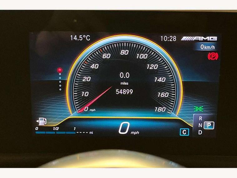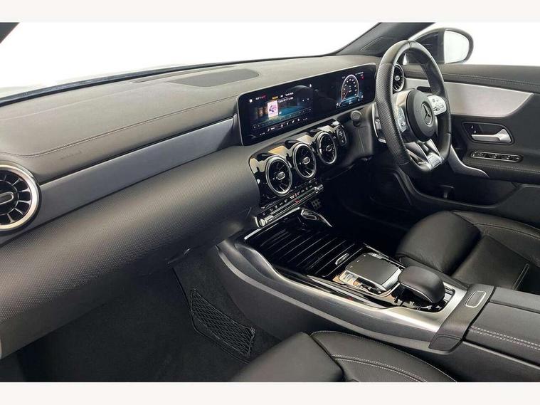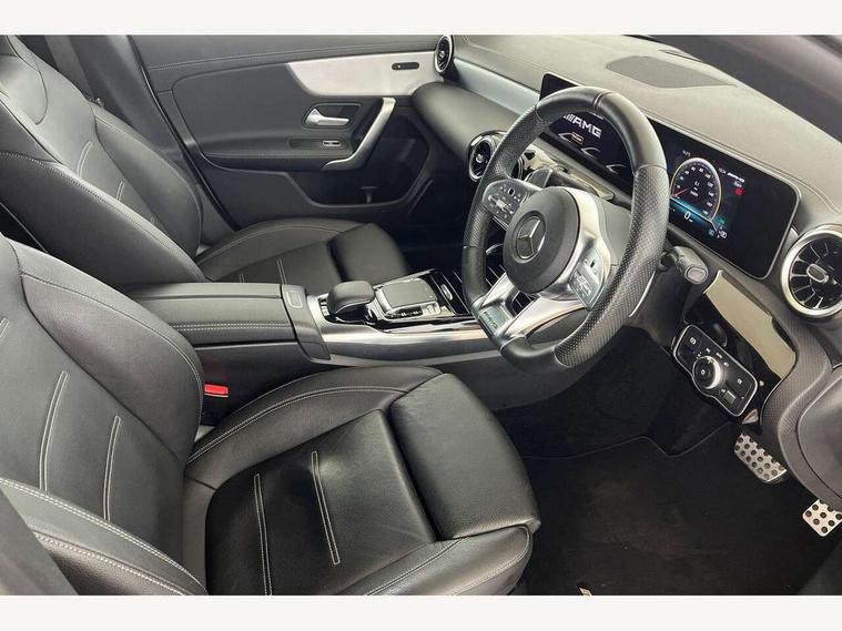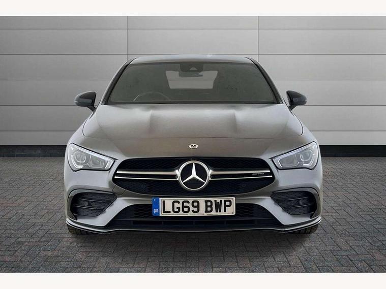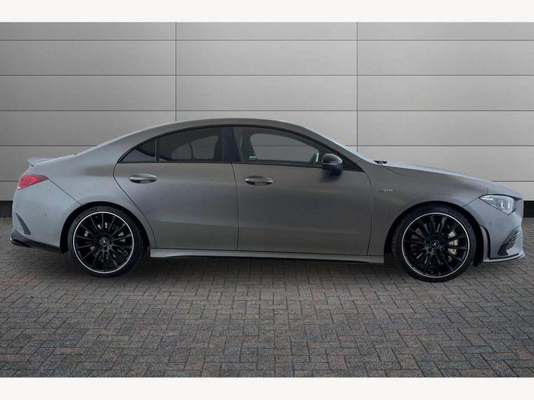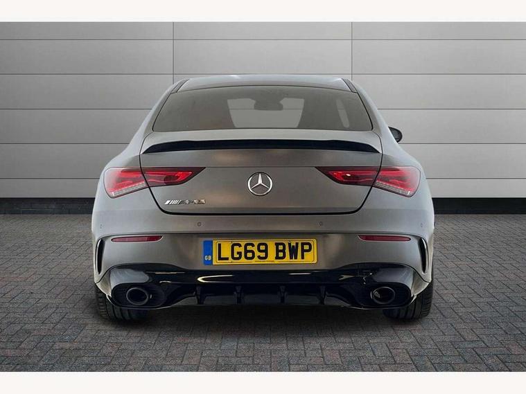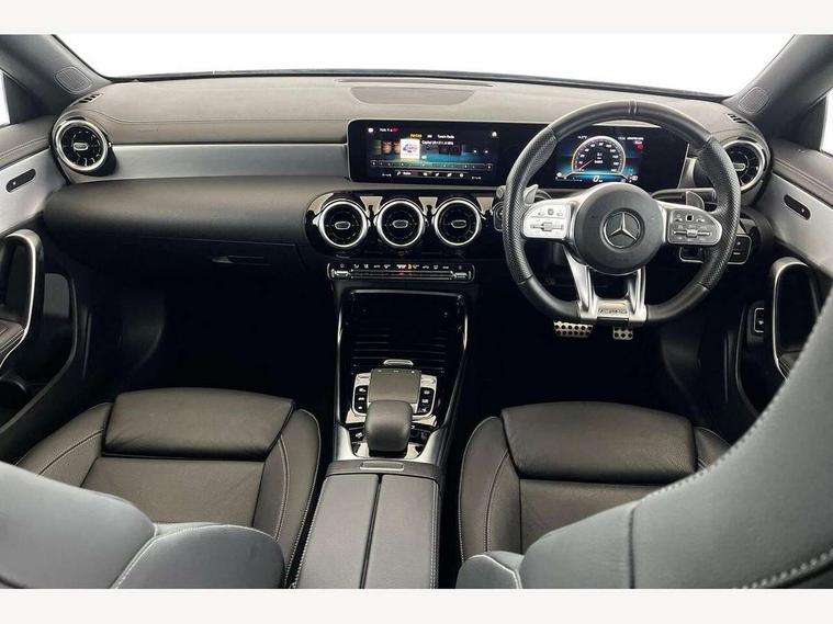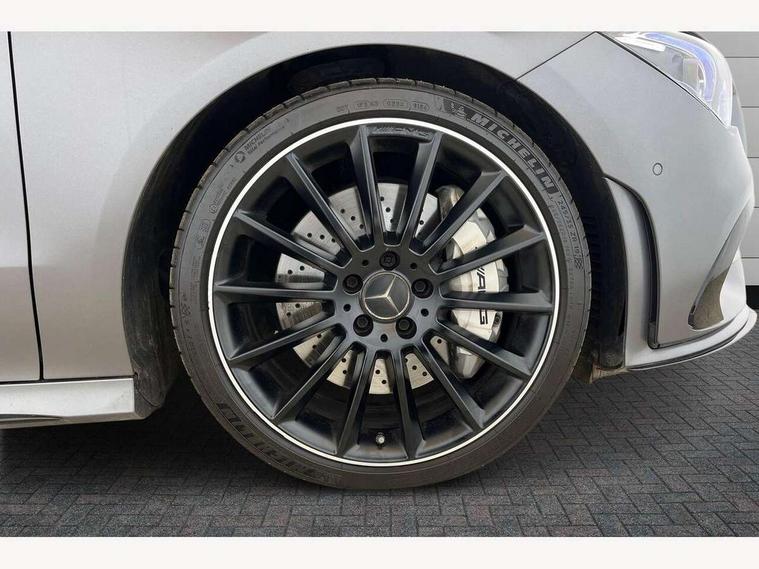 10.25 inch touchscreen central media display, 7 inch display in instrument panel, Active lane keeping assist, Attention assist - Monitors steering behaviour and long journey fatigue, Cruise control with limiter, Digital instrument cluster with three AMG display styles and AMG menu, Direct steer system with speed sensitive power steering, Dual bluetooth interfaces, DYNAMIC SELECT with driving programs (Slippery, Comfort, Sport, Sport+ and Individual), Fluid level warning indicator for fuel, oil, coolant and washer fluid, Hard-disk navigation, Hey Mercedes Voice activation, Lamp failure indicator, Mercedes connect me, Outside temperature gauge, Pre-installation for private car sharing, Preinstallation for Mercedes Benz link, Radio aerial integrated into front and rear windshields, Service indicator (ASSYST), Smartphone integration with Apple CarPlay and Android auto, Speed limit assist, Trip computer in multifunction display with current consumption indicator, Wireless charging, 7G-DCT 7 speed automatic transmission, Rear axle multi-link, DAB digital radio tuner, MBUX multimedia system with DAB digital radio and touchpad including satellite navigation, USB (type C) port in front stowage compartment, USB (type C) ports (2) in stowage compartment, Active radiator shutters open for cooling air and close when not needed to improve aerodynamics and fuel efficiency, Adaptive brake lights, AMG radiator grille with twin blade lamella, AMG Sports exhaust system with two round tailpipes measuring 90 mm in diameter attached in rear apron, AMG lettering plus ribbing on the inside of the, Beltline strips and weather strip in chrome, Body colour bodystyling side skirt, Body colour bumpers, Body colour door handles with chrome inserts, Electric windows, Electrically adjustable and heated door mirrors with integrated LED indicators, Headlamp assist automatic headlamp activation, Heated glass rear windscreen + timer control, High level LED third brake light, LED high performance headlamps with integrated LED daytime running lights, LED tail lamp, Rain sensing windscreen wipers with two sensitivity settings, Rear fog lamp, 40:20:40 split folding rear seat backrests, Air condition air vents with surround in silver chrome, Air conditioning - Two zone thermotronic luxury automatic climate control with display, Ambient lamp and signal, AMG Performance steering wheel in nappa leather, Automatic child seat recognition sensor, Black roof lining, Brushed stainless steel sports pedals with rubber studs, Cup holder and stowage compartment lighting, Floor mats with stitched AMG lettering, Freight packaging with tie-down hooks, Front and rear Handle recess/closing handle light in left and right, Front centre armrest with stowage, Front door sills with Mercedes Benz lettering, Front footwell lights, Front reading lamps in left and right console downlighter, Front seat cushion length adjustment, Front signal exit lamp in left and right, Front vanity light in left and right, Heated front seats, Illuminated glove compartment stowage, Luggage net on driver/front passenger seat backrest, Manually adjustable front seats, Manually height and reach adjustable steering column, Oddments tray lighting, Rear interior lamp, Rear reading lamp in support plate in left and right, Silver coloured aluminium gear shift paddles on steering wheel, Spectacles compartment for driver, Sport seats with fixed head restraints, Stowage compartment in centre console with retractable cover, Sunvisors with illuminated vanity mirrors, Touchpad illumination, Touchpad on center console, Twin front cupholders, Two outer rear seat isofix and top tether child seat fixing points, Light and sight pack - CLA, Mirror pack - CLA, Parking package - CLA, Seat comfort pack - CLA, Active bonnet pedestrain safety measure which detects an impact and raises bonnet by 65mm, Active brake assist includes forward collision warning system with autonomous braking, Adaptive brake assist with hold function and hill start assist, Anti-lock braking system (ABS), Brake pad wear warning indicator, Childproof locks manually operated for rear doors and electrically operated for rear power windows, Crash responsive emergency lighting, Driver and front passenger head and sidebags, Driver and front passenger windowbags, Drivers knee airbag, Dual stage driver and front passenger airbags, Electric parking brake, Electronic stability programme with acceleration skid control, ESP curve dynamic assist, Front and rear seatbelt reminder, Front brake calipers with AMG lettering, Front passenger seat occupancy sensor, Perforated front brake discs, Three point rear seat belts, Tyre pressure monitoring system, Warning triangle and first aid kit, Alarm system with immobiliser and interior protection -Thatcham category 1, Keyless Go starting function, Remote central locking and crash sensor with emergency opening function, Light aluminium with longitudinal grain interior trim, Summer tyres, Tirefit tyre sealant kit,