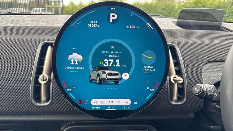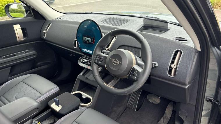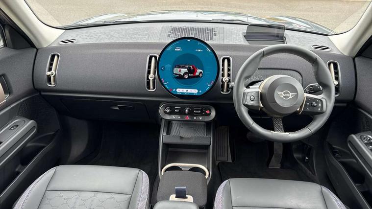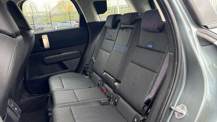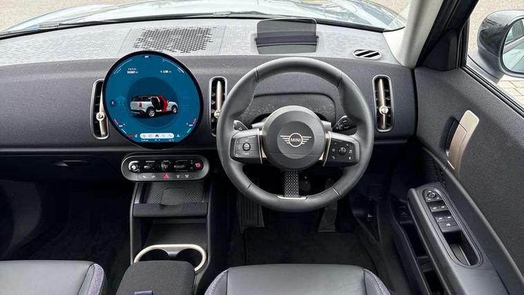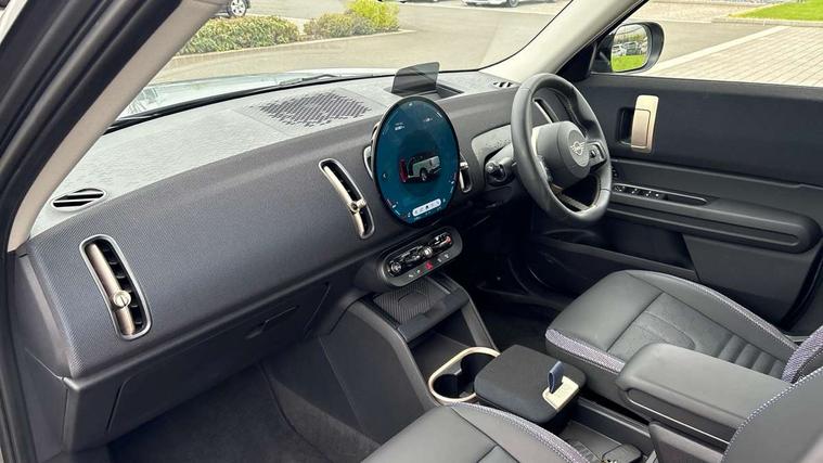 Bluetooth connection, Circular OLED Screen, Compatible mobile phone bluetooth with audio streaming, Cruise Control (DCC), Digital dashboard display, Driving assistant, E-call, Electro-mechanical speed dependant steering assistance, MINI Experience Modes, Mini navigation system, MINI TeleServices, Parking assistant in camera and ultrasound based assistance system, rear view camera, parking aid and distance control, Auto transmission with Paddles, Larger capacity fuel tank, 6 speakers, DAB Digital radio, Personal eSim, Auto tailgate, Electric adjustable heated door mirrors, Front and rear electric windows, Heated rear window, LED daytime running lights, LED Headlights, LED rear lights, LED third brake light, Rain sensor with auto headlights, Rear side wing doors, Rear window wiper, Roof rails, 3 seat bench in 2nd row, 60/40 split rear bench seat, Auto air conditioning, Floor mats, Front armrest, Front headrests, Heated steering wheel, Height and length steering column adjustment, Light headliner, Rear headrests, Single front passenger seat, Sport Vescin Steering Wheel, Sunvisors with vanity mirrors, Vescin/Cloth upholstery, 3x3 point rear seat belts, 6 Airbags - front, side, head and seat belt tensioners, ABS, DSC - Dynamic Stability Control, Electronic handbrake, Electronic Stability Programme (ESP), Front ISOFIX (iSize), Hill hold assist, Hill start assist, Manual rear child locks, Traction control, Tyre pressure monitoring system, Warning triangle, Alarm system with tilt sensor, monitoring doors, bonnet interior and tailgate, Auto drive away locking, Deadlocking function, Electronic vehicle immobiliser, Locking wheel bolts, Remote control locking, Start/stop toggle with keyless go, Black/Blue dashboard knit, MINI Mobility Kit,