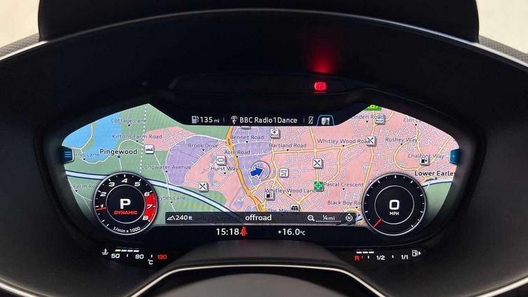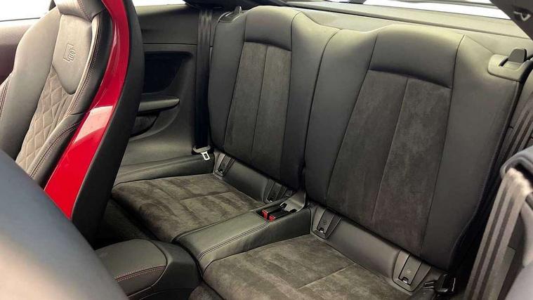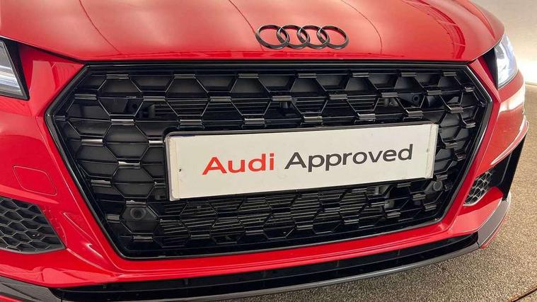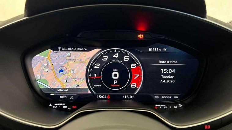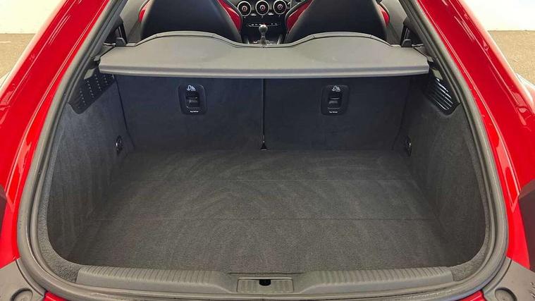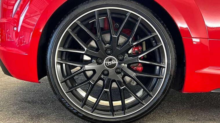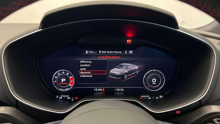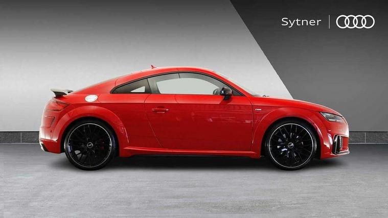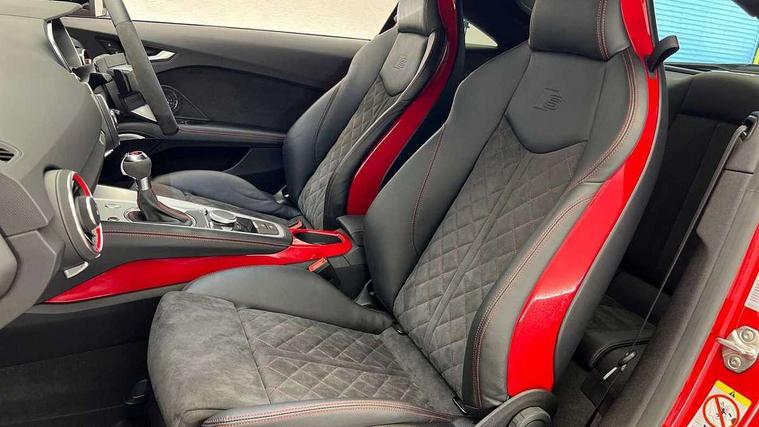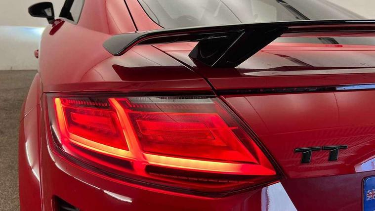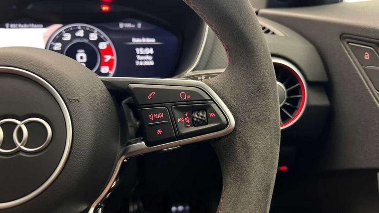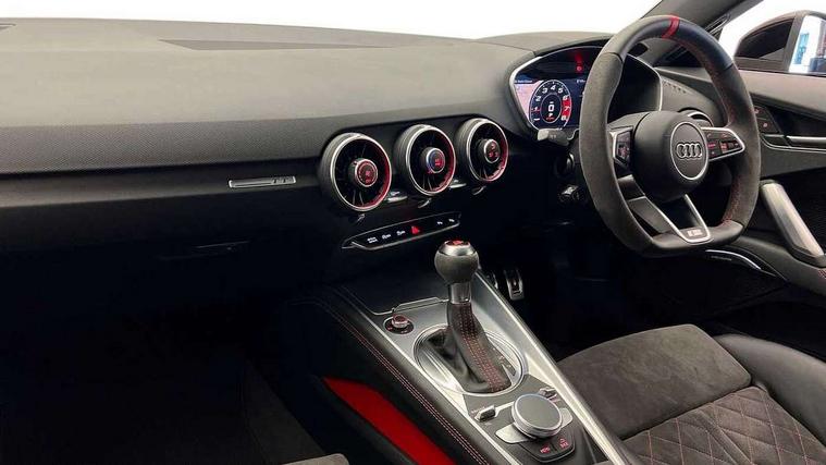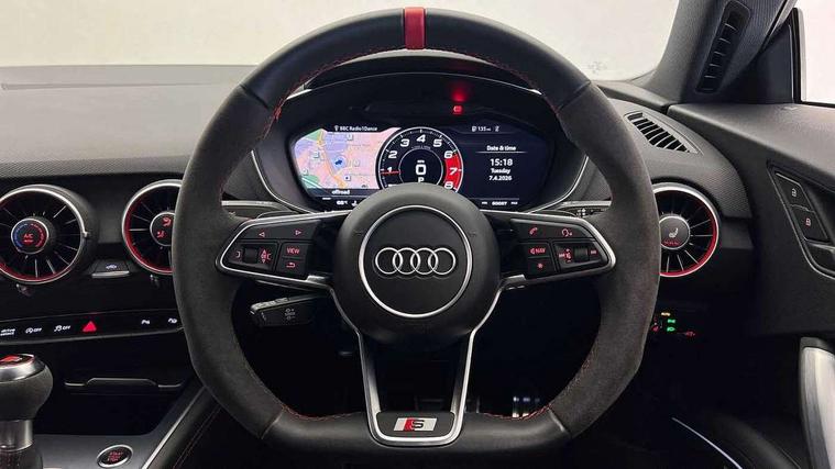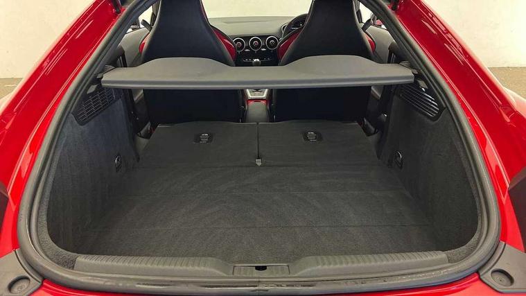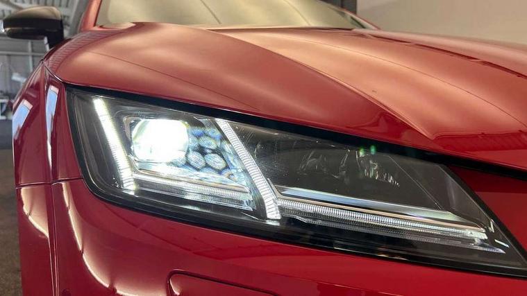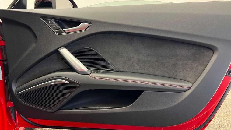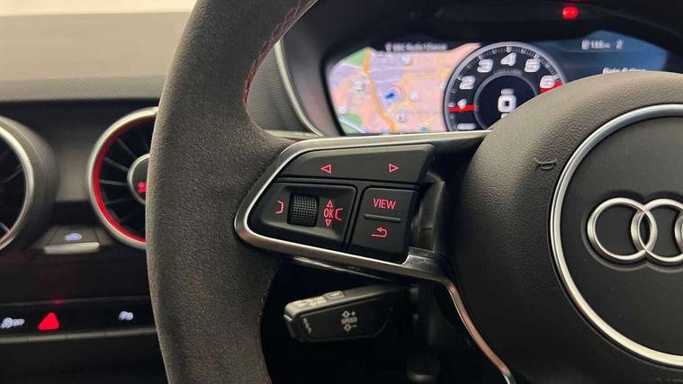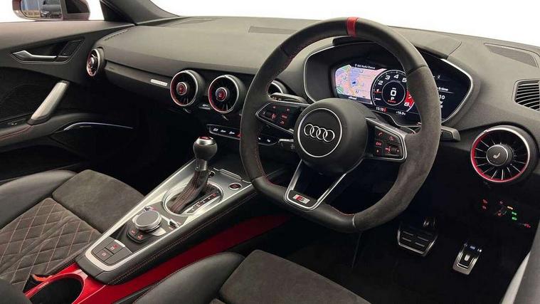 Audi drive select with 4 Pre configured modes, Audi smartphone interface, Audi virtual cockpit - 12.3" high-resolution LCD display with fully customisable instrument cluster, Cruise control + speed limiter, Emergency call service, Mobile phone preparation with bluetooth interface, Progressive power assisted steering, Rear parking sensors, Service interval indicator, Start/Stop system with energy recuperation, TP memo, Sports suspension, 8 Speakers, AM/FM radio, Bluetooth audio streaming, DAB Digital radio, Audi Beam uses LEDs to project the Audi Sport logo, Audi rings decals, Auto dimming rear view mirror, Auto headlight range control, Black chrome tailpipe, Black door mirrors, Dark privacy glass from B-pillar backwards, Electric folding door mirrors, Electric front windows, Electrically adjustable and heated door mirrors with integrated LED side indicators, Heat insulating glass in windshield, Heat reflecting windows, LED 3rd brake light, LED daytime running lights, LED headlights with LED rear lights + dynamic rear indicators, Light and rain sensors, Rear boot, 12V socket, 2 rear seats, 3 spoke flat bottomed high multi-function leather sport steering wheel with gearshift paddles, 4 way electric lumbar support for driver and front passenger, Alcantara leather with 12o'clock marker and express red contrast stitching in steering wheel, Alcantara/leather upholstery with S embossing + contrasting express red stitching on upholstery, Steering wheel and gear knob gaiter, Black headlining, Door sill trims, Extended aluminium look with stainless steel pedals, Front centre armrest, Front passenger seat, Front super sports seats, Heated front seats, Integrated head restraints, ISOFIX child seat mounting for front passenger seat with airbag deactivation, Manual adjustment of seat height, fore/aft position, seat angle, seat depth and backrest angle, Rear head restraints, Rear top tether child seat ISOFIX attachment, Red piped floor mats, Split folding rear seat, Black styling package - TT, Leather pack - TT, LED interior light pack - TT/TTS, Non smoking pack - TT/TT RS, Technology pack without Audi phone box - TT, 3 point front seat belts, ABS, ASR traction control, Curtain airbags, Driver and front passenger airbag with front passenger airbag deactivation, EDL traction control, Electromechanical parking brake, ESP, First aid kit, Front side airbags, Head airbags, Hill hold assist, Red brake callipers, Seatbelt warning, Tyre pressure loss indicator, Warning triangle, Anti theft alarm, Anti theft wheel bolts, Immobiliser, Keyless Go, Remote central locking, Matt brushed aluminium inlays, Tool kit, Tyre repair kit,