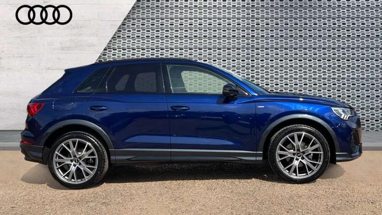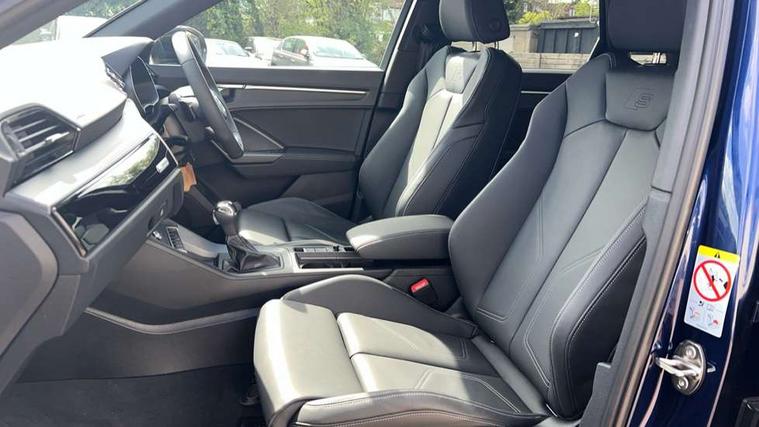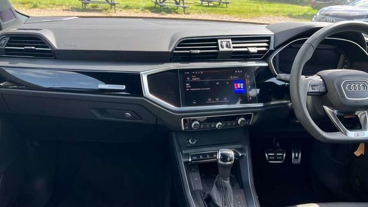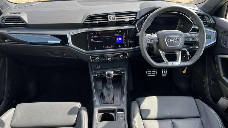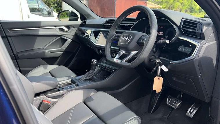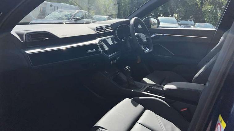 Amazon alexa Integration, Audi connect safety and service, Audi drive select, Audi lane departure warning, Audi Virtual Cockpit - 10.25" display, Bluetooth interface, Camera based traffic sign recognition, Distraction and Fatigue warning, Legal emergency call, MMI Navigation Plus with high resolution 10.1 inch touchscreen colour display, Power operated tailgate, Progressive steering, Service interval indicator, Smartphone interface includes wireless Apple carplay/Android Auto, Start stop system with recuperation, Voice control system with natural language interaction, Sports suspension, 2 USB-C ports with charge and data functions, 6 passive loudspeakers, DAB digital radio module, Acoustic windscreen, Anthracite black radiator grille, Audi Beam uses LEDs to project the Audi logo onto the ground as you exit your Q3, Auto dimming door mirrors, Auto dimming frameless rear view mirror, Black roof rails, Electrically folding, adjustable and heated door mirrors with integrated LED side indicators and kerb view function for passenger side, Front and rear electric windows, Front fog lights, Grille vertical bars in aluminium silver/Matt, High gloss black finish B and C pillars, LED Dynamic rear indicators, LED headlights with LED daytime running lights, LED rear lights, LED third brake light, Privacy glass dark tinted rear and rear-side windows (from B-pillar backwards), Rain and light sensors, Rear diffuser grille in grained matt black, Rear diffuser strip in matt anthracite black, Rear side wing doors, Rear wiper, S line bumpers in contrasting Manhattan grey, Variable front intermittent wipers, 12V socket in rear centre console, 3 seat bench in 2nd row, 40:20:40 folding with manual adjustment for 60:40 forwards/backwards position and backrest angle, Adjustable rear seat bench/backrest with centre armrest and cupholder, Black carpet mats, Black cloth headlining, Dual zone electronic climate control, Electric lumbar support, Front and rear black floor mats with contrast stitching in rock grey, Front and rear headrests, Front centre armrest, Height and reach adjustable steering wheel, Illuminated door sill trims with S logo, ISOFIX child seat mounting for front passenger with airbag deactivation and outer rear seat including top tether attachment point for outer rear seats, Luggage compartment sill protection in stainless steel, Manual front seats with height adjustment, Perforated leather gearknob, Single front passenger seat, Stainless steel pedals, Twin leather upholstery with front sport seats + S embossing, Black styling pack - Q3, Non smoking pack - Q3, 3x3 point rear seatbelts, 6 airbags - Driver, front passenger, curtain and side windows, Audi pre-sense front with pedestrain and cyclist recognition, Electrically operated child locks on rear doors, Electromechanical parking brake, Electronic stabilisation control including ABS, ASR and EDL, Front seatbelt reminder, Hill descent control, Hill hold assist, Pre sense basic, Seatbelt monitoring, Tyre pressure warning, Warning triangle and first aid kit, Anti theft wheel bolts, Immobiliser, Remote central locking, Thatcham approved category 1 anti theft alarm, Aluminium look interior elements, Detail dashboard around MMI touch colour display in glass look, black with surround in aluminium look, Leatherette door armrest, Piano black inlay,