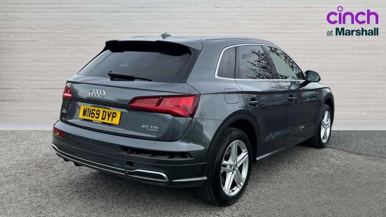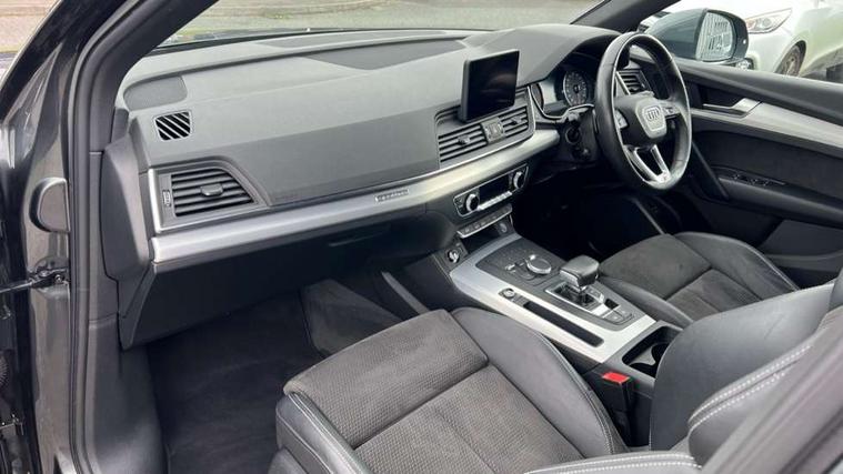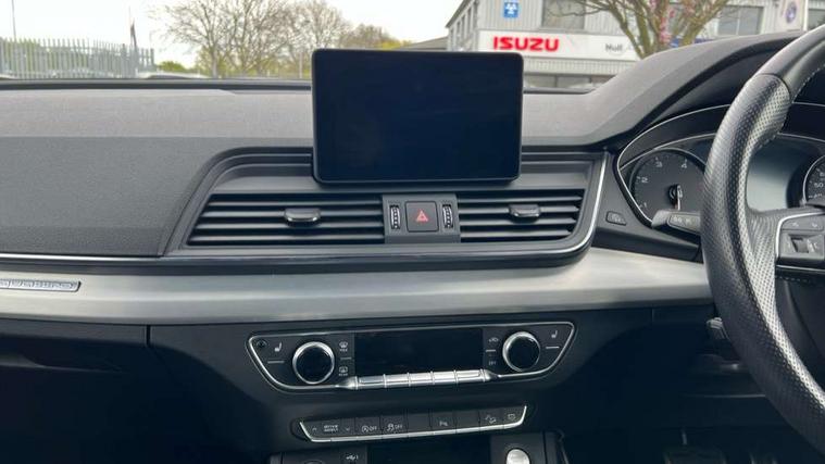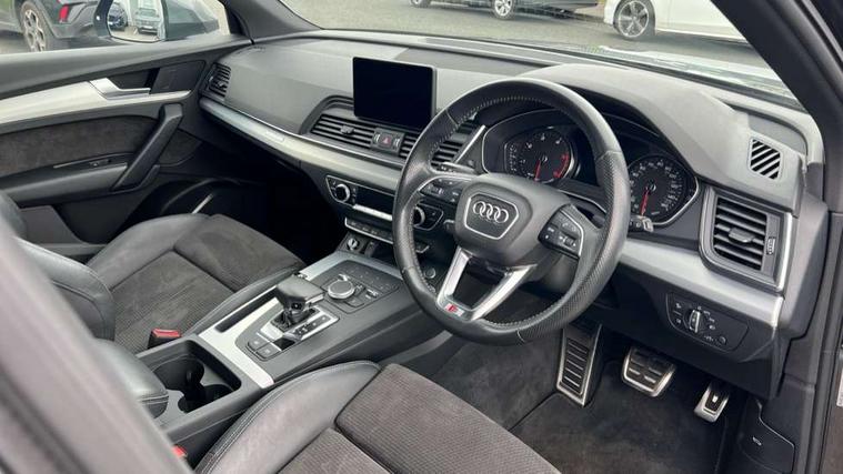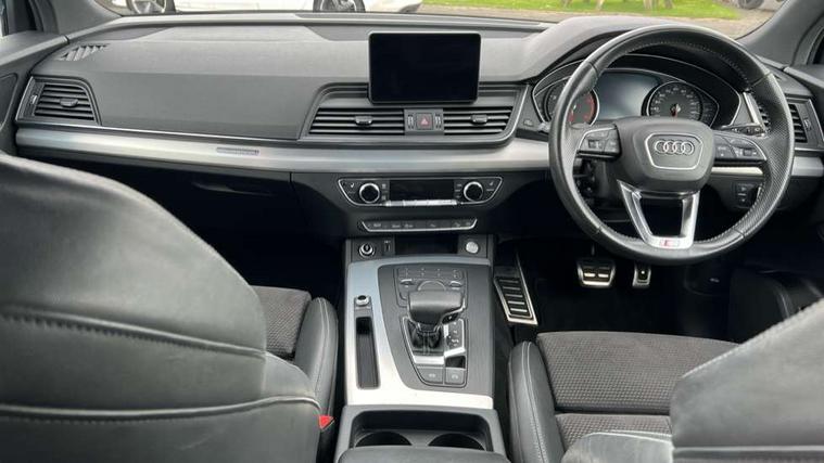 7" Colour driver information system, Audi connect safety and service (e-call), Audi drive select, Audi parking system plus with front and rear sensors, Audi Pre sense collision avoidance, Audi smartphone interface, Automatic start-stop system with coasting functionality and efficiency programme, Cruise control + speed limiter, Electro - mechanical power assisted steering, MMI Navigation, Mobile telephone preparation - bluetooth interface, Power tailgate, Service interval indicator, Voice control system, Diesel particulate filter, Dynamic suspension, Quattro on demand, 2 x USB charging port with aux input socket, 2x SD card slot, CD player, DAB Digital radio, MMI radio plus with 7" colour MMI screen and MMI controller, Acoustic windscreen, Air inlets in matt titanium black with blades in matt aluminium silver, Aluminium roof rails, Auto dimming rear view mirror, Automatic headlight levelling, Body colour bumpers, Body colour door mirrors, Body colour rear diffuser with matt aluminium silver surrounds, Body colour S Line side skirts, Body colour underbody protection, Chrome exhaust tailpipe, Electric adjustable/heated/folding door mirrors, Front and rear electric windows, High beam assistant, LED headlights with LED rear lights + dynamic rear indicators, Light and rain sensor for auto activation of lights and windscreen wipers, Loading sill protector in stainless steel, Privacy glass with front acoustic glazing, Rear wiper, S front and rear bumpers, S Line badges on the front wings, S Line rear spoiler, Twilight grey matt radiator grille with matt aluminium horizontal chrome struts, 3 rear headrests, 40:20:40 split folding rear seat with rear centre armrest, Black cloth headlining, Contrast stitching on seats, steering wheel and gear lever gaiter, Deluxe 3 zone electronic climate control, Front centre armrest, Front sport seats with S embossed logo, Front/rear floor mats, Heated front seats, Height adjustable front head restraints, Height/reach adjustable steering column, Illuminated door sill trims with S logo, ISOFIX child seat mounting and top tether, Luggage compartment carpet, Manual seat adjustment with 4-way electric lumbar support, Perforated leather gearknob, Removable luggage compartment floor, Stainless steel pedals, Sunvisors with vanity mirrors, Trunk roller cover, High gloss pack - Q5, LED interior light pack - Q5, Non Smokers pack, 3 point seatbelts on all seats, 6 airbags - Driver, front passenger, curtain and side airbags, Electromechanical parking brake, Electronic stabilisation control including ABS, ASR and EDL, Front passenger airbag deactivation, Hill descent control, Hill hold assist, Multi collision brake assist, Pop-up bonnet for pedestrian protection, Pre sense city, Seat belt force limiter, Seatbelt monitoring, Tyre pressure warning, Warning triangle and first aid kit, Anti theft alarm, Anti-theft wheel bolts, Keyless Go access/ignition system, Remote central locking, Matt brushed aluminium inlays, Tool kit,