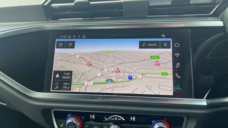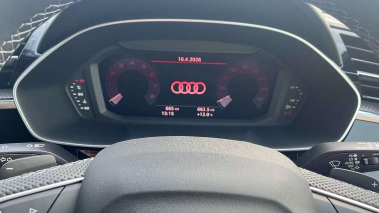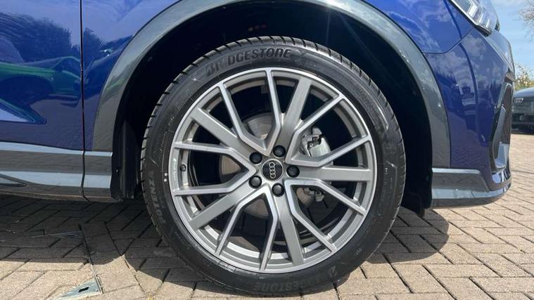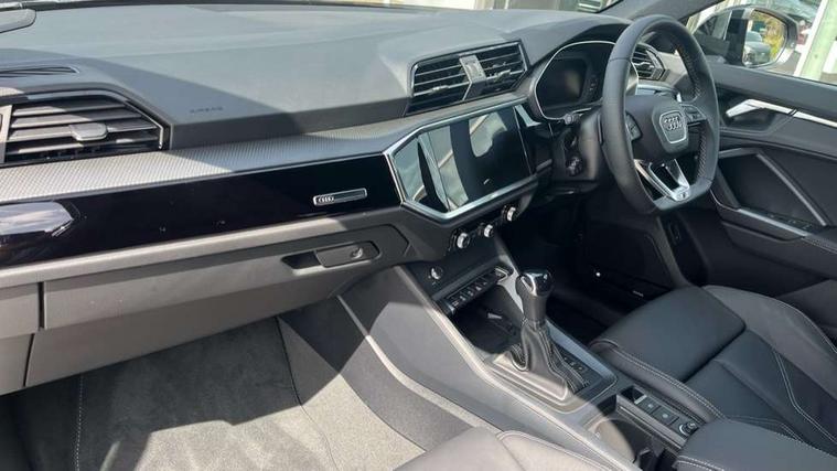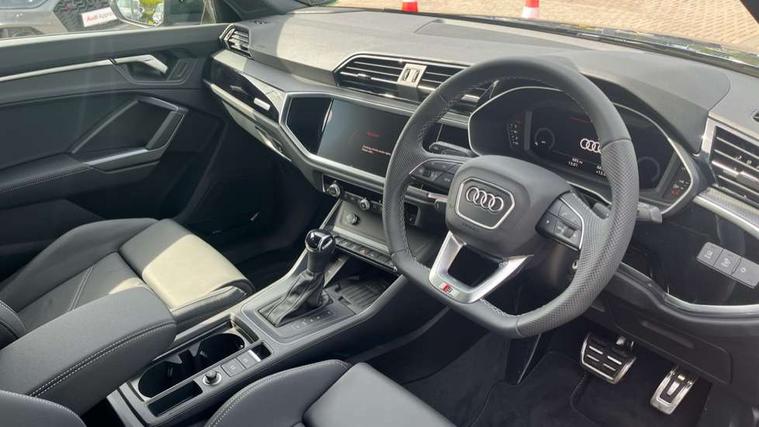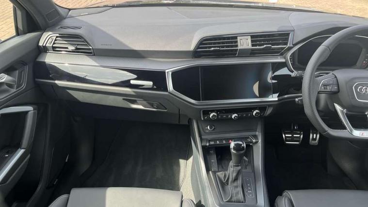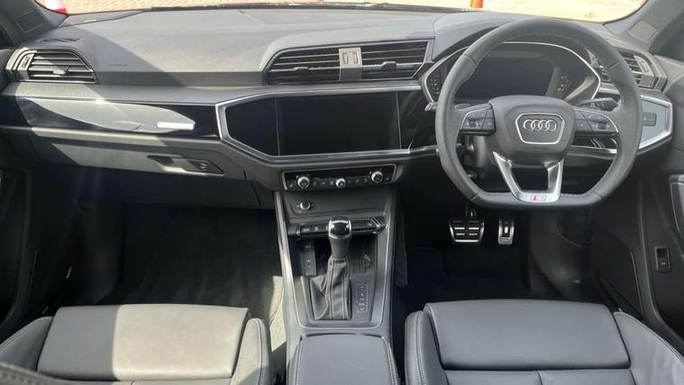 Amazon alexa Integration, Audi connect safety and service, Audi drive select, Audi lane departure warning, Audi Virtual Cockpit - 10.25" display, Bluetooth interface, Camera based traffic sign recognition, Distraction and Fatigue warning, Legal emergency call, MMI Navigation Plus with high resolution 10.1 inch touchscreen colour display, Power operated tailgate, Progressive steering, Service interval indicator, Smartphone interface includes wireless Apple carplay/Android Auto, Start stop system with recuperation, Voice control system with natural language interaction, Sports suspension, 2 USB-C ports with charge and data functions, 6 passive loudspeakers, DAB digital radio module, Acoustic windscreen, Anthracite black radiator grille, Audi Beam uses LEDs to project the Audi logo onto the ground as you exit your Q3, Auto dimming door mirrors, Auto dimming frameless rear view mirror, Black roof rails, Electrically folding, adjustable and heated door mirrors with integrated LED side indicators and kerb view function for passenger side, Front and rear electric windows, Front fog lights, Grille vertical bars in aluminium silver/Matt, High gloss black finish B and C pillars, LED Dynamic rear indicators, LED headlights with LED daytime running lights, LED rear lights, LED third brake light, Privacy glass dark tinted rear and rear-side windows (from B-pillar backwards), Rain and light sensors, Rear diffuser grille in grained matt black, Rear diffuser strip in matt anthracite black, Rear side wing doors, Rear wiper, S line bumpers in contrasting Manhattan grey, Variable front intermittent wipers, 12V socket in rear centre console, 3 seat bench in 2nd row, 40:20:40 folding with manual adjustment for 60:40 forwards/backwards position and backrest angle, Adjustable rear seat bench/backrest with centre armrest and cupholder, Black carpet mats, Black cloth headlining, Dual zone electronic climate control, Electric lumbar support, Front and rear black floor mats with contrast stitching in rock grey, Front and rear headrests, Front centre armrest, Height and reach adjustable steering wheel, Illuminated door sill trims with S logo, ISOFIX child seat mounting for front passenger with airbag deactivation and outer rear seat including top tether attachment point for outer rear seats, Luggage compartment sill protection in stainless steel, Manual front seats with height adjustment, Perforated leather gearknob, Single front passenger seat, Stainless steel pedals, Twin leather upholstery with front sport seats + S embossing, Black styling pack - Q3, Non smoking pack - Q3, 3x3 point rear seatbelts, 6 airbags - Driver, front passenger, curtain and side windows, Audi pre-sense front with pedestrain and cyclist recognition, Electrically operated child locks on rear doors, Electromechanical parking brake, Electronic stabilisation control including ABS, ASR and EDL, Front seatbelt reminder, Hill descent control, Hill hold assist, Pre sense basic, Seatbelt monitoring, Tyre pressure warning, Warning triangle and first aid kit, Anti theft wheel bolts, Immobiliser, Remote central locking, Thatcham approved category 1 anti theft alarm, Aluminium look interior elements, Detail dashboard around MMI touch colour display in glass look, black with surround in aluminium look, Leatherette door armrest, Piano black inlay,