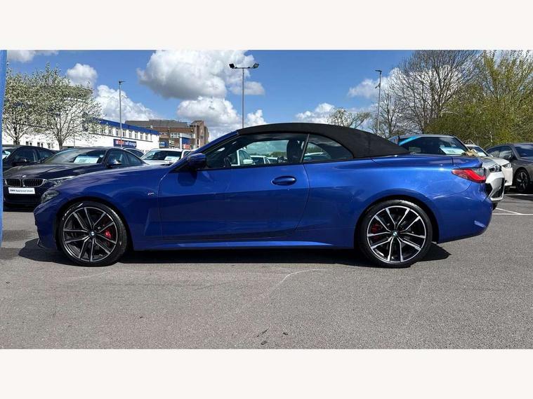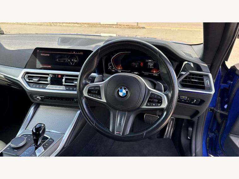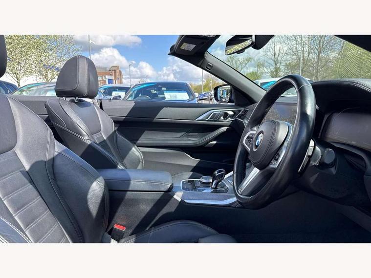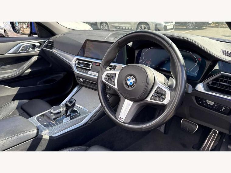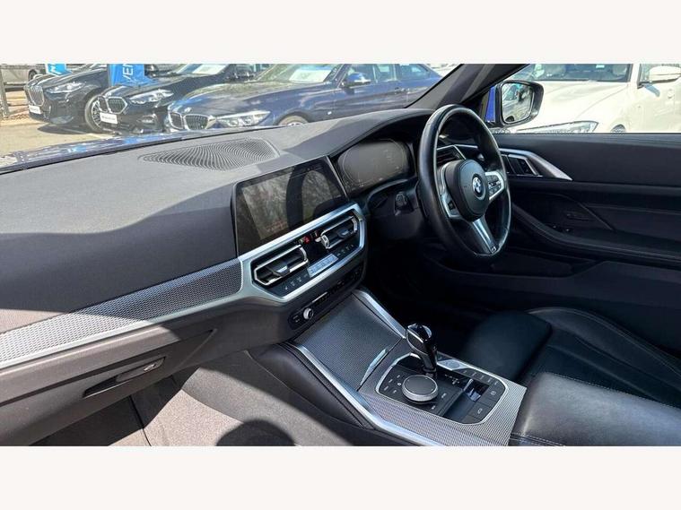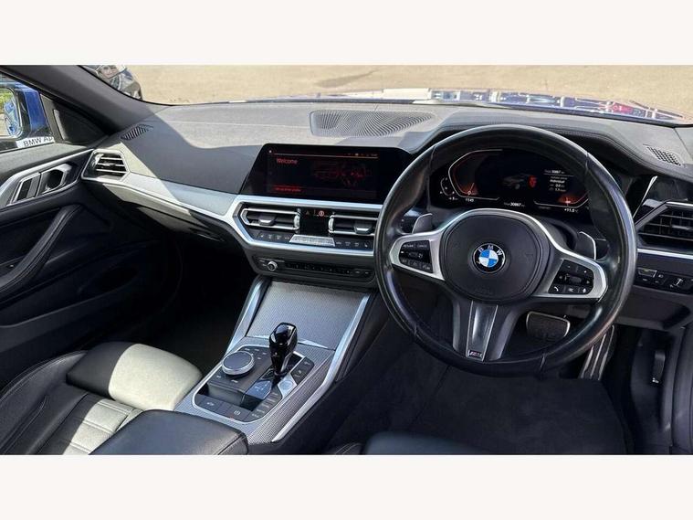 Active guard plus, Attentiveness assist, Auto start-stop, Bluetooth hands free facility with USB audio interface with audio streaming, BMW ConnectedDrive online services, BMW iDrive controller on centre console, BMW Live Cockpit Plus Nav-12.3" instrument&14.9" control Widescreen curved display/Intelligent Voice Assist/iDrive touch/Access 3rd party app/4G LTE, BMW service history, BMW Teleservices, Brake pad wear indicator in front and rear, Check Control warning system for monitoring of lights and door/luggage compartment open warning, Condition based service, Cruise control with speed limit function, Electric power steering with Servotronic steering optimised at all speed ranges, Gearshift time display in manual mode, Instrument cluster with speedometer with mph readout, tachometer, fuel gauge and oil temperature gauge, Integrated owners handbook, Oil sensor for level and grade, warning by check control system, On board computer - average speed, fuel consumption, outside temp display with acoustic warning, clock/date, service interval, odometer/trip meter, Optimum shift indicator, Run flat indicator, Shifting point display, Variable sport steering, 8 speed automatic steptronic transmission with gearshift paddles, Balanced 50/50 weight distribution, Double joint spring strut front axle, Double VANOS, Drive performance control - ECO PRO, comfort and sport modes, Electronic differential lock control (EDLC), High precision injection, Low centre of gravity, M sport suspension, Petrol Particulate Filter, Stroke dependent dampers, VALVETRONIC engine management, 2x USB Type C ports in front centre console for charging and data transfer, 2x USB Type C ports in rear centre console for charging, DAB tuner, Electronic service booklet, Acoustic glazing, Automatic headlight beam throw control with load dependent regulating reaction, dynamic compensation of braking dive and acceleration squat, Automatic windscreen wipers and automatic headlight, Automatically dimming electrochromatic rear view mirror, BMW emblem on engine compartment lid and tailgate, BMW kidney grille with mesh grille front side of the nuggets in matt aluminium and frame in chrome high gloss, Body colour fuel filler flap, Body colour roof fin, Brushed aluminium inserts in the front door sill finishers with BMW designation, Door sill strips, Dynamic brake lights, Electric windows - front and rear, with open/close fingertip control, anti trap facility and comfort closing function all round, Exterior mirrors - electrically folding with anti-dazzle, Fading support, Follow me home headlights, Front and rear bumper system, Front apron plastic in body colour, Green tinted heat protection glazing, High gloss shadow line exterior trim, Illuminated bow type door handles in body colour drivers side with door lock, Interior rear view electrochromatic mirror with automatic anti dazzle function, LED daytime running lights, LED front fog lights, LED front indicators, Licence plate panel integrated into front bumper and tailgate, Lightweight engineering, M designation on front side panels, left and right, Model designation on right side of tailgate, One piece front bumper cover including towing eye cover in body colour, Preparation for high beam assistant, Rear boot, Reversing light, Side frame decorative moulding black matt, Third brake light, Two part LED tailights in L-shape with components in smoked glass, brake light, LED turn indicator and rear fog light, Visible exhaust tailpipe finisher, Visible VIN plate, Welcome lights in interior and door handle area, Widened track and increased camber values for max transverse dynamics, agility and steering precision, Window recess cover black high gloss, Windscreen wipers with integrated heated washing jets, 12V power socket in front centre console, 2 2nd row folding seats, 2 front cupholder in centre console with clamping elements and matt black inlay, 2 Rear seat headrests, 2nd row centre armrest with built-in cupholders, 3 spoke M sport leather multifunction steering wheel, 3 zone automatic air conditioning, 4 pieces lashing eyelets in luggage compartment, Anthracite headlining, Armrest integrated in front and rear door trim + front centre console armrest, BMW ID, Electric seat adjustment with memory, Extended storage, Luggage compartment seprating net on side trim left and right, Four grab handles integrated in roof lining, Front and rear door pockets, Front and rear reading lights, Front sport seats, Heated driver and front passenger seats, Height adjustable front headrests, Height adjustable mechanically and infinitely variable steering column, Illuminated armrest storage compartment, Illuminated glove compartment with separate small compartment, Make-up mirror lights, Single front passenger seat, Storage compartment in rear centre console, Sunvisors with illuminated vanity mirrors and ticket pocket, Through load system, Toolkit located in luggage compartment, Velour front floor mats, Vernasca leather upholstery, Ambient lighting pack - 4 Series, Connected professional package - 4 Series, M sport exterior styling pack - 4 Series, 2 x 3-point rear seatbelts, Battery safety cut-off, BMW emergency call, Brake energy regeneration, Braking pre-tensioning, Coasting in idle in ECO PRO mode, Cornering brake control (CBC), Crash sensor activating of airbags, Unlocking doors, hazard warning lights, interior light, safety battery terminal, Driver and front passenger side airbags, integrated in the door side seat backrest bolsters for all seat variants, Driver/Front Passenger airbags, Dry braking, Dynamic brake control, Dynamic stability control + (DSC+) - Anti-lock Braking System (ABS) with brake assist and cornering brake control + Automatic Stability Control (ASC), Dynamic Traction Control - DTC, Electric parking brake including automatic hold function and automatic release of the parking brake when driving off, Front and rear ventilated brake disc, Front passenger manual airbag deactivation, Head airbags 