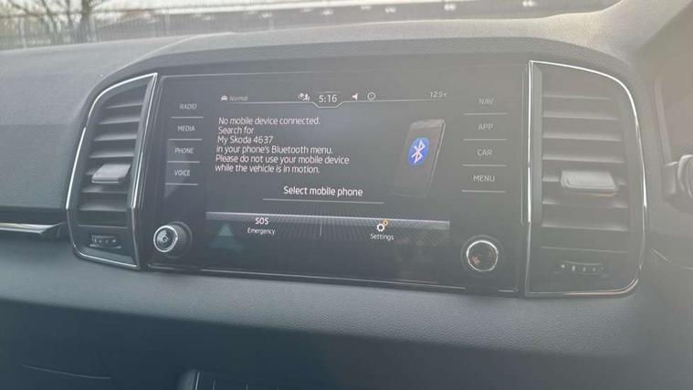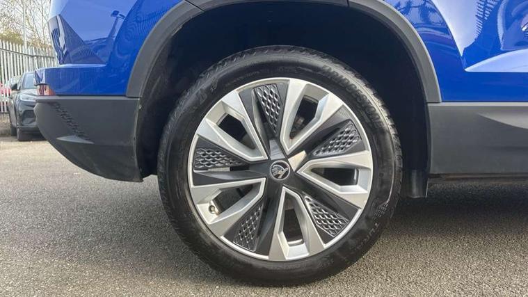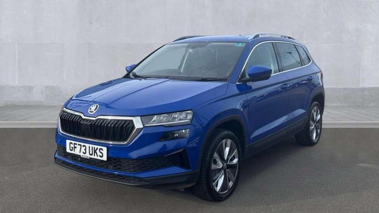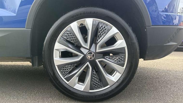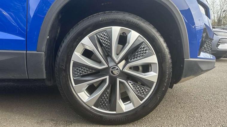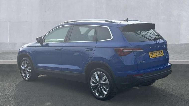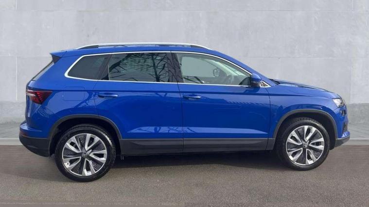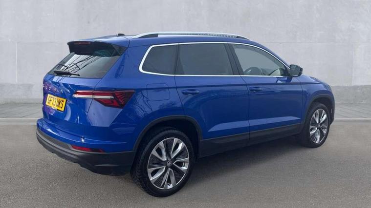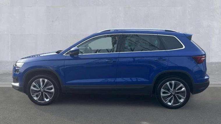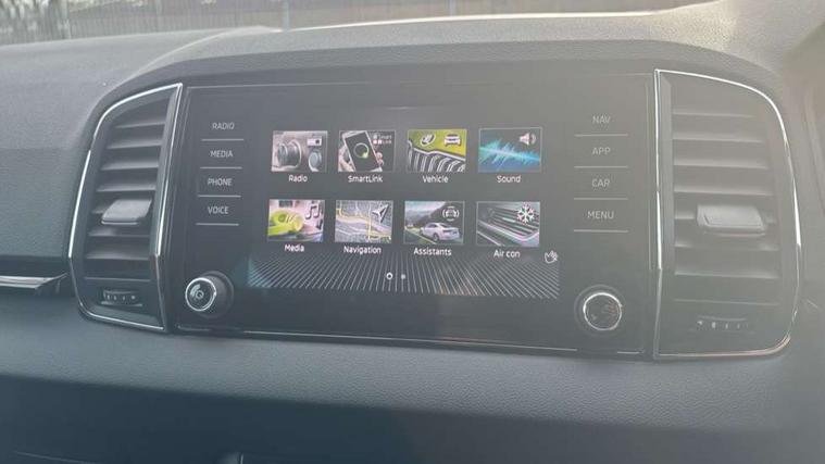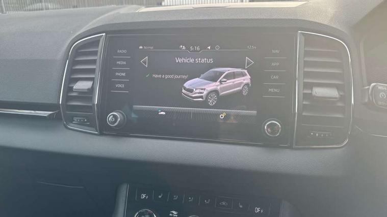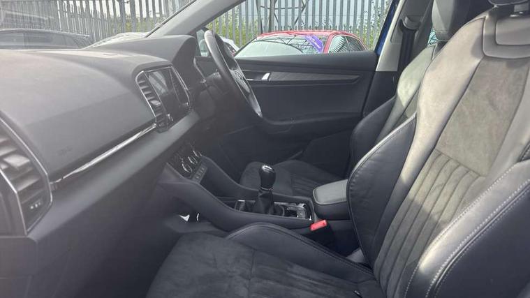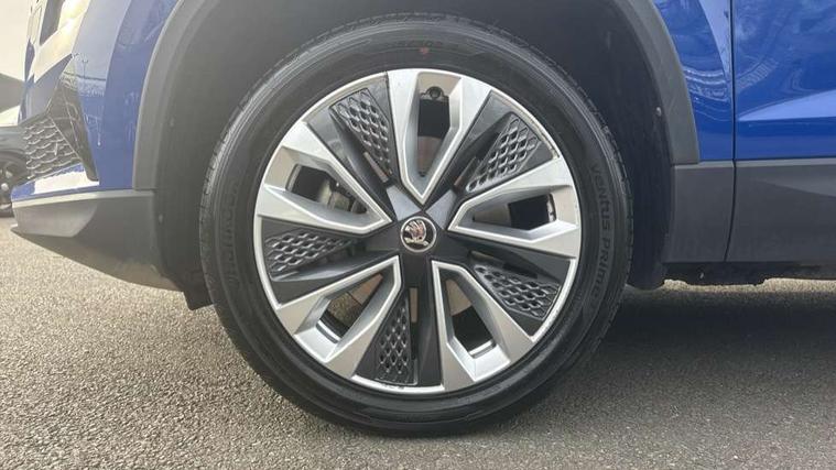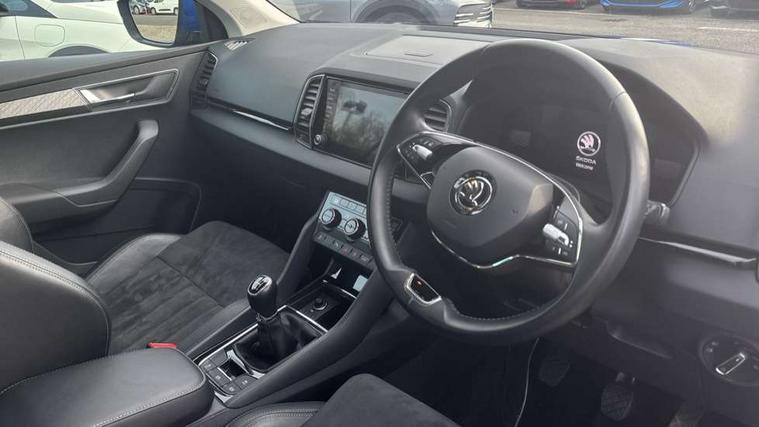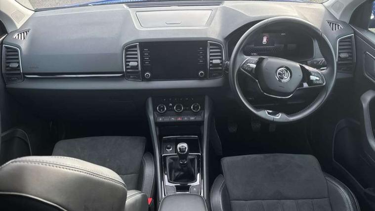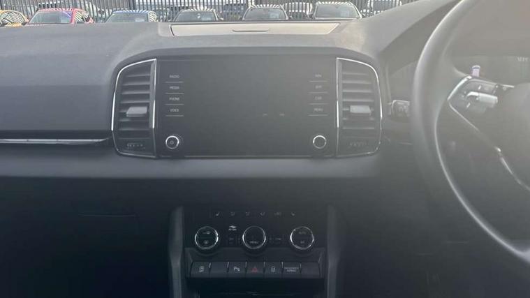 8" Digital display, Care connect, Driver fatigue sensor, Emergency services call system, Outside temperature gauge, Service interval indicator, SmartLink wireless for Apple and wired for Android, Start/stop system with regenerative braking, USB C Port x 2 in front centre console, 8 Speakers, DAB radio with Bluetooth, USB connection, Acoustic glass, Aero front windscreen wipers with intermittent function, Auto dimming rear view mirror with light and rain sensors, Black electric window control buttons, Body colour door mirrors and handles, Dynamic headlight range control with cornering light function, Electric front and rear windows with child proof lock, Heated rear windscreen, LED daytime running lights, LED rear lights with high functionality welcome effect and dynamic indicators, Light assistant (coming/leaving home/tunnel light), Plastic scuff plates, Privacy glass, Rear side wing doors, Rear spoiler, Rear window wiper with washer system and intermittent control, Safety reflectors on front doors, 1.5 litre bottle holders in driver and front passenger door panels, 12V socket in boot, 12v socket in front centre armrest with storage compartment and rear air vents, 2 spoke leather heated multifunction steering wheel, 2 x Tablet holder, 3 rear height adjustable headrests, 3 seat bench in 2nd row, 4 foldable roof handles with rear coat hooks, Black floor carpet, Chrome inner door handles, Double sided boot floor, Foldable hooks in the boot, Front head restraints, Height adjustable front three point seats belts with tensioners, Height/reach adjust steering wheel, Ice scraper, Illuminated glovebox, Illuminated luggage compartment, Isofix child seat preparation for front passenger seat, Isofix child seat preparation outer rear, Manual lumbar support for front seats, Pen holder, Pollen filter, Rear boot cover, Rear reading lights, Rubbish bin door, Safety vest holder, Single front passenger seat, Storage box in upper central dashboard closed, Sunvisors with illuminated vanity mirrors, Textile floor mats, Ticket holder, VarioFlex seats with standard rear seat release, Boot pack - Karoq, Design Pack - Karoq, Parking pack - Karoq, Automatic door unlocking in case of crash, Automatic fuel cut off in case of crash, Child locks on rear doors, Driver airbag, Electronic parking brake with auto hold function, Emergency rear braking signal, ESC including ABS, MSR, ASR, EDS, HBA, DSR, RBS, MKB and traction control, Front side airbags, Hill hold control, Knee airbags, Passenger airbag with switch-off function, Pedestrian monitor, Seatbelt reminder signalisation and pretensioner for all seats, Three point seatbelts rear, Two tone horn, Tyre pressure display, Tyre pressure monitor, Alarm with interior monitoring, back up horn and tilt sensor with safe function, Electronic engine immobiliser, Keyless entry and start/stop, Remote central locking with 2 remote folding keys, Chrome framed air vents, 18" Miran alloy wheels in black, Anti-theft wheel bolts protection, Tool kit,