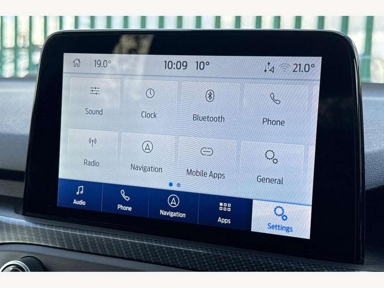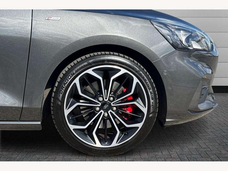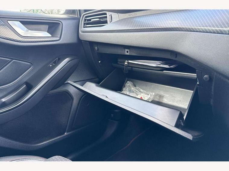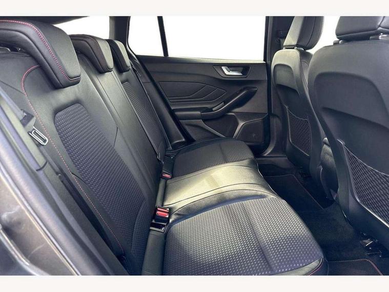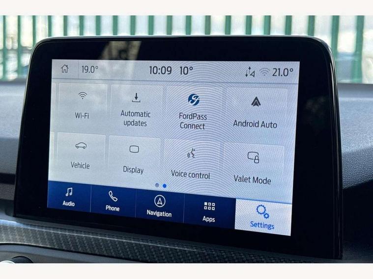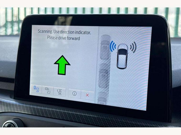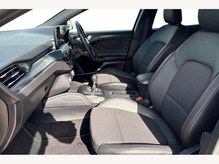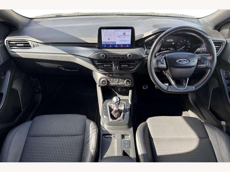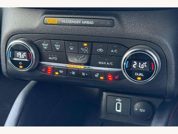 4" TFT coloured cluster screen, Bluetooth system, Digital clock, Easy fuel capless refuelling system, Eco mode, Ford pass connect, Ford SYNC 3 nav system with DAB radio, 8" colour touch screen, voice control, app link, Apple car play/Android auto and 4.2" TFT coloured cluster, Lane keeping aid with lane departure warning, PAS, Selectable drive mode, Trip computer, Diesel particulate filter, Sports tuned suspension, 2 USB ports, Aux input, 'Quickclear' heated windscreen/heated washer jets, Auto dimming rear view mirror, Auto headlamps (on/off), Automatic rain sensing wipers, Body colour large rear spoiler, Body colour power folding door mirrors with puddle lights, Body colour side skirt, Body coloured bumpers, Body coloured door handles, Body coloured electrically operated and heated door mirrors with side indicators, Electrically operated front and rear windows with one touch opening and closing, Front variable intermittent wipers with electric wash, Heated rear window, LED daytime running lamp, LED front fog lamps with cornering function, Polished twin tailpipe, Rear privacy glass, Roof rails, ST-Line upper and lower grille with full body styling kit and wing badges, Tailgate wash/wipe, Unique door and instrument panel inserts, 3 spoke flat bottomed leather steering wheel with red stitching, 6 way power adjustable driver seat, 60/40 split back and cushion rear seats with 2 height adjustable headrests, Alloy finish pedals, Aluminium gear knob, Auto fold rear seats, Centre console with armrest, Dark headliner, Dual zone electronic air temperature control, Front and rear floor mats with red stitching, Front passenger seat manual height and lumbar adjust, Heated front seats, Height adjustable front headrests, Isofix child seat preparation, Part leather upholstery with red stitching, Reach + rake adjustable steering column, Rear centre headrest, Red stitching on steering wheel, Soft console knee pads with red stitching, ABS+Electronic Brake force Distribution, Auto hold function, Driver airbag, Electronic parking brake, Electronic stability control, Front and rear seatbelt reminder, Front inertia reel height adjustable seatbelts with pre-tensioners, Front passenger airbag, Front side airbags, Hill start assist, Passenger airbag deactivate switch, Post collision braking, Pre collision assist with autonomous emergency braking and pedestrian/cyclist detection, Red brake calipers, Side curtain airbags, Three rear inertia reel lap/diagonal seatbelts, Tyre pressure monitoring system, MyKey system, Remote central locking & engine immobiliser, Thatcham category 1 alarm, Contrast stitching - Red, 18" 5x2 spoke matt black machined finish alloy wheels, Mini steel spare wheel,