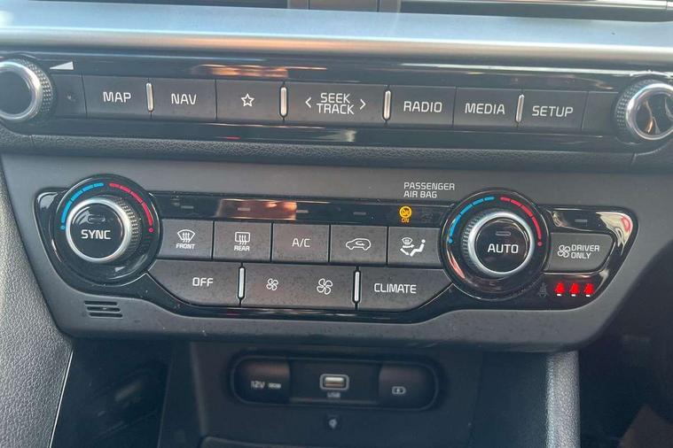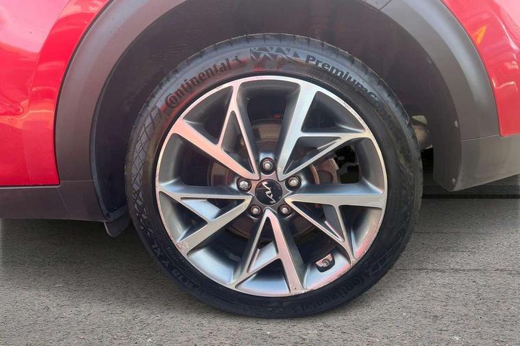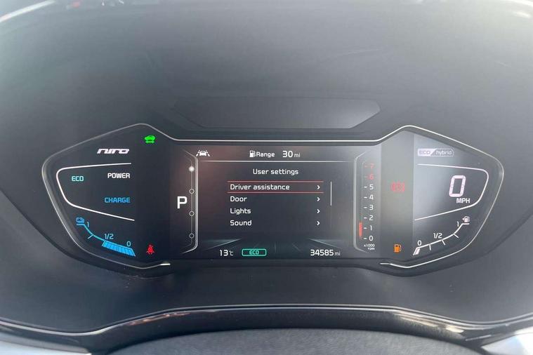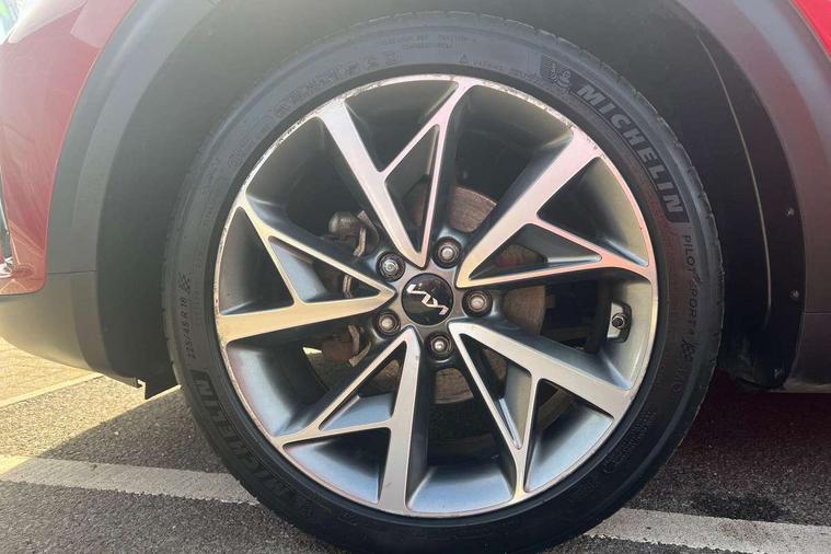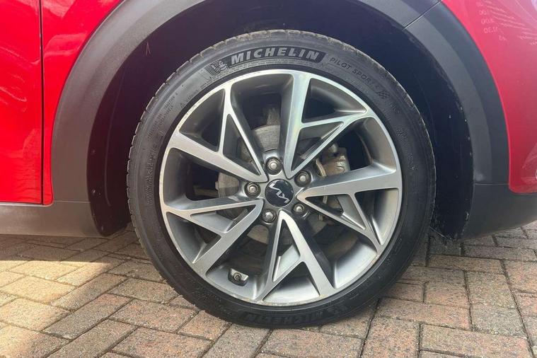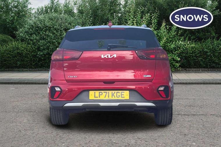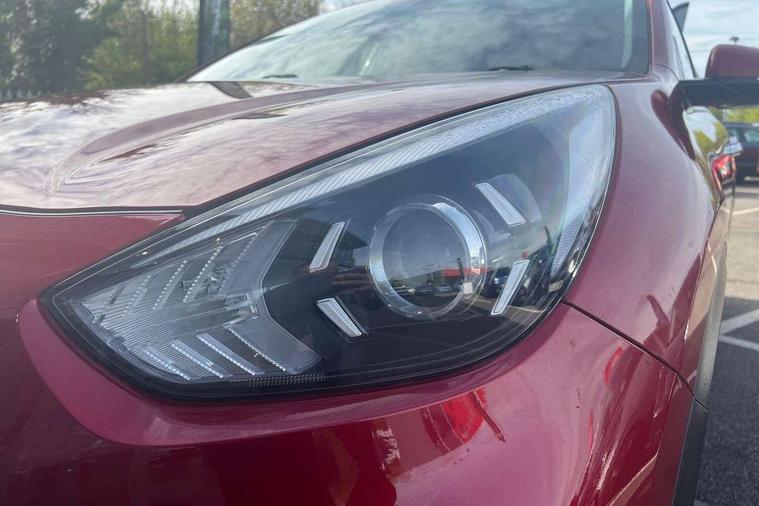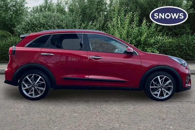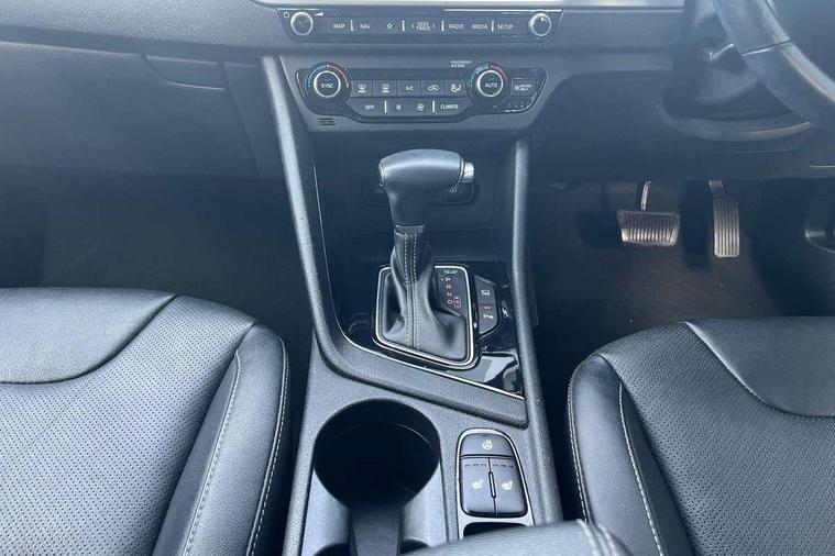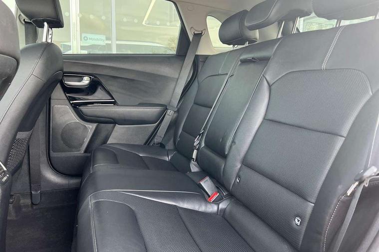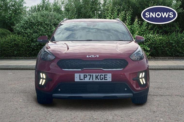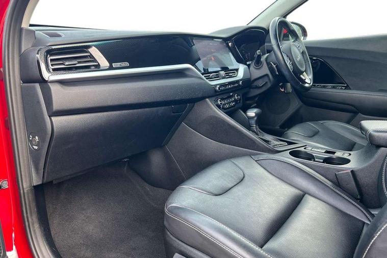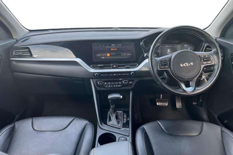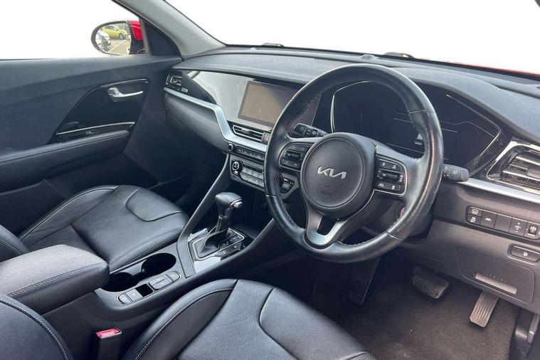 10.25" Touch screen satellite navigation with european mapping and traffic messaging channel, 7" full supervision cluster with TFT colour display, Adaptive smart cruise control function (SCC) with stop and go, Apple car play/Android Auto with voice control, Digital clock, Drive mode selector, Driver attention warning, Emergency call service, Emergency stop signalling system, Forward collision avoidance assist, Front parking sensors, Kia connected services featuring TomTom live, Lane Following Assist (LFA), Lane keep assist, Motor driven power steering, Rear parking sensors, Reversing camera, Speed limiter, Trip computer with distance/fuel consumption/average speed, UVO connect, Wireless Smartphone charger, 'Shark fin' mobile antenna, 6 speakers, Bluetooth with music streaming, DAB Radio with MP3, Steering wheel mounted controls, USB connection located in centre console, USB port, All round electric windows with drivers and front passenger auto up/down function, Auto dimming rear view mirror, Automatic defog system, Automatic headlight control system, Black beltline mouldings, Black side sills, Black wheel arch mouldings, Body colour bumpers, Body coloured/high gloss door mirrors, Chrome door handles, Driver's side wide angle mirror, Electrically folding/adjustable/heated door mirrors with LED indicators, LED daytime running lights, LED fog lights, LED rear combination lights, LED third brake light, Manual headlight levelling, Matt black radiator grille, Privacy glass - Rear windows and tailgate, Projector headlamps, Rain sensing front wipers, Rear side wing doors, Rear spoiler, Rear wiper, Roof rails, Solar glass, Variable front intermittent wipers, Waistline black paint, Welcome and follow-me home light functionality, 3 seat bench in 2nd row, 3 x passenger assist grips, 60/40 split/folding 2nd row of seats, 8 way electric adjustable drivers seat, All-round height adjustable headrests, Aluminium door scuff plates, Bulb type overhead console lamp with sunglasses case, Centre console storage box, Centre room lamp, Cupholders in rear armrest, Driver/passenger sunvisors with illuminated vanity mirrors, Drivers seat power lumbar support, Dual zone automatic air conditioning, Front and rear door storage, Front/rear centre armrests, Headlining in Light grey, Heated front seats, Heated steering wheel, High gloss black lower console trim, High gloss black steering wheel trim, Illuminated ignition key hole, Interior door lock/unlock function, ISOFIX Child seat top tethers and anchor fixings, Leather trimmed door armrests, Leather trimmed steering wheel, Leather trimmed steering wheel and gearshift, Leather upholstery, Luggage area lamp, Luggage area load cover, Luggage net with hooks, Paddle shifts, Passenger seat height adjuster, Satin finish inner door handles, Seatback pocket - driver, Seatback pocket - front passenger, Single front passenger seat, Tilt/telescopic adjustable steering wheel, Under floor storage box, Ventiliation ducts to rear compartment, Towing pack - Niro, 3 point seatbelts on all seats, ABS, Automatic unlocking of doors in case of impact, Drivers knee airbag, Electric parking brake with auto hold function, Electronic stability control, Front passenger airbag cut-off switch, Height adjustable front seatbelts, Hill start assist control (HAC), Manual child lock in rear doors, Traction control, Twin curtain airbags with roll over sensor, Twin front and side airbags, Tyre pressure monitoring system, Alarm system and engine immobiliser, Deadlocks, Locking wheel nuts, Remote central door locking with fold away key, Speed sensitive auto door locking, Visible vehicle identification number, High gloss black centre fascia, High gloss black door inserts, 18" Alloy wheels, Tyre mobility kit,
