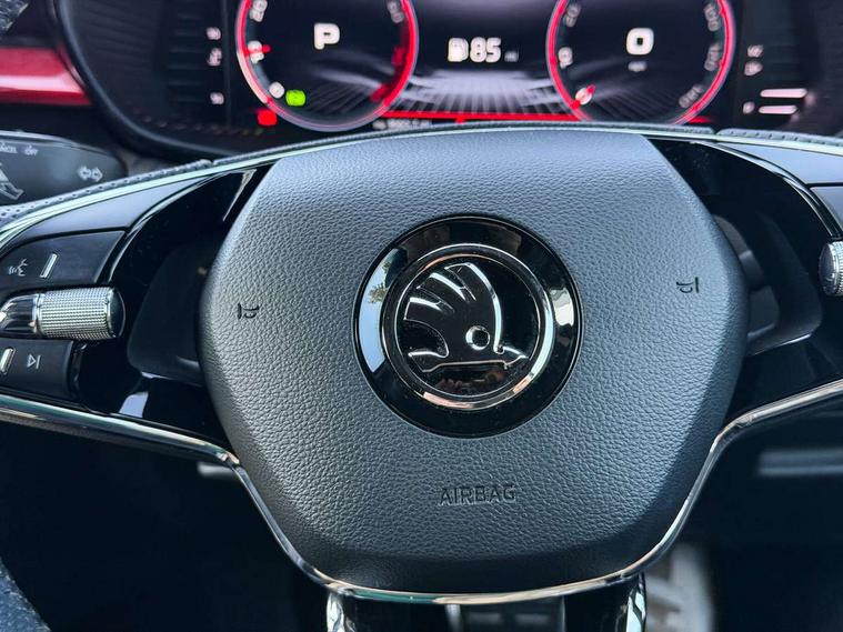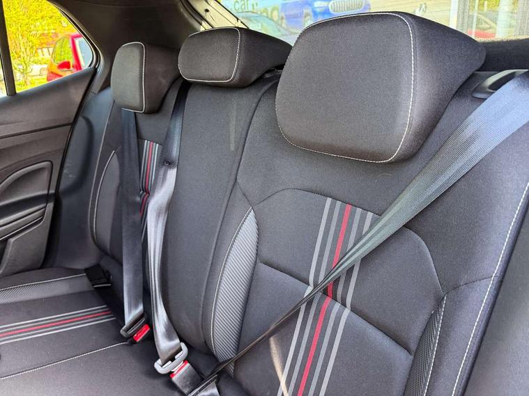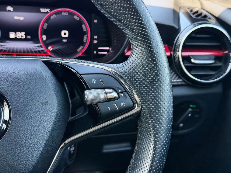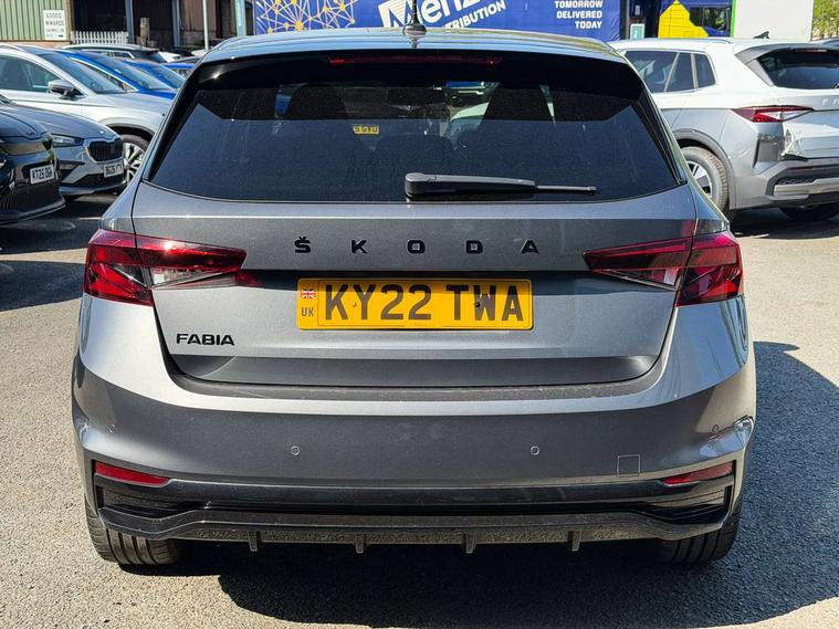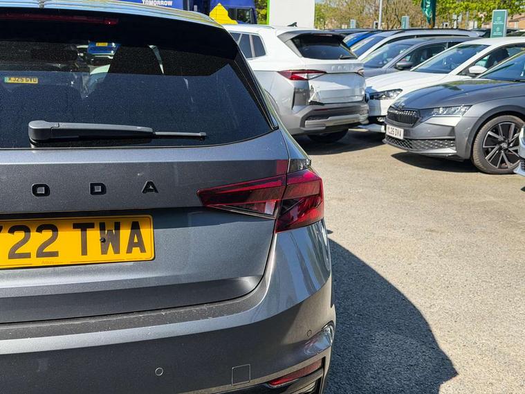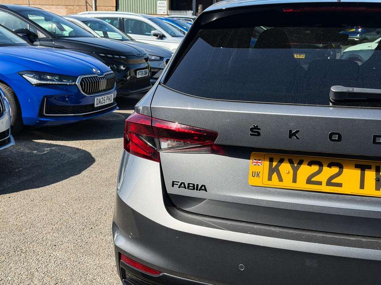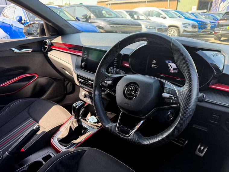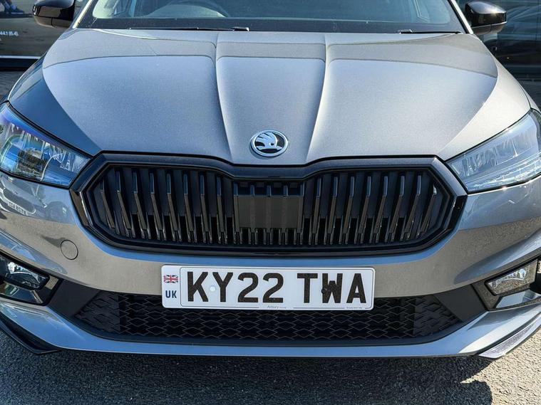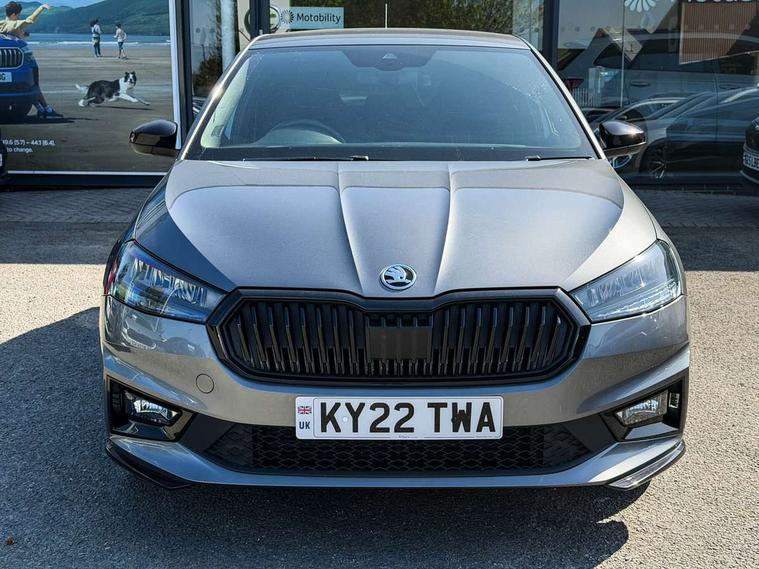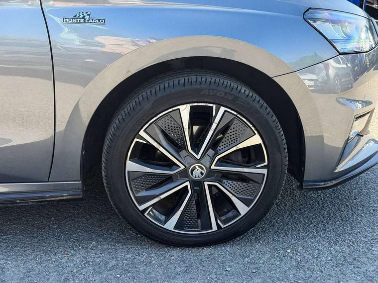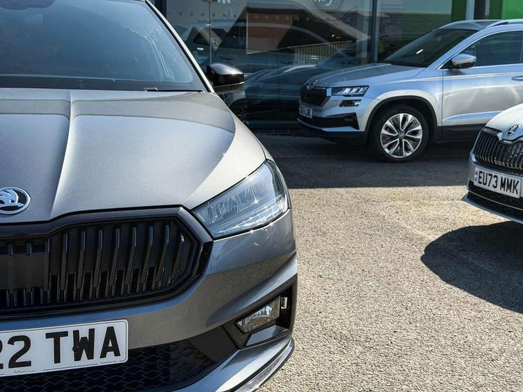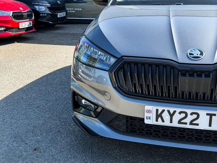 Bluetooth connection, Driver alert system - DAS, Electromechanical power steering, Exterior temperature gauge, Service interval indicator, 2x USB-C in the front (for data transmission and charging), 6 Speakers (4 in front and 2 in rear), Auxiliary socket for external MP3 player, Bolero radio with 8" colour display, DAB digital radio reception, Auto dimming rear view mirror, Basic rear lights, Black radiator grille, Body coloured bumpers, Door mirror integrated indicators, Electrically adjustable and heated door mirrors, Front and rear electric windows, Front window wiper intermittent control, Headlight range control - Automatic, Ice scraper in fuel cap, LED daytime running lights with coming and leaving home feature, Monte Carlo badging, Privacy glass, Rear LED fog light, Rear side wing doors, Rear window wiper with washing nozzles, Roof mounted spoiler, SKODA tailgate lettering in black, Sports bumpers, Third brake light, 3 rear headrests, Aluminium pedals, Backrest split and folding, Black headlining, Central console with removable cup holder and storage box, Chrome handbrake release button, Fabric/artificial leather upholstery, Front sports seats, Gearshift knob/handle in leather, Hand brake lever handle in leather, Height adjustable front headrests, Height adjustable steering wheel, ISOFIX and TopTether anchorage points to the outer rear seats, ISOFIX and TopTether on the front passenger seat, Luggage compartment lighting, Metallic painted red central console cover, Metallic red interior door handles, Monte Carlo door sills, Pollen filter, Rear seat bench unsplit, Single front passenger seat, Sun visors with mirror and airbag label on passenger side, Textile floor mats, Ticket holder, Umbrella in drivers door, Ambient lighting pack 2 - Fabia Hatchback, 3-point height adjustable front seats belts with pretensioner and force limiter, Automatic warning lights in case of crash, Driver and passengers airbag with switch off function, e-Call+, ESC including ABS, MSR, ASR, EDS, HBA and XDS, Front and rear seat belt warning, FRONT ASSIST (AEB City and AEB Inter Urban), Front side airbags, Head airbags, Hill hold assist, One tone horn, Pedestrian protection, Three rear 3-points safety seat belts with pretensioner and force limiter including stop function for outer rear seat belts, Tyre pressure monitoring system, Anti-theft alarm system including immobiliser, interior monitoring, backup horn, and towing protection, Carbon effect door and side trim panels, Carbon effect lower decorative trim with white stitching, Red metallic upper decorative trim, Anti-theft wheel bolts protection, Super-low rolling resistance tyres,