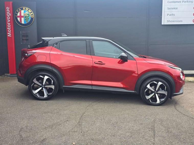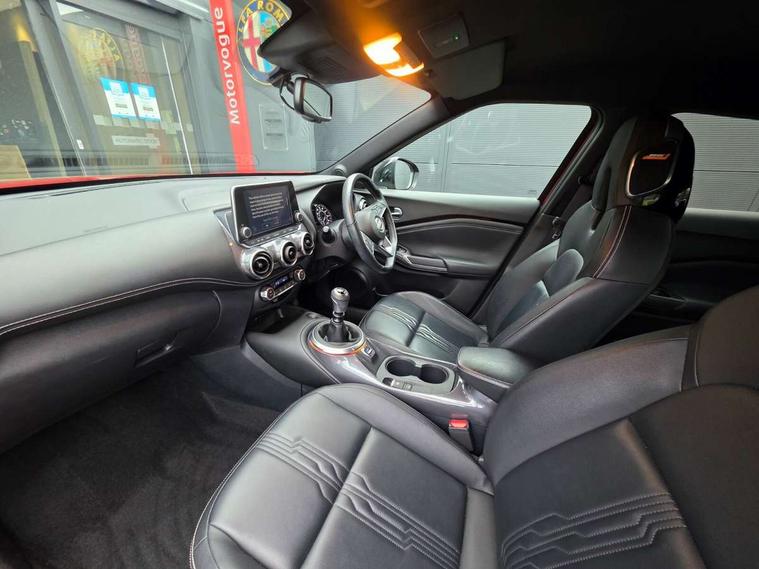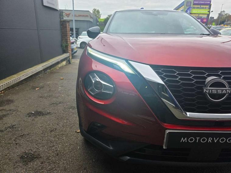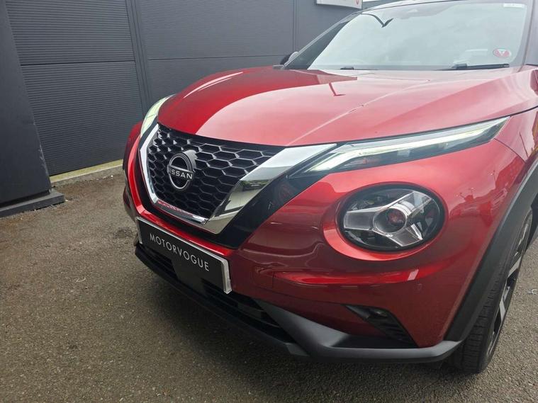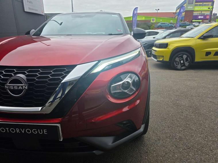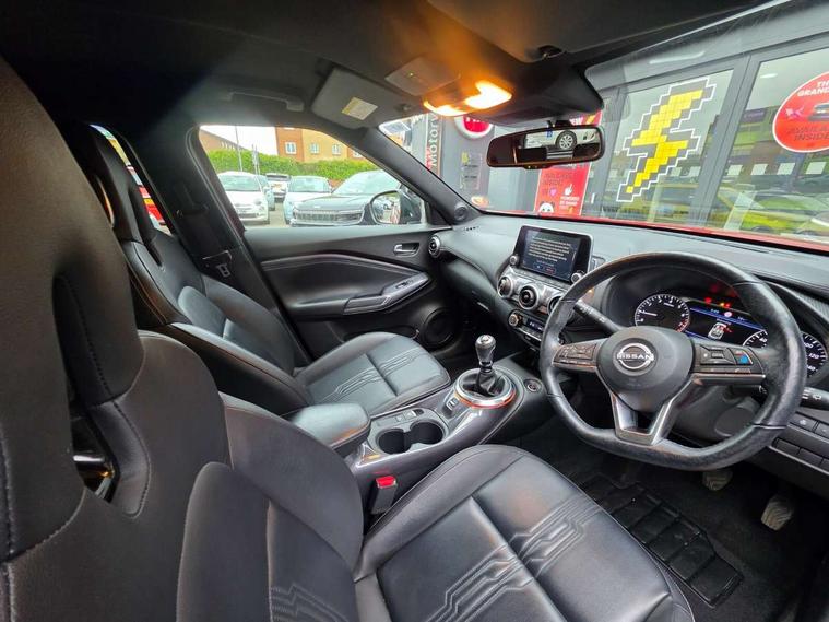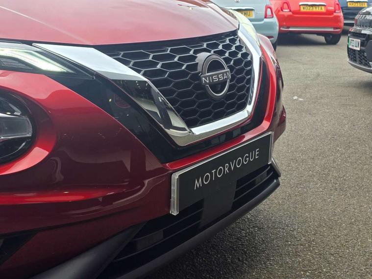 7" full colour TFT screen combimeter, Apple CarPlay and Google Android auto, Drive modes select (Eco, normal and sport), Emergency and breakdown call, Front parking sensor, Idle start/stop system, Intelligent lane intervention, Lane departure warning system, Nissan connect 8" touch screen entertainment system, Nissan connect nav with TomTom traffic, Nissan connect services and Wifi connection, Outside temperature sensor, Power Steering, Rear parking sensor, Traffic sign recognition, Trip computer, Voice recognition, Gasoline particulate filter, 10 Bose speakers 6 speakers and 2 headrest speakers for driver/passenger seats, Bluetooth system, USB, Aux-in and 12V socket, Bose personal sound stage control, DAB Digital radio, Rear console USB port, Auto dimming interior rear view mirror, Auto headlights, Automatic hazard signal with emergency stop signal, Body colour bumpers, Body colour door handles, Electrically adjustable door mirrors with integrated indicators, Follow me home headlights, Front and rear electric window with one touch driver window, Heated and auto folding door mirrors, High beam assist, LED daytime running lights, LED front fog lights, LED headlamps, LED rear fog lamp, LED rear lamps, Rain sensor windscreen wipers, Rear privacy glass, Rear side wing doors, Rear wiper, Thermaclear heated windscreen, Three blink turn signal, 3 height adjustable rear headrests, 3 seat bench in 2nd row, 60/40 split folding rear seat, Automatic climate control, Card holder on driver sunvisor, Door ambient lighting, Driver and passenger sliding and reclining seats, Driver seat back pocket, Driver side rear coat hanger, Driver/passenger sunvisors and vanity mirrors, Front and rear cabin lights, Front armrest, Front door pockets with bottle holders, Front head restraints, Front passenger isofix child seat anchorage point, Front/rear passenger grab handles, Gear console ambient circle lighting, Grey synthetic leather kneepad, Heated front seats, Height adjustable driver's seat, Height adjustable passenger seat, Internal chrome door handles, Leather gearshift knob, Leather steering wheel, Luggage board, Luggage space lighting, Monoform sporty seats, Multifunction steering wheel, Passenger seat back pocket, Rear door bottle holders, Single front passenger seat, Synthetic leather upholstery, Telescopic steering wheel adjustment, Two cupholders in front centre console, Two rear isofix child seat anchorage points with top tether, Welcome light and console tray ambient lighting, Advanced safety shield pack - Juke, ABS with EBD and brake assist, Active ride control, Active Trace Control, Driver and passenger airbags, Driver and passenger side airbags, Electric handbrake with auto hold function, Electronic Stability Programme (ESP), Front and rear curtain airbags, Height adjustable seatbelts, Hill start assist, Intelligent emergency braking with pedestrian and cyclist recognition, Rear door child safety locks, Seatbelt reminder for driver/front passenger and rear seats, Single tone horn, Three 3 point rear seatbelts, Traction control, Tyre pressure monitoring system, VDC Dynamic Vehicle Control, Ventilated rear brake discs, Alarm, Immobiliser, Intelligent key and start push button with walk away lock and approach unlock functions, Remote central locking,