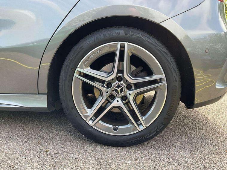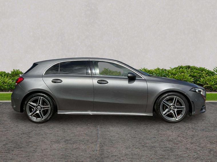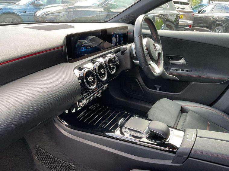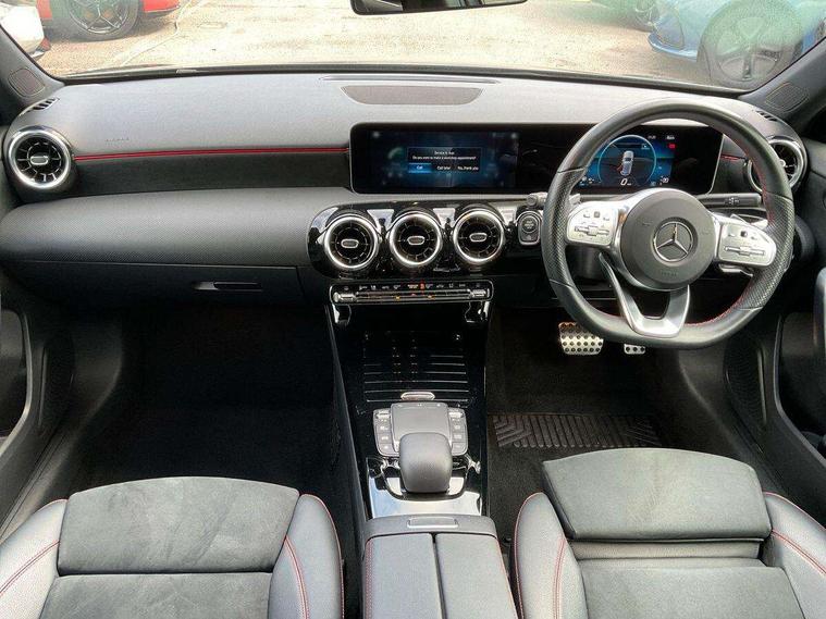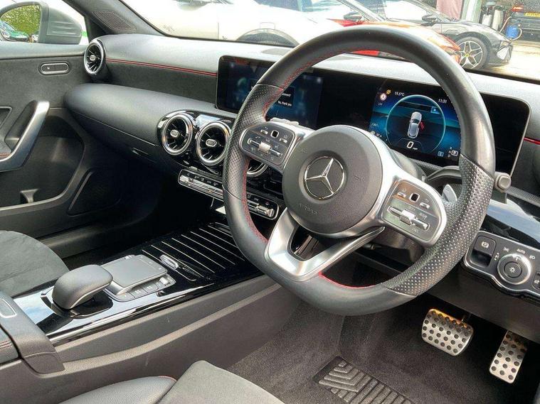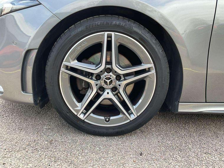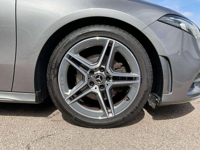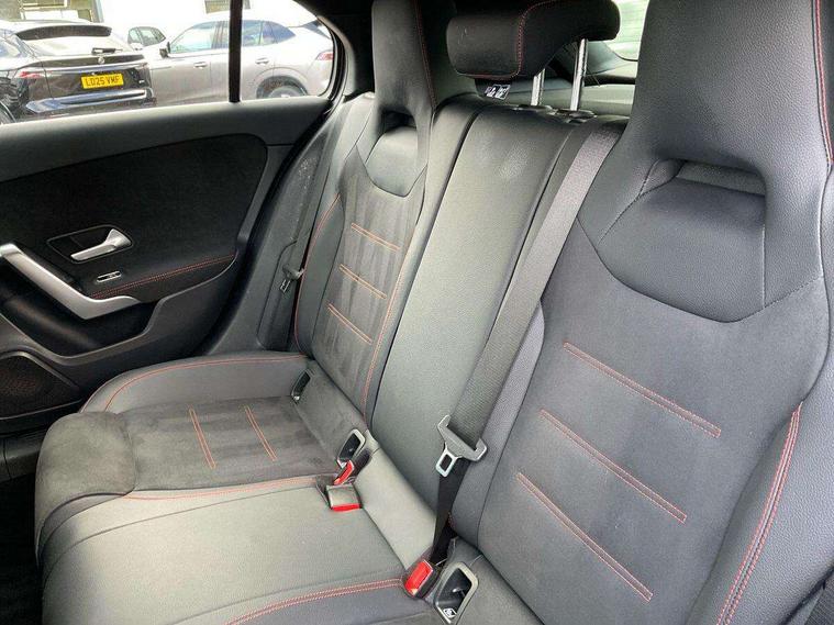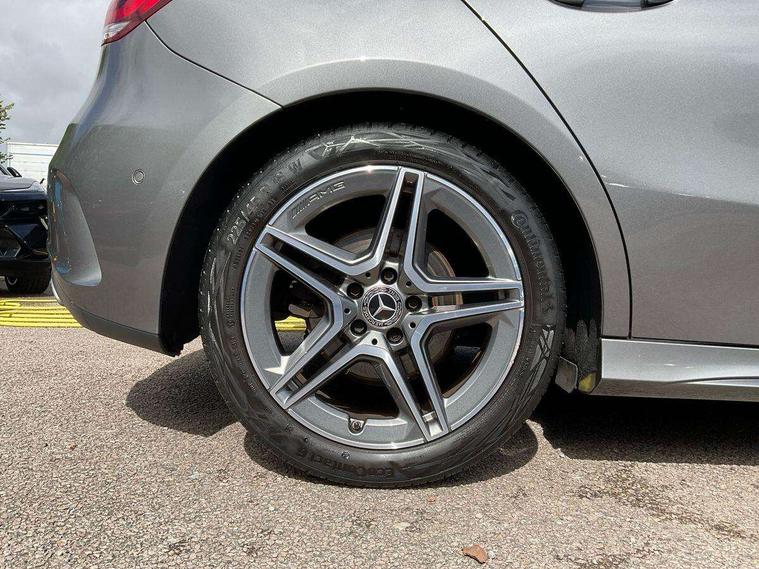 10.25" media display, 180 degree rear view camera with parking guidelines, 7" colour screen in instrument panel, Active lane keep assist, Active park assist with parktronic system including front and rear parking sensors, Attention assist, Brake pad wear indicator warning light, Car wash mode, Cruise control + speed limiter, Direct steering, Dual bluetooth interfaces, DYNAMIC SELECT with a choice of driving modes (ECO, Comfort, Sport and Individual), ECO start/stop function, Fluid level warning indicator for fuel, oil, coolant and washer fluid, Hard-disk navigation, Hey Mercedes Voice activation, Lamp failure indicator, Mercedes me connect including emergency call system, accident recovery, breakdown and maintenance management, Outside temperature gauge, Owners manual in English, Pre-installation for private car sharing, Pre-installation for Vehicle Monitoring, Pre-installation for Vehicle Setup, Preinstallation for Mercedes Benz link, Service indicator (ASSYST), Smartphone integration with Apple CarPlay and Android auto, Speed sensitive power steering, Trip computer, Wireless charging, Lowered comfort suspension, Rear axle torsion beam, 2 USB ports (type C) in rear stowage compartment and one in front of center console, 6 speakers, DAB Digital radio, MBUX multimedia system with DAB digital radio and touchpad including satellite navigation, Mercedes-Benz sound system - 100W, 4 Electric Front and Rear windows, Adaptive brake lights, AMG bodystyling - Front apron with splitter in chrome, rear apron with chrome trim and chrome visible trim elements in tailpipe, Black weather strip, Body colour bumpers, Body colour door handles, Body colour side skirt, Body coloured door mirrors, Chrome beltline trim, Diamond radiator grille with chrome pins and silver louvre + chrome insert, Electric adjustable and heated door mirrors with integrated LED side indicators, Exhaust system - Twin visible tailpipes in polished stainless steel, Headlamp assist automatic headlamp activation, Heated glass rear windscreen + timer control, LED high performance headlamps with integrated LED daytime running lights, LED tail lamp, LED third brake light, Privacy glass, Radio aerial, Rain sensing windscreen wipers with two sensitivity settings, Rear fog lights, Rear wiper, Window line trim strip in chrome, 3 Spoke flat bottom leather multi function steering wheel with perforated leather in grip area, 40:20:40 split folding rear seats, Artico man-made leather/Microfibre Dinamica upholstery with red contrast stitching, Auto Mercedes-Benz child seat recognition sensor, Black air vents with surround in silver chrome, Black roof lining, Brushed stainless steel sports pedals with rubber studs, Controller on centre console with chrome surround, Floor mats with stitched edging and AMG lettering, Front centre armrest with storage compartment, Front door sills with Mercedes Benz lettering, Front seat backs luggage nets, Front seat cushion length adjustment, Galvanished gear shift paddles on steering wheel, Heated front seats, Height/reach adjustable steering column, Interior mirror with reading lamps in black and frameless, Manual height adjustable front seats, Rear head restraints, Seat occupancy sensor for front passenger seat, Sports seats with integrated headrests, Stowage compartment in centre console with retractable cover, Sunvisors with illuminated vanity mirrors, Touchpad on center console, Twin front cupholders, Two zone thermotronic luxury automatic climate control, Light and sight pack - A Class, Mirror package - A Class, Seat comfort pack - A Class, 3 rear 3 point seatbelts, ABS with Brake Assist, Active bonnet, Active brake assist includes forward collision warning system with autonomous braking, Adaptive brake assist with hold function and hill start assist, Childproof locks manually operated for rear doors and electrically operated for rear power windows, Crash responsive emergency lighting, Driver and passenger head and side airbags, Drivers knee airbag, Dual stage driver/passenger airbags, Electronic parking brake, ESP curve dynamic assist, ESP with ASR, Front and rear seatbelt reminder, Front brake callipers with Mercedes Benz lettering, ISOFIX and top tether child seat fixing points in two outer rear seats, Tyre pressure monitoring system, Warning triangle and first aid kit, Window airbags, Alarm system/interior protection/immobiliser, Keyless Go, Remote central locking and crash sensor with emergency opening function, Urban guard vehicle protection system with immobiliser and interior protection, Black seatbelts, Dinamica microfibre trim in black, 18" AMG 5 twin spoke light alloy wheels in titanium grey with highsheen finish, Summer tyres, Tirefit sealant kit,