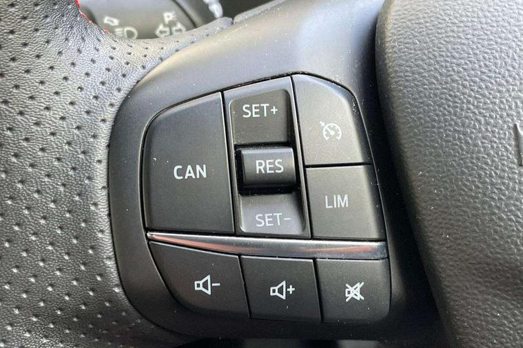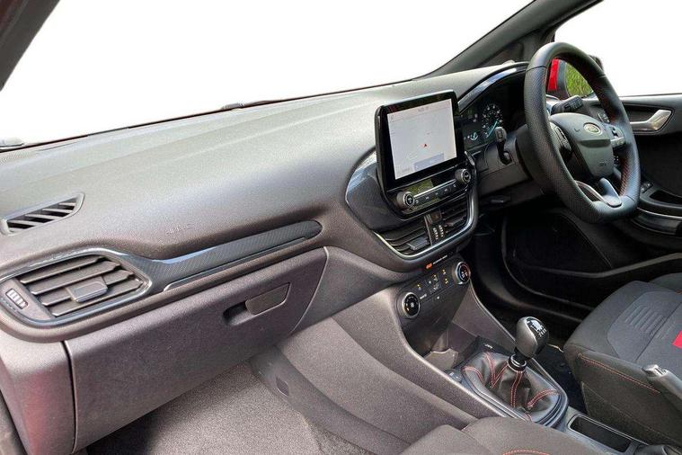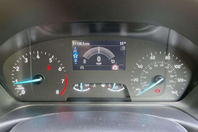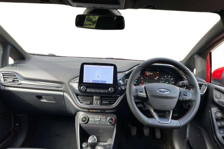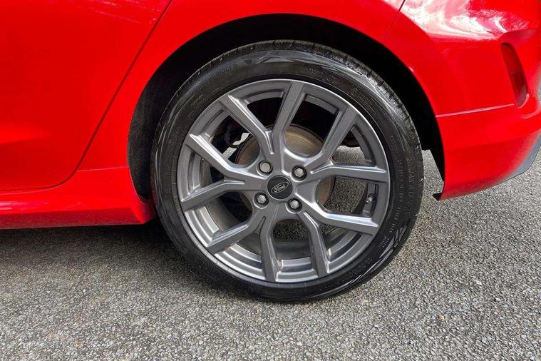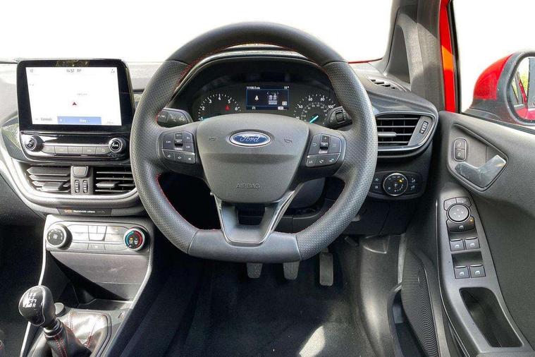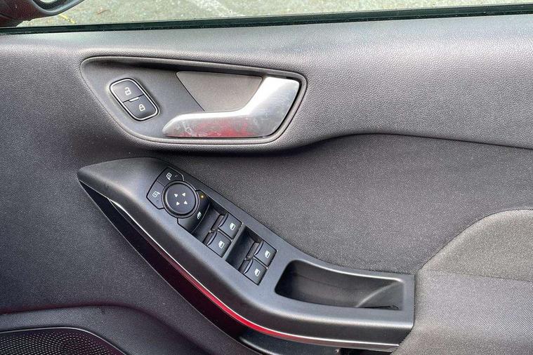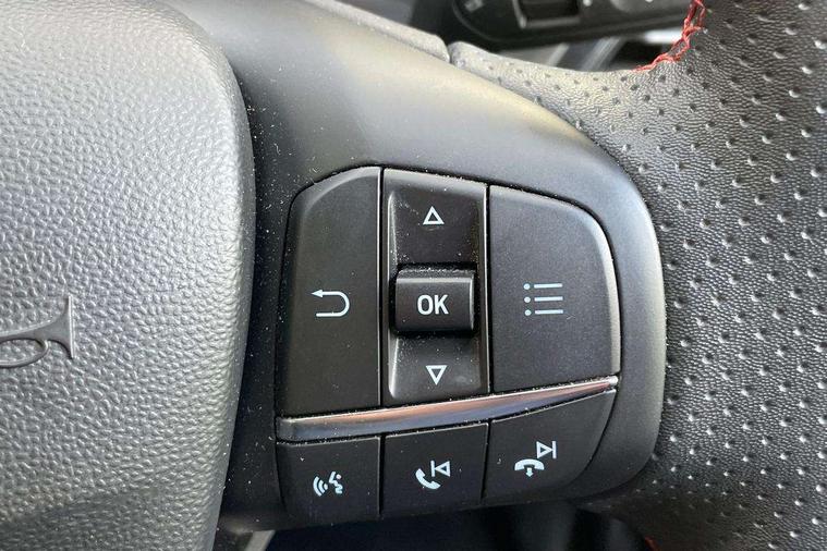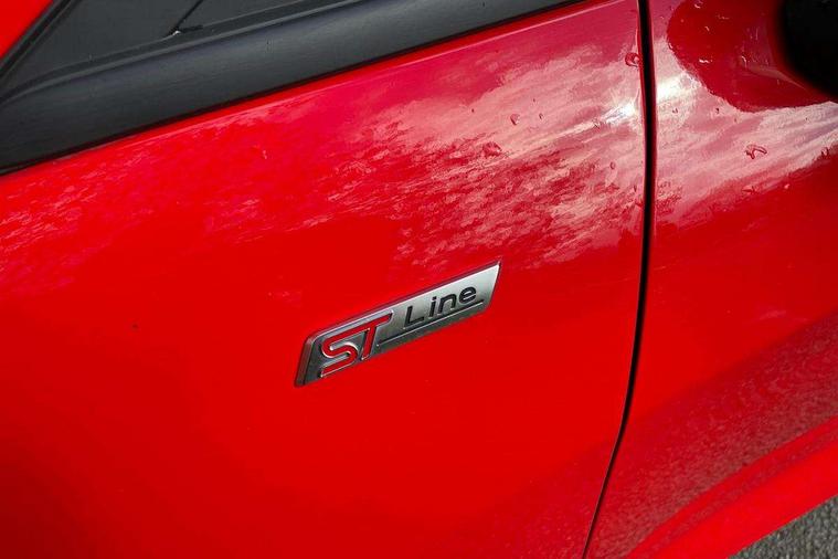 4.2" Colour TFT Ice blue illumination analogue cluster, Driver alert system, Electric power steering, Ford easy fuel, Lane keep assist, Lane keeping aid, Rear parking distance sensors, Selectable drive modes (Normal, Sport, Track), Trip computer, Sports suspension, 3rd brake light, Auto high beam, Automatic headlights, Body colour bumpers, Body colour large rear spoiler, Body coloured electrically operated with side indicators, Electric front windows/one touch facility, Electric rear windows, Quickclear heated windscreen, Rain sensing wipers and auto dimming rear view mirror, Rear privacy glass, Rear side wing doors, Rear wiper, Unique ST-Line grille, full bodystyling kit and large body coloured rear spoiler, 3 rear headrests, 3 seat bench in 2nd row, Adjustable head restraints, Black headlining, Centre console with opening armrest, 2x cupholders, 12v and USB, Cloth upholstery with red stitching, Leather gear knob, Manual 2 way passenger seat adjust, Manual 4-way driver seat adjust, Manual air conditioning, Premium floor mats, Sensico wrapped steering wheel, Single front passenger seat, 3 point seatbelts on all rear seats, Electronic stability control with hill start assist, Front and rear seat belt warning, Manual child lock in rear doors, Tyre pressure monitoring system, Keyless start with 'Ford Power' starter button, MyKey system, Remote central locking, Thatcham alarm with power door dead locks, 17" 5x2 spoke alloy wheels with rock metallic finish,