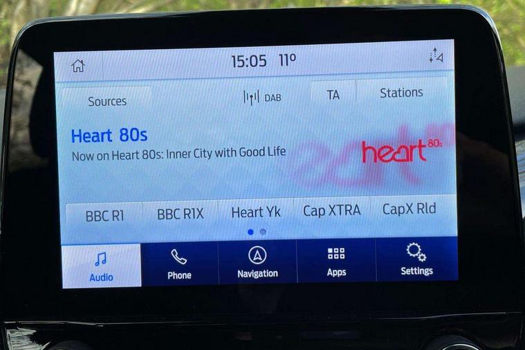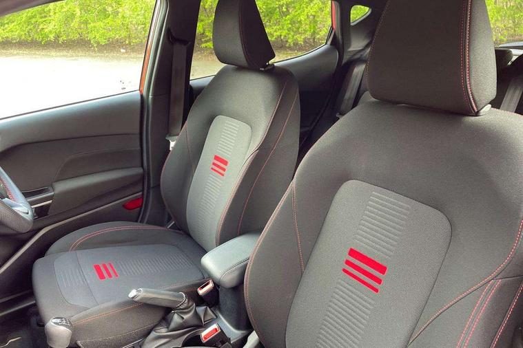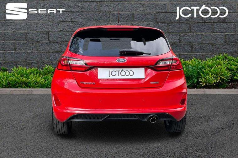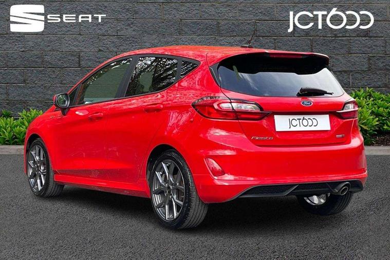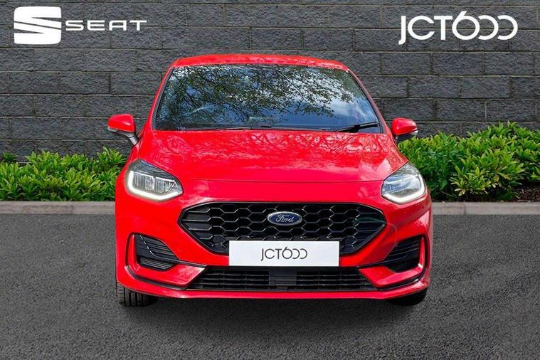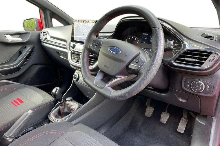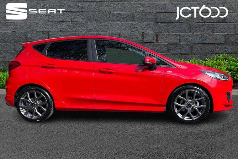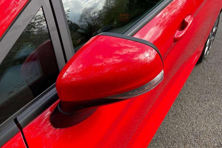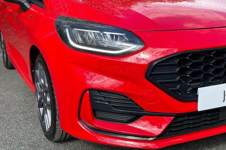 4.2" Colour TFT Ice blue illumination analogue cluster, Driver alert system, Electric power steering, Ford easy fuel, Lane keep assist, Lane keeping aid, Rear parking distance sensors, Selectable drive modes (Normal, Sport, Track), Trip computer, Sports suspension, 3rd brake light, Auto high beam, Automatic headlights, Body colour bumpers, Body colour large rear spoiler, Body coloured electrically operated with side indicators, Electric front windows/one touch facility, Electric rear windows, Quickclear heated windscreen, Rain sensing wipers and auto dimming rear view mirror, Rear privacy glass, Rear side wing doors, Rear wiper, Unique ST-Line grille, full bodystyling kit and large body coloured rear spoiler, 3 rear headrests, 3 seat bench in 2nd row, Adjustable head restraints, Black headlining, Centre console with opening armrest, 2x cupholders, 12v and USB, Cloth upholstery with red stitching, Leather gear knob, Manual 2 way passenger seat adjust, Manual 4-way driver seat adjust, Manual air conditioning, Premium floor mats, Sensico wrapped steering wheel, Single front passenger seat, 3 point seatbelts on all rear seats, Electronic stability control with hill start assist, Front and rear seat belt warning, Manual child lock in rear doors, Tyre pressure monitoring system, Keyless start with 'Ford Power' starter button, MyKey system, Remote central locking, Thatcham alarm with power door dead locks, 17" 5x2 spoke alloy wheels with rock metallic finish,