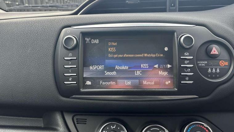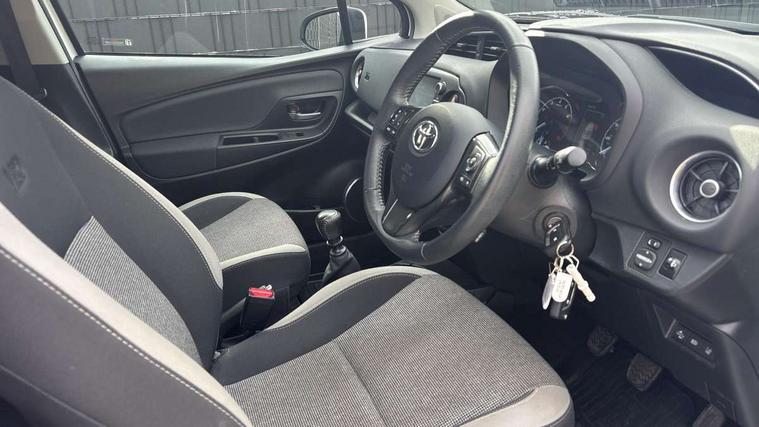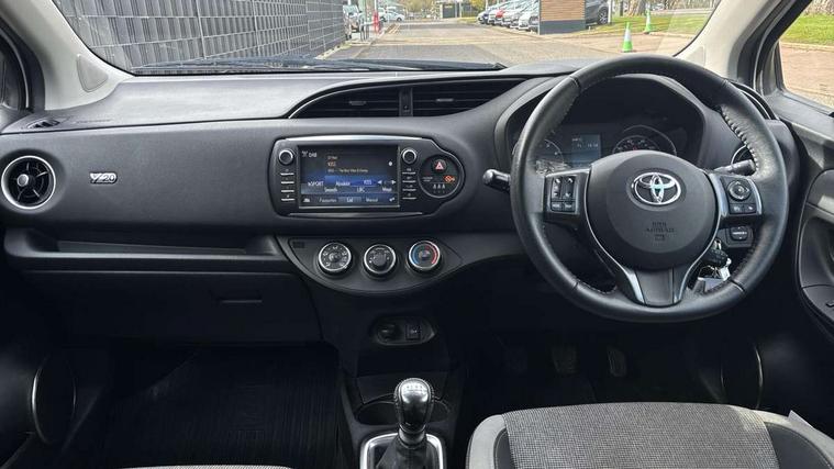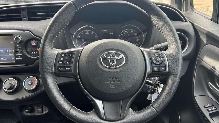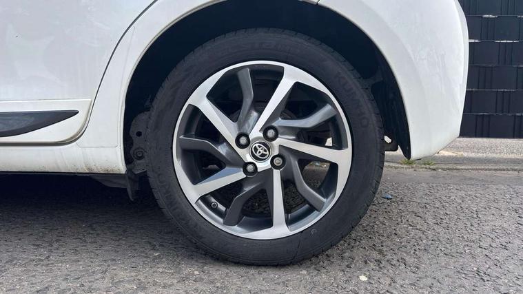 4.2" coloured LED TFT multi information display, Analogue speedometer, Analogue tachometer, Auto speed limiter, Bluetooth connectivity, Cruise control, External temperature gauge, Fuel indicator with low level warning, Key reminder warning, Lights on warning, Multi information display switches on steering wheel, Power Steering, Reversing camera, Trip computer, 6 speakers, Auxiliary input socket, Steering wheel mounted audio/telephone switches, Toyota Touch 2 with DAB, USB connection, Auto up and down function on drivers window, Automatic wipers, Bi-tone grey roof, Black lower front grille, Body colour bumpers, Body colour door handles, C pillar decal, Daytime running lights, Electric adjustable heated door mirrors, Electric front windows, Follow me home headlights, Front fog lights, Grey contrasting colour door mirrors, Grey door moulding, Grey door side sills, Grey front grille and fogs, Headlight cut-off reminder, LED High mounted stop lamp, Manual dimming rear view mirror, Privacy glass, Projector headlights, Rain sensitive windscreen wipers, Rear combination lights bulb type, Rear window defogger, Rear wiper, Turning signal integrated indicators in door mirrors, Y20 Badging, 12v power outlet - front, 3 adjustable rear headrests, 3 spoke leather steering wheel, 60/40 split folding rear seat, Active headrests, Boot light, Data Communication Module (DCM) connected services, Driver and front passenger personal light, Driver and front passenger Whiplash Injury Lessening seats, Fabric upholstery, Front and rear cup holders, Front map reading lights, Front seats with lumbar support, Glovebox, Height adjustable driver's seat, Height adjustable front head restraints, Illuminated entry system, Isofix seat fixing, Leather gearshift, Manual air conditioning, Map pockets on the backs of the front seats, Pollen filter, Removable rear parcel shelf, Sliding front seats, Soft touch inner door garnish, Tilt/telescopic steering column, Y20 badge interior and in seat trim, 3 point seatbelts on all rear seats, ABS+EBD+Brake assist, Collision mitigation braking system, Emergency brake light system (EBS), Front passenger airbag on/off switch, Front seatbelt reminder, Height adjustable front seatbelts with pre-tensioners and load limiters, Hill start assist control (HAC), Rear child proof door locks, Rear seat belt reminder, Road sign information display, Seatbelt warning lamp and buzzer, Supplemental restraint system (SRS) airbags - 7 airbags including driver, front passenger, curtain, side and knee airbags, Toyota safety sense including Road sign assist, Pre collision system, auto high beam and lane departure alert), Tyre pressure warning system, Vehicle stability control VSC + traction control, Engine immobiliser, Power and remote door locking, Interior satin accents, Soft touch instrument panel, 16" 10 spoke grey machined alloy wheels, Space saver spare wheel,