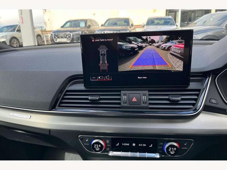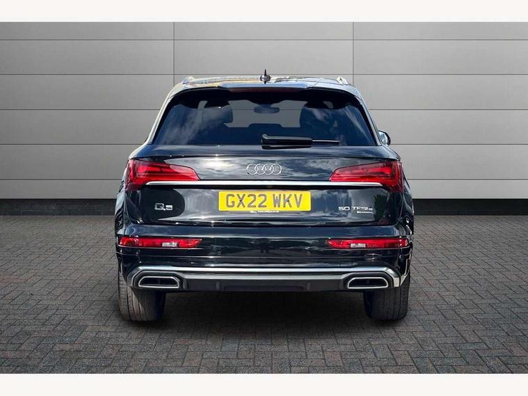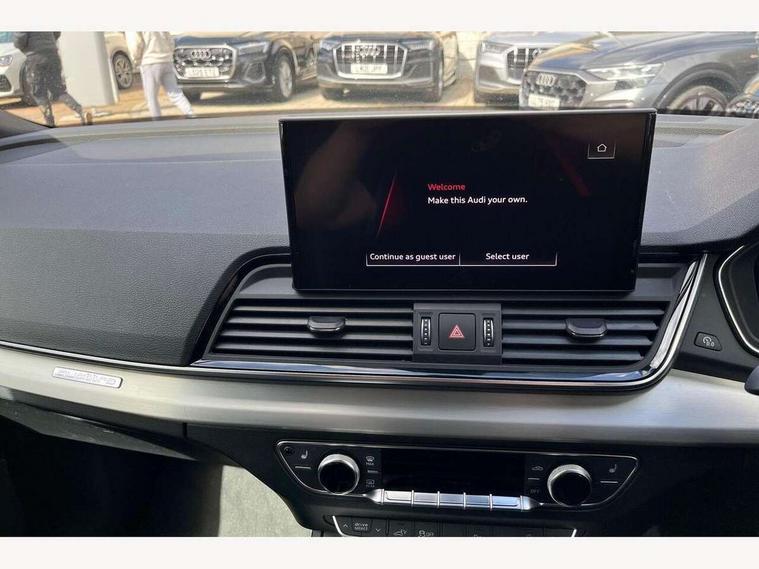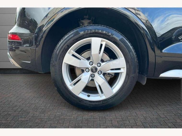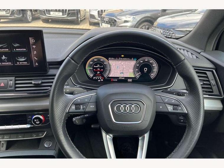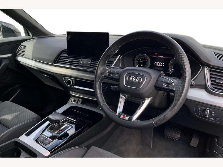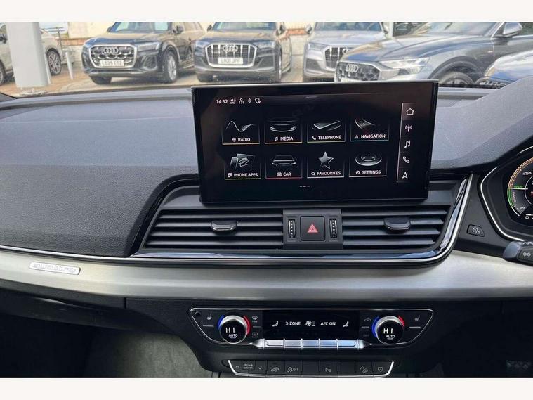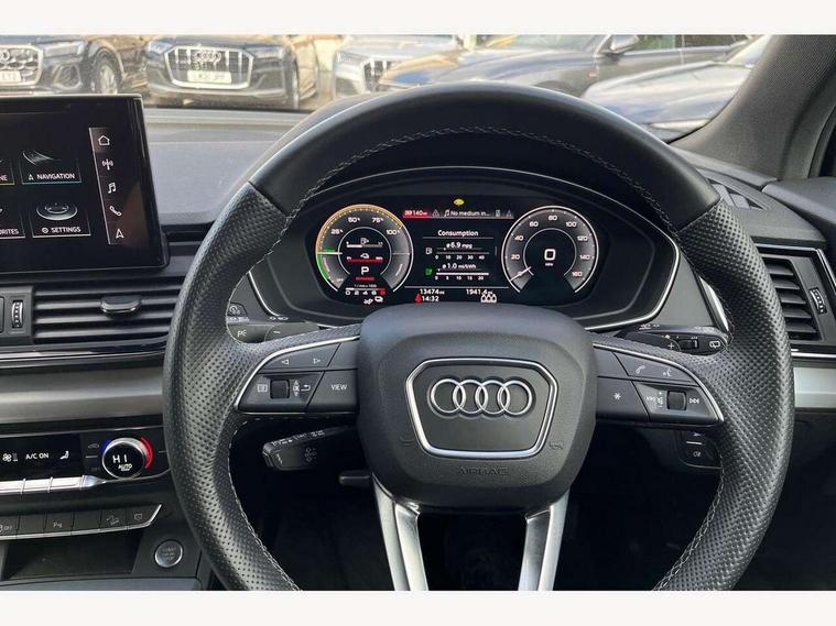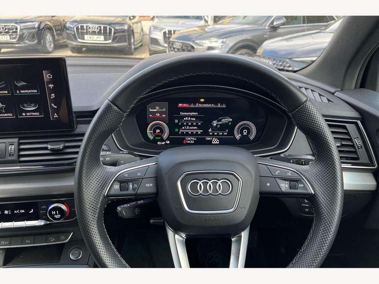 Audi connect safety and service (e-call), Audi connect with Amazon Alexa Integration, Audi drive select, Audi virtual cockpit plus with 12.3" screen and three different layout designs, Audi wireless smartphone interface, Automatic start-stop system with coasting functionality and efficiency programme, Bluetooth interface, Electro - mechanical power assisted steering, MMI navigation plus with 10.1" touch screen, Power tailgate, Reversing camera, Service interval indicator, Voice control system with Audi hotword activation "Hey Audi", 3 pin 10 amp domestic charging cable, 7.4 kW onboard charger, Dynamic suspension, Quattro on demand, Type 2 mode 3 22kW 32 amp charging cable, Type 2 socket for AC charging, 2 x USB charging port with aux input socket, DAB Digital radio, 3rd brake light, Acoustic windscreen, Aluminium roof rails, Audi matrix LED headlights with dynamic front and rear indicators, Auto dimming rear view mirror, Automatic headlights and windscreen wipers, Body colour bumpers, Body colour door mirrors, Body colour rear diffuser with matt aluminium silver surrounds, Body colour underbody protection, Chrome plated exhaust trims, Daytime running lights, Door sills in Selenite silver, Electric adjustable/heated/folding door mirrors, Front air inlet surrounds in aluminium, Front and rear electric windows, Front radiator grille in honeycomb design, Headlight washers, Lower bumpers painted in contrast Manhattan grey, Rear chrome trim strip below lights, Rear privacy glass and rear side windows, Rear side wing doors, Rear spoiler, Rear wiper, Roof bars, S Line badges on the front wings, S Line front and rear bumpers, S Line side skirts, 3 rear headrests, 40:20:40 split folding 3 rear bench seat in 2nd row with rear centre armrest, Black cloth headlining, Comfort front centre armrest, Contrast stitching on seats, steering wheel and gear lever gaiter, Deluxe 3 zone electronic climate control, Front/rear floor mats, Gear lever in black leather, Heated front seats, Height adjustable front head restraints, Height/reach adjustable steering column, Illuminated door sill trims with S logo, ISOFIX child seat mounting and top tether, Manual seat adjustment with 4-way electric lumbar support, Rear seat bench plus, Single front passenger seat, Sunvisors with vanity mirrors, Trunk roller cover, High gloss pack - Q5, LED interior light pack - Q5, 3 point seatbelts on all seats, 6 airbags - Driver, front passenger, curtain and side airbags, Electrically operated child locks on rear doors, Electromechanical parking brake, Electronic stabilisation control including ABS, ASR and EDL, Front passenger airbag deactivation, Hill descent control, Hill hold assist, Multi collision brake assist, Pop-up bonnet for pedestrian protection, Pre sense city, Seat belt force limiter, Seatbelt monitoring, Tyre pressure warning, Warning triangle and first aid kit, Anti theft alarm, Anti-theft wheel bolts, Keyless Go access/ignition system, Matt brushed aluminium inlays, Tool kit, Tyre repair kit,