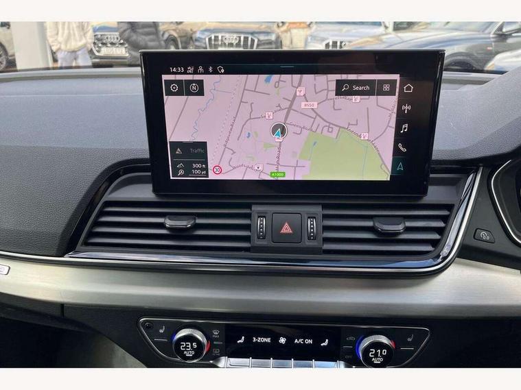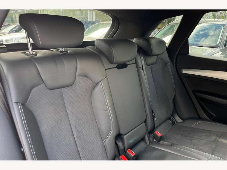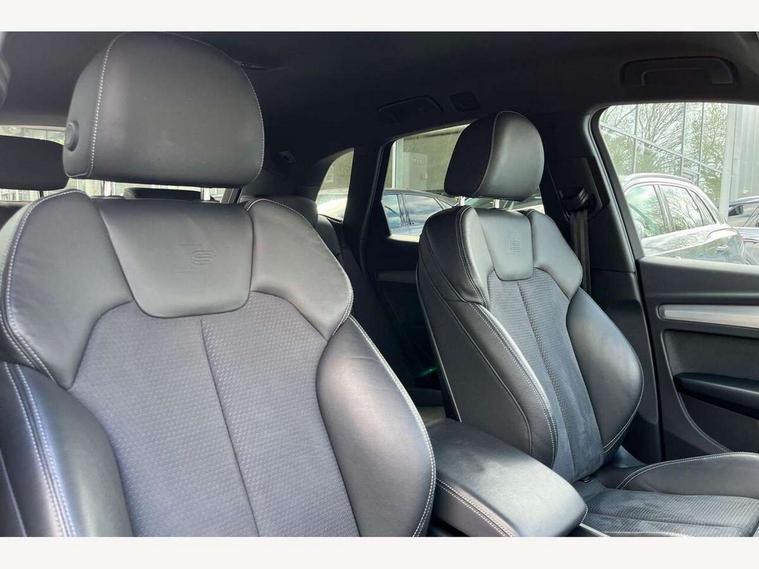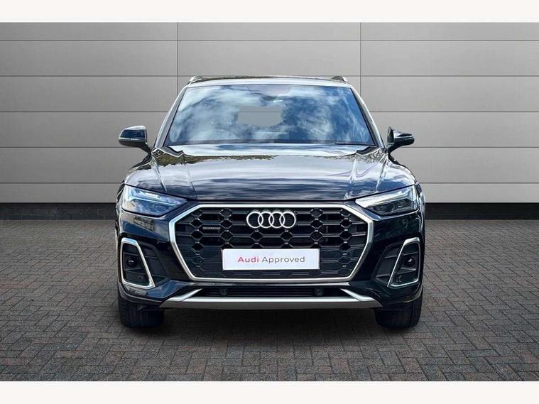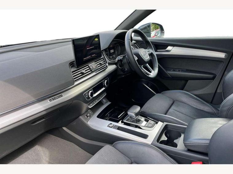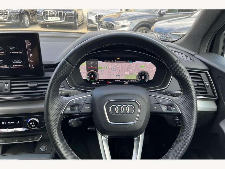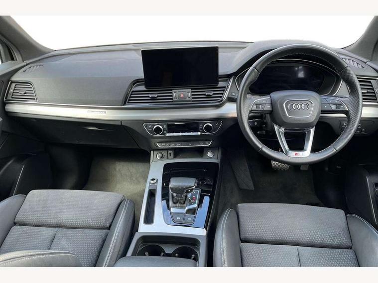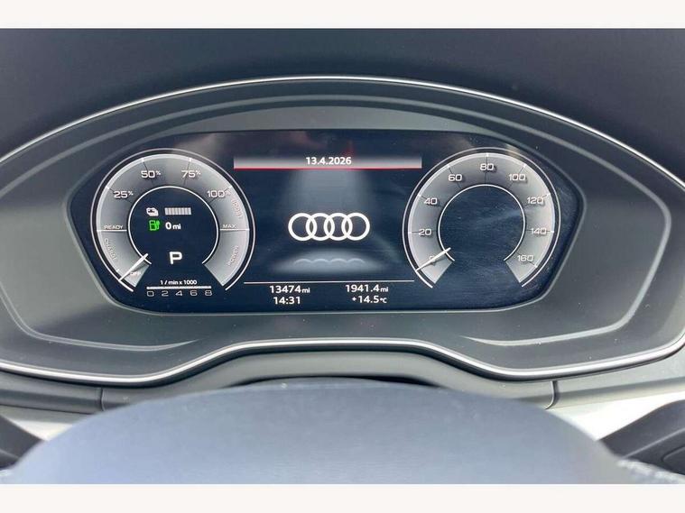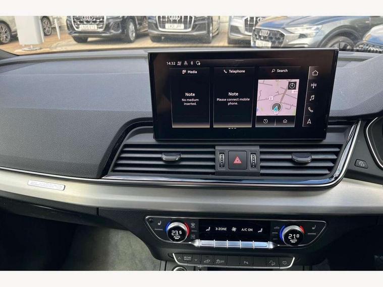 Audi connect safety and service (e-call), Audi connect with Amazon Alexa Integration, Audi drive select, Audi virtual cockpit plus with 12.3" screen and three different layout designs, Audi wireless smartphone interface, Automatic start-stop system with coasting functionality and efficiency programme, Bluetooth interface, Electro - mechanical power assisted steering, MMI navigation plus with 10.1" touch screen, Power tailgate, Reversing camera, Service interval indicator, Voice control system with Audi hotword activation "Hey Audi", 3 pin 10 amp domestic charging cable, 7.4 kW onboard charger, Dynamic suspension, Quattro on demand, Type 2 mode 3 22kW 32 amp charging cable, Type 2 socket for AC charging, 2 x USB charging port with aux input socket, DAB Digital radio, 3rd brake light, Acoustic windscreen, Aluminium roof rails, Audi matrix LED headlights with dynamic front and rear indicators, Auto dimming rear view mirror, Automatic headlights and windscreen wipers, Body colour bumpers, Body colour door mirrors, Body colour rear diffuser with matt aluminium silver surrounds, Body colour underbody protection, Chrome plated exhaust trims, Daytime running lights, Door sills in Selenite silver, Electric adjustable/heated/folding door mirrors, Front air inlet surrounds in aluminium, Front and rear electric windows, Front radiator grille in honeycomb design, Headlight washers, Lower bumpers painted in contrast Manhattan grey, Rear chrome trim strip below lights, Rear privacy glass and rear side windows, Rear side wing doors, Rear spoiler, Rear wiper, Roof bars, S Line badges on the front wings, S Line front and rear bumpers, S Line side skirts, 3 rear headrests, 40:20:40 split folding 3 rear bench seat in 2nd row with rear centre armrest, Black cloth headlining, Comfort front centre armrest, Contrast stitching on seats, steering wheel and gear lever gaiter, Deluxe 3 zone electronic climate control, Front/rear floor mats, Gear lever in black leather, Heated front seats, Height adjustable front head restraints, Height/reach adjustable steering column, Illuminated door sill trims with S logo, ISOFIX child seat mounting and top tether, Manual seat adjustment with 4-way electric lumbar support, Rear seat bench plus, Single front passenger seat, Sunvisors with vanity mirrors, Trunk roller cover, High gloss pack - Q5, LED interior light pack - Q5, 3 point seatbelts on all seats, 6 airbags - Driver, front passenger, curtain and side airbags, Electrically operated child locks on rear doors, Electromechanical parking brake, Electronic stabilisation control including ABS, ASR and EDL, Front passenger airbag deactivation, Hill descent control, Hill hold assist, Multi collision brake assist, Pop-up bonnet for pedestrian protection, Pre sense city, Seat belt force limiter, Seatbelt monitoring, Tyre pressure warning, Warning triangle and first aid kit, Anti theft alarm, Anti-theft wheel bolts, Keyless Go access/ignition system, Matt brushed aluminium inlays, Tool kit, Tyre repair kit,