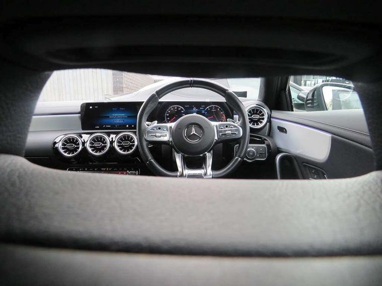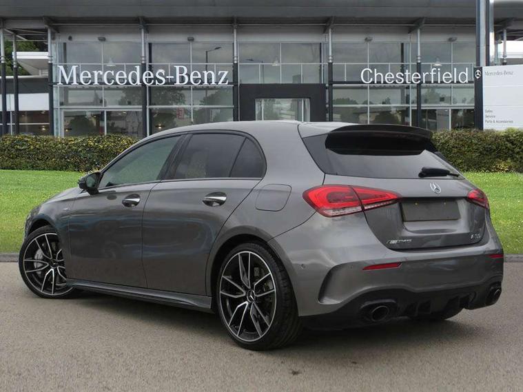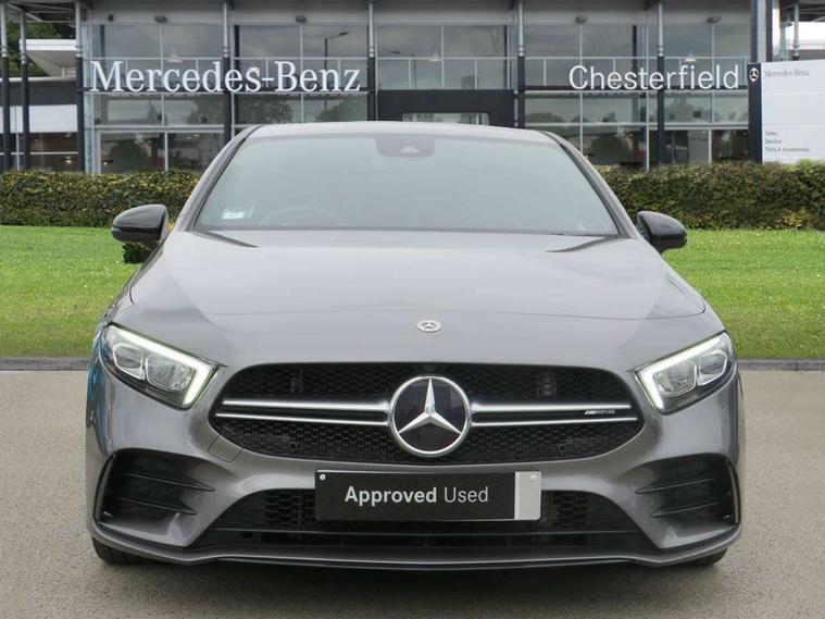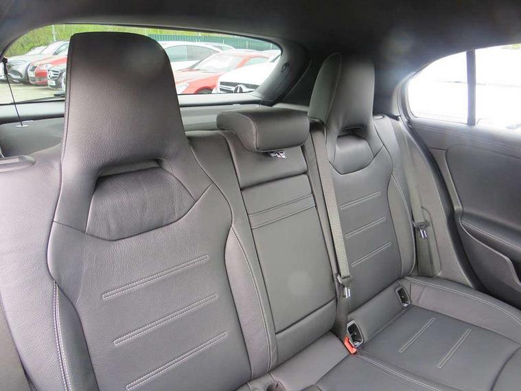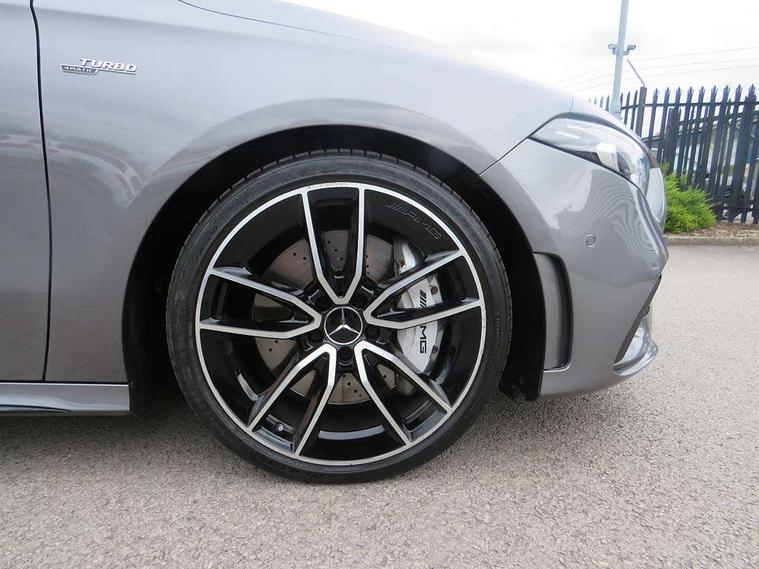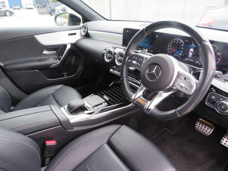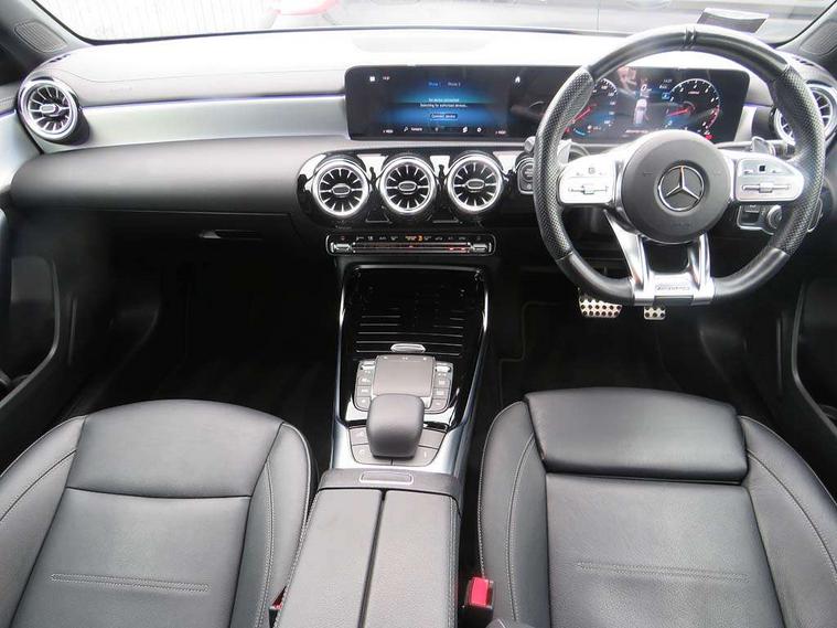 Ultrasonic sensors positioned in the front and rear bumpers, 10.25" Digital instrument cluster display screen, 10.25" media display, 180 degree rear view camera with parking guidelines, Active parking assist with visual and audible warning of detected obstacles, Attention assist, Brake pad wear indicator warning light, Car wash mode, Cruise control + speed limiter, Direct steering, Dual bluetooth interfaces, DYNAMIC SELECT with driving programs (Slippery, Comfort, Sport, Sport+ and Individual), ECO start/stop function, Fluid level warning indicator for fuel, oil, coolant and washer fluid, Hard-disk navigation, Hey Mercedes Voice activation, Lamp failure indicator, Lane keeping system, Mercedes me connect including emergency call system, accident recovery, breakdown management and maintenance, Mercedes me remote services, Outside temperature gauge, Owners manual in English, Pre-installation for car sharing, Preinstallation for Mercedes Benz link, Service indicator (ASSYST), Smartphone integration with Apple CarPlay and Android auto, Speed limit assist, Speed sensitive power steering, Trip computer, AMG performance suspension, Rear axle multi-link, 2 USB ports (type C) in rear stowage compartment and one in front of center console, 6 speakers, DAB Digital radio, MBUX multimedia system with DAB digital radio and touchpad including satellite navigation, Mercedes-Benz sound system - 100W, 4 Electric Front and Rear windows, Adaptive brake lights, AMG bodystyling - Front apron with splitter in chrome, rear apron with chrome trim and chrome visible trim elements in tailpipe, AMG Front apron with flics as air deflector elements on the outer air intakes, AMG radiator grille with twin blade lamella and AMG Lettering, AMG Rear apron with specific diffuser look with four vertical fins and two round chrome plated tailpipe trim elements with a diameter of 90 mm, AMG spoiler lip on roof, AMG Sports exhaust system with two round tailpipes attached in rear apron, Automatic headlights, Black weather strip, Body colour bumpers, Body colour door handles with chrome inserts, Body colour side skirt, Electric adjustable and heated door mirrors with integrated LED side indicators, Front wings wheel arches with TURBO 4MATIC lettering, Headlamp assist automatic headlamp activation, Heated glass rear windscreen + timer control, LED High level third brake light, LED high performance headlamps with integrated LED daytime running lights, LED tail lamp, Privacy glass, Radio aerial, Rain sensing windscreen wipers with two sensitivity settings, Rear fog lights, Rear side wing doors, Rear wiper, Trim elements on louvres in outer air inlets in high gloss black, Wider wheel arches for AMG wheels, 3 seat bench in 2nd row, 40:20:40 split folding rear seats, AMG Performance steering wheel in nappa leather, Auto Mercedes-Benz child seat recognition sensor, Black air vents with surround in silver chrome, Black roof lining, Brushed stainless steel sports pedals with rubber studs, Controller on centre console with chrome surround, Floor mats with AMG lettering, Front centre armrest with storage compartment, Front seat backs luggage nets, Heated front seats, Height/reach adjustable steering column, Illuminated AMG front door sills with changeable cover, Interior lighting - 64 colour Ambient lighting, Interior mirror with reading lamps in black and frameless, ISOFIX and top tether child seat fixing points in two outer rear seats, Manual height adjustable front seats, Rear armrest with 2 cupholders, Rear head restraints, Seat occupancy sensor for front passenger seat, Silver coloured aluminium gear shift paddles on steering wheel, Single front passenger seat, Sports seats with integrated headrests, Stowage compartment in centre console with retractable cover, Sunvisors with illuminated vanity mirrors, Touchpad on center console, Twin front cupholders, Two zone thermotronic luxury automatic climate control, AMG night pack - A Class, Light and sight pack - A Class, Mirror package - A Class, Seat comfort pack - A Class, 3 rear 3 point seatbelts, ABS with Brake Assist, Active bonnet, Active brake assist includes forward collision warning system with autonomous braking, Adaptive brake assist with hold function and hill start assist, Black seatbelts, Childproof locks manually operated for rear doors and electrically operated for rear power windows, Crash responsive emergency lighting, Driver and passenger head and side airbags, Drivers knee airbag, Dual stage driver/passenger airbags, Electronic parking brake, ESP curve dynamic assist, ESP with ASR, Front and rear seatbelt reminder, Front brake calipers with AMG lettering, Perforated front brake discs, Tyre pressure monitoring system, Warning triangle and first aid kit, Window airbags, Alarm system/interior protection/immobiliser, Keyless entry lock/unlock, Keyless Go, Remote central locking and crash sensor with emergency opening function, Urban guard vehicle protection system with immobiliser and interior protection, Light aluminium with longitudinal grain interior trim, 19" AMG 5 twin spoke light alloy wheels, Summer tyres, Tirefit sealant kit,