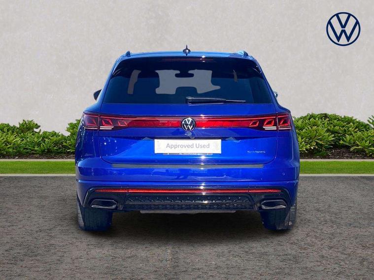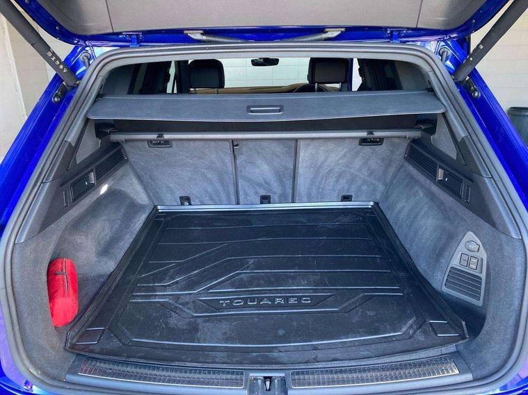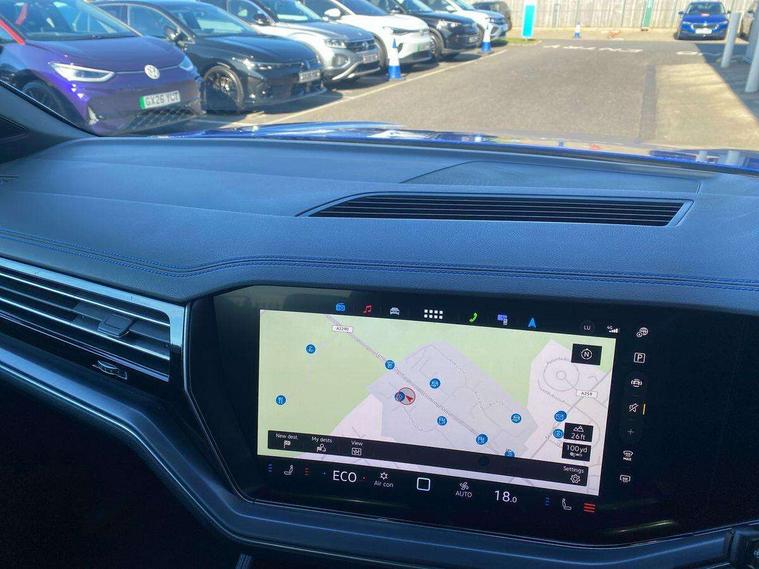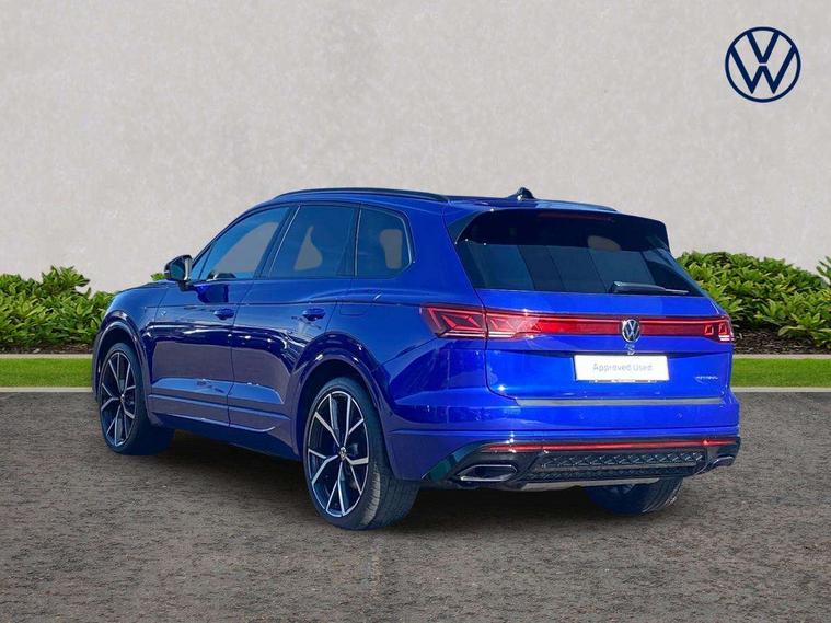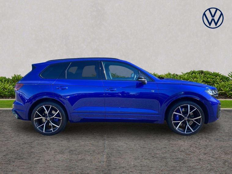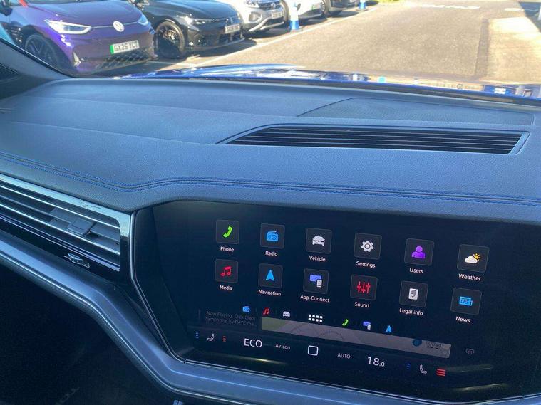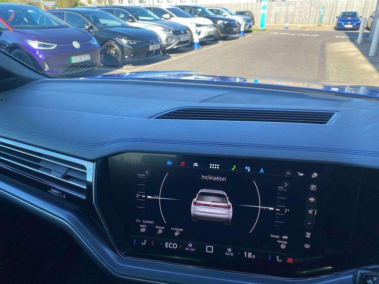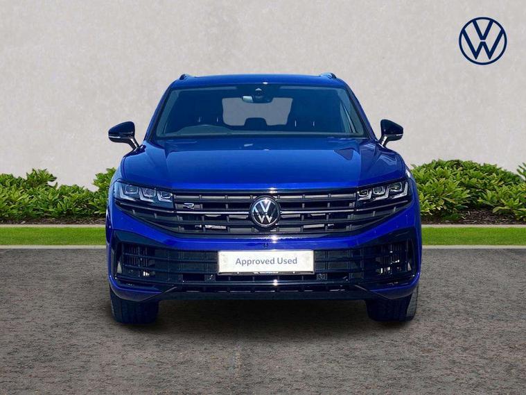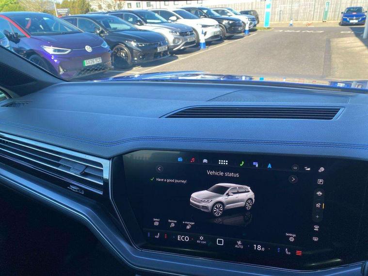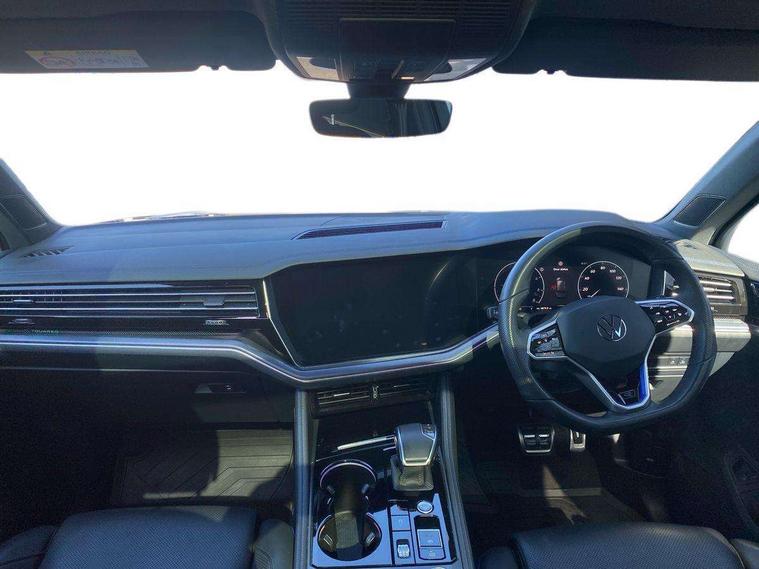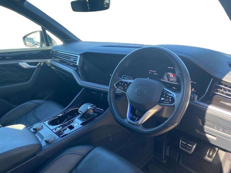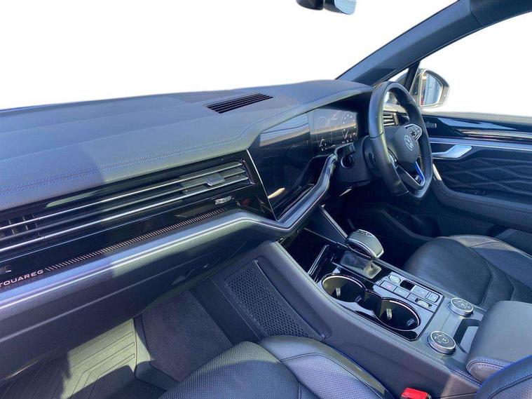 15" Screen Top infotainment system Premium (MIB3), Adaptive cruise control, Advanced driver attention and drowsiness monitor, Driver profile selection, Dynamic road sign display, E-Sim card for online connectivity, eCall emergency system, Innovision cockpit, Intelligent park assist, Mobile phone interface with inductive charging, Multi-colour Active Info display, Park Assist - Sensor controlled steering aid to assist parallel or bay parking, PAS, Warning signal and warning light for front and rear seatbelts not fastened, Wireless app connect, Adaptive chassis control, Air suspension, Charging cable - Mode 2 / 10-amp / 2.3 kW, Charging cable - Mode 3 / 32-amp / 7.2 kW, Standard electronic engine sound actuator, DAB Digital radio, Diversity antenna for AM/ FM reception, We Connect and We Connect Plus functionality, Automatic coming/leaving home lighting function, Automatic headlights, Black door mirrors, Black style comfort bumpers, Dynamic headlight range control with dynamic cornering light, Electric front tilt/slide panoramic sunroof and fixed rear sunroof, Electrically power adjustable, heated, folding, auto dimming, front passenger exterior door mirror lowering function, External USB type C socket and charging sockets, Gloss black roof rails, HD LED Matrix beam plus digital headlight projection with variable light distribution, Headlight washers, Heat insulating darkened glass in side and rear windows, Heated windscreen washer jets, Highway light, LED 3rd brake light, LED daytime running lights, LED rear combination lamp with variable lighting functions and special styling, Poor weather light, Rear exhaust tailpipe, Rear fog light with back up light on both sides, Rear light bar and illuminated logo, Rear side wing doors, Rear wiper, Stainless steel door sill protection, 12V socket in centre console, 3 rear headrests, 3 seat bench in 2nd row, 30 colours options interior ambient lighting, 4 zone climate control, Additional Interior Lighting, Airbag label on sun visor and B-pillar, Brushed stainless steel pedals, Door and side trim panel with Leather quilting, Double sun visors with illuminated vanity mirrors, Front + rear carpet mats, Front centre armrest, Illuminated scuff plates in door apertures, Leather wrapped multifunction sports steering wheel, heated, with touch control and shift paddles, Mechanical rear seat release, Power adjustable lumbar support in front, Power seats in front, right side with memory features and seat cushion depth adjustment, Puglia leather upholstery with "R" ergoComfort, Rear seat backrest and split folding with center armrest, Single front passenger seat, Extra acoustics pack - Touareg, Memory pack plus - Touareg, 3 point seatbelts, outer rear with ECE lable, ABS, Child locks on rear doors, Curtain airbags, Disc brakes in front blue with R-Logo, Disc brakes in rear blue, Driver and front passenger safety-optimised head restraints, Driver/Front Passenger airbags, Extended pedestrian protection measures, Front assist, Front seat side impact airbags, Generative braking with start and stop system, Height adjustable 3 point front seatbelts with pre tensioners, Passenger airbag deactivate switch, Three 3 point rear seatbelts, Two tone horn, Tyre pressure loss indicator, Warning triangle and first aid kit, Alarm system with interior protection, Easy open and close sensor controlled luggage compartment opening and closing with remote unlocking, Keyless Access Keyless locking and starting system with SAFELOCK, Aluminium decorative inserts, Black decorative trims, Gloss black decorative inserts in centre console, 285/35 R22 106Y XL Low rolling resistance tyres, Tool kit, Tyre mobility kit including compressor and sealing foam,