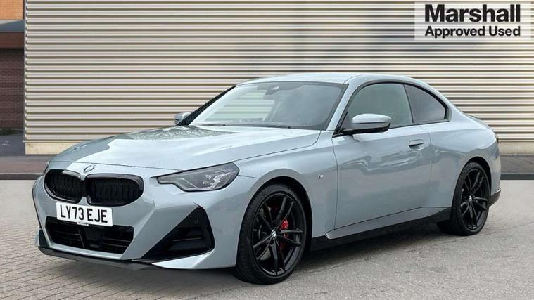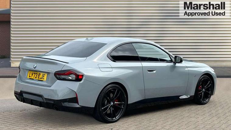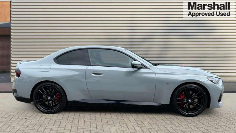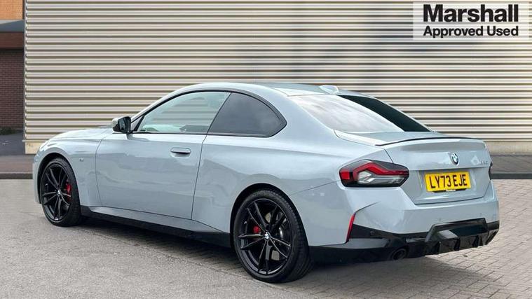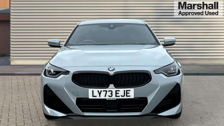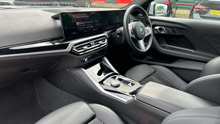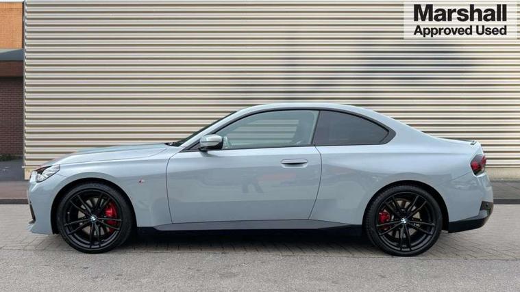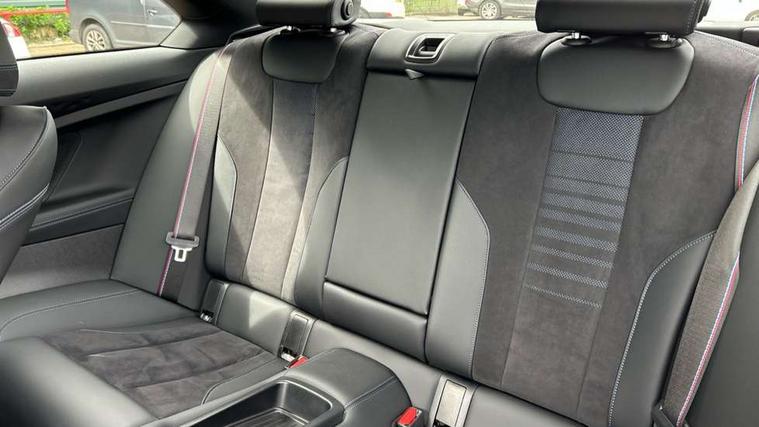 2 USB connections for charging and transferring data, 4G LTE connectivity with hard wired 4G network sim card, Attentiveness assist, Bluetooth with USB, BMW ConnectedDrive online services, BMW Intelligent Personal Assistant, BMW operating system 8 with variable, configurable widgets display information in real time, BMW Teleservices, Check Control warning system for monitoring of lights and door/luggage compartment open warning, Direct selection buttons, Drive off assistant, Eco pro mode, Electric power steering, Front and rear parking sensors, Front/rear Parking distance control, iDrive controller with turn and press function, Integrated owners handbook, Intelligent functions, Live cockpit plus with nav function 12.3" instrument cluster and 14.9" centre display, Oil sensor for level and grade, Optimum shift indicator, Personal Profile, Touch operation on control display, Variable sport steering, Widescreen multi-media display, WiFi interface for wireless connection of mobile terminal devices, Aluminium lightweight construction, Balancer shaft, BMW TwinPower Turbo four-cylinder petrol engine, Double VANOS, Drive performance control with ECO PRO comfort + sport mode, Electronic differential lock, High precision injection, M sport suspension, Petrol Particulate Filter, Sport automatic steptronic transmission with gearshift paddles, manual gearshift time display, launch control, coasting idle ECO PRO/COMFORT modes, Twin scroll turbocharger with Valvetronic, DAB tuner, Acoustic windscreen wipers for reduced driving noise, Adaptive LED Headlights, Automatic windscreen wipers and automatic headlight, Automatically dimming rear view mirror, Body colour door handles flush with door surface, Body colour door mirrors, Body colour front and rear bumpers, Daytime running lights, Electric windows - front and rear, with open/close fingertip control and trap release, Exhaust tailpipes x2 - 90mm in left and right, Fading support, Front and rear bumper system with replaceable deformation elements, Front door sill finishers in black plastic with BMW designation, Front windscreen wipers with integrated washer jets, Green tinted heat protection glazing, High beam assistant, High gloss black sill, bumper trim sides and diffuser insert, High gloss shadowline exterior trim in mirror triangle cover, mirror cover panel, mirror bezel and window border, High level third brake light, Indicators integrated int mirror housing, LED registration plate light, LED technology rear tail lights, brake lights and turn indicators, Lightweight engineering, Model designation on right side of tailgate, One piece kidney grille with hight gloss chrome surround, Rear boot, Rear fog lights, Reversing light in rear light cluster, Shark fin antenna, Single part LED rear lights with smoked glass components, Trailer stabilisation logic, Visible VIN plate, 12V power socket in front centre console with blanking plug, 2 cupholders in front centre console, 2 zone automatic air conditioning, Ambient lighting, Compartment in front of cupholder, Conditioned based service, Driver seat backrest width adjustment, Front and rear side armrests integrated into door trim, Front armrest, Front door pockets, Front head restraints, Front sport seats, Heated front seats, Illuminated glove compartment with separate small compartment, M headliner Anthracite, M sport leather steering wheel, Manually adjustment steering wheel column, Rear seat backrest with manual 40:20:40 split folding, Rear seat centre foldable armrest with integrated cup holder, Single front passenger seat, Storage compartment between rear seats, Storage tray and compartment with cover in centre console, Sun visors with vanity mirrors and insert tab, Through loading system with 40/20/40 split folding 2 rear seat in 2nd row, Two folding rear seat headrests, Velour floor mats, Additional storage compartment pack without USB - 2 Series Coupe, Connected pack professional - 2 Series Coupe, Interior and exterior mirror pack - 2 Series Coupe, M Sport exterior styling aerodynamics pack - 2 Series Coupe, 2 tone horn, Anti lock braking system (ABS) with cornering brake control, Automatic Stability Control (ASC), BMW emergency call, Brake drying, Child seat ISOFIX attachment for the two outer rear seats, Crash sensor activating of airbags, Unlocking doors, hazard warning lights, fuel cut off, interior lighting+activation of safety battery terminal clamp, Deactivation of fuel pump in the event of a crash, Driver and front passenger airbags, Driver and front passenger side airbags, integrated in the door side seat backrest bolsters for all seat variants, Dynamic brake control, Dynamic stability control + (DSC+), Dynamic Traction Control - DTC, Electrically operated hand brake including automatic hold function and automatic release when driving off, Front and rear disc brakes, Head airbags for all 4 outer seats, Manual deactivation of front passenger airbag, Seat belt security check for driver and front passenger, Seatbelt warning, Side impact protection, Three point seat belts on 4 seats including front belt stopper, pyrotechnic belt tensioners and belt force limiters, Tyre pressure sensor, Warning triangle and first aid kit, Alarm system (Thatcham 1) with remote control and electronic engine immobiliser, Central locking switch for all doors, fuel filler cap and luggage compartment, Deadlocking function system to all doors, Drive away locking system on all doors and luggage compartment, Locking wheel bolts, Start/Stop button (illuminated) in centre console with keyless engine start and Auto Start-Stop deactivation button, Two remote control key with integrated key - one button for open and close doors/fuel flap/tailgate and separate button for unlock luggage compartment, BMW mobility tyre sealing system, Electrically powered 12V compressor, Reduced rolling resistance tyres,