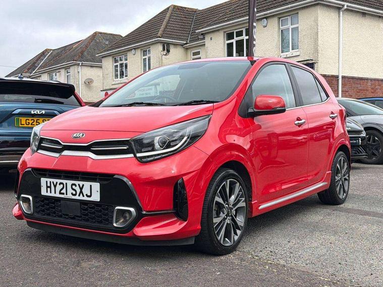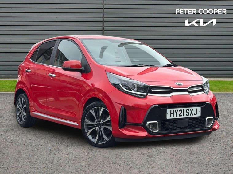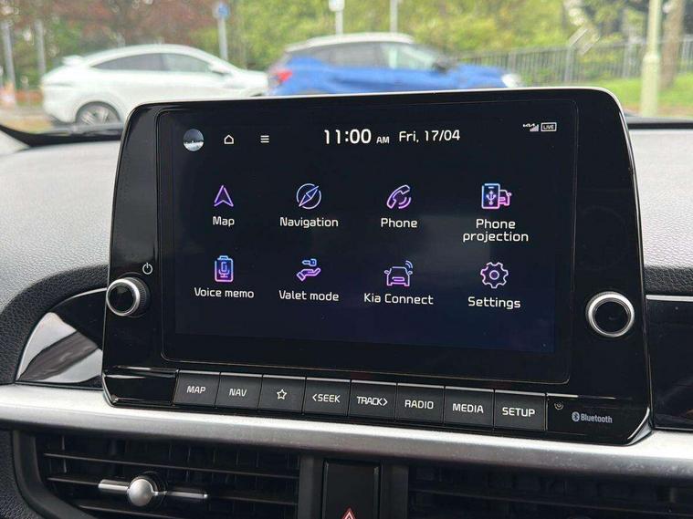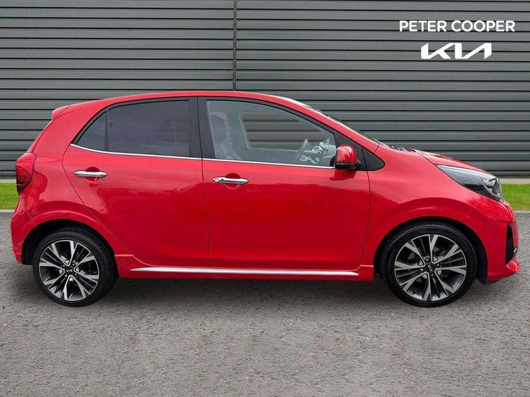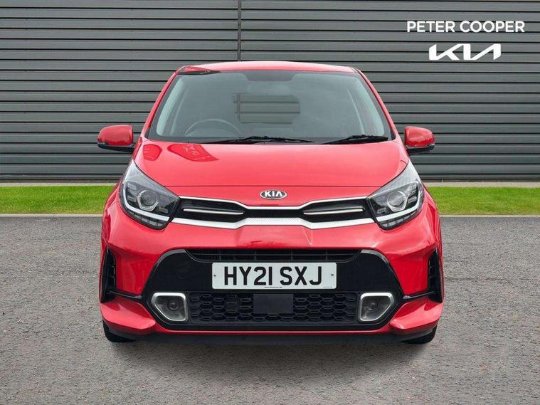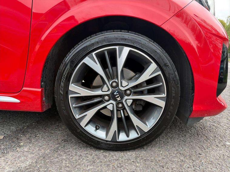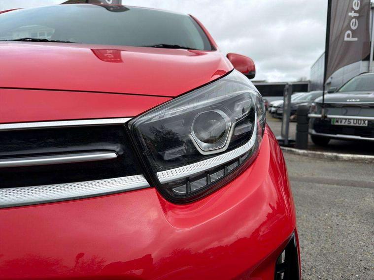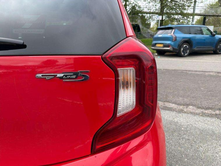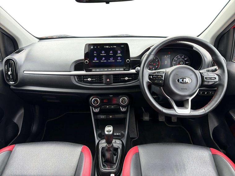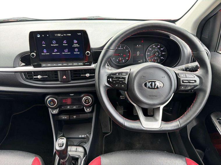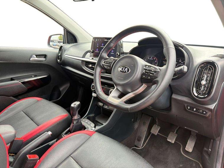 8" touch screen satellite naviagtion with RDS and DAB with telematics, Apple car play/Android Auto with voice control, Cruise control + speed limiter, Emergency stop signalling system, External temperature gauge, Kia connected services featuring TomTom live, Motor driven power steering, Rear parking sensors, Reversing camera system with dynamic guidelines (Integrated into centre fascia screen), Tachometer, Trip computer, Wireless Smartphone charger, 6 speaker audio system, Bluetooth with music streaming, Steering wheel mounted controls, USB ports for connection of a media device, Automatic headlight control system, Bi-function projection headlights, Black grille with silver surround, Body colour bumpers, Body colour side sill mouldings, Body coloured mirrors and chrome exterior handles, Chrome side window trim, Day/night rear view mirror, Electric adjustable/heated/folding door mirrors with LED indicators lights, Front and rear electric windows with drivers's auto up/down function, Front fog lights, Headlamp levelling, Heated rear window, High mount brake light, LED daytime running lights, LED rear fog lights, Privacy glass - Rear windows and tailgate, Rear wash/wipe, Speed variable front wipers, Sports front and rear bumpers with gloss black skid plates twin exhaust, Tinted glass, Visible VIN plate, Welcome and follow-me home light functionality, 1 x rear coat hook, 12V power point front, 3 x passenger assist grips, 60/40 split/folding 2nd row of seats, All round height adjustable headrests, Automatic air conditioning, Black and red accents front door armrest, Centre Console with Storage Box and Sliding Armrest, Cupholders in centre console, D-cut steering wheel with red stitching, Driver and front passenger sunvisors with driver's side illuminated vanity mirrors, Driver seat height adjust, Dual Height Luggage Area Floor, Faux leather upholstery, Front cabin lights, Glovebox, Heated front seats, Heated steering wheel, High gloss lower centre fascia trim, door armrest and air vents, ISOFIX Child seat top tethers and anchor fixings, Leather trimmed steering wheel and gearshift, Luggage area light, Luggage area parcel shelf, Passenger front seatback pockets, Satin chrome interior door handles, Slide/reclining front seats, Tilt adjustable steering wheel, Advanced Driver Assistance Pack - Picanto, 2 x 3-point rear seat belts, ABS/EBD, Automatic unlocking of doors in case of impact, Dual front airbags, ESC + BAS + VSM + HAC, Front passenger airbag cut-off switch, Front seatbelt height adjusters, Front seatbelt pretensioners + load limiters, Knee airbags, Rear child proof door locks, Seatbelt warning, Side impact protection, Torque vectoring brake based and straight line stability (SLS), Traction control, Twin curtain airbags, Twin front side airbags, Tyre pressure monitoring system, Anti theft alarm, Engine immobiliser, Locking wheel nuts, Smart key with engine start/stop button, 16" alloy GT-Line wheels, Tyre mobility kit,