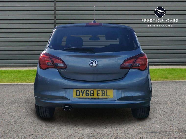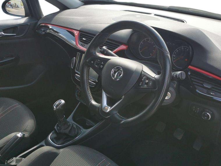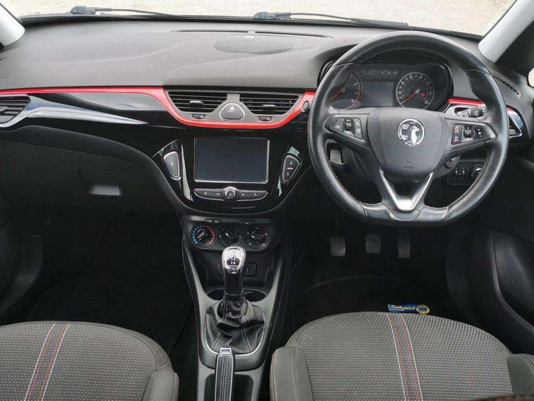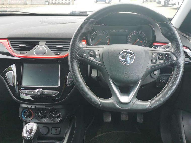 Apple car play/Android Auto, Central facia display, Cruise control + speed limiter, Digital fuel gauge with low fuel warning light, Digital water temperature gauge, Electric speed sensitive power steering, Exterior temperature gauge, Lights on audible warning, Multi function trip computer, Navi 4.0 IntelliLink navigation with 7" touchscreen, traffic program, DAB , USB, Bluetooth audio streaming, Apple CarPlay/Android auto, and microphone, Rev counter, Service indicator, Speed warning indicator, Speedometer, White graphics on black background, Front anti roll bar, Sports suspension, Steering wheel mounted audio/cruise controls, Black door mirrors, Black foil on B-pillars, Black front grille, Black roof, Body colour bumpers, Body colour door handles, Body colour front lower spoiler/side sills/rear lower skirt, Chrome effect tailpipe extension, Dark tinted rear glass, Dipping rear view mirror, Door to door illumination, Electric adjustable/manual folding heated door mirrors (wide angle on driver's side), Electric headlight beam leveling, Electrically operated front windows with safety auto reverse/one touch facility, Front fog lights with black surround, Halogen headlights, Hazard warning lamps, Headlamp levelling, Heated rear window, Heated windscreen, High level LED centre brake light, Intermittent rear wash/wipe, Laminated windscreen, LED daytime running lights, Mineral black door mirror housings, Rear fog lights, Rear wiper, Side window demist vents, Two speed windscreen wipers with variable intermittent wipe, Welcome lighting, Windscreen demist vents, 12V electrical accessory socket in front, 3 spoke steering wheel, Anti submarining ramps in all seats, Centre console with cupholders, Chrome gear knob, Chrome interior door handles, Driver's and front passenger's sunvisors, Driver's and front passenger's tiltable assist handles, Driver's and passenger's vanity mirrors with flip up cover, Driver's vanity mirror, Four adjustable facia vents, Front courtesy lights, Front door pockets, Front map reading lights, Front seat belt pre-tensioners with load limiters, Glovebox with lid, Grab handles, Height adjustable driver's seat, Height adjustable front headrests, Height adjustable rear head restraints with adjustable backrest, Illuminated luggage compartment, Instrument panel light dimmer, Interior tailgate handles, Isofix child seat mounting points on outer rear seats, Leather gear knob and handbrake grip, Load restraining lashing points, Luggage compartment cover, Multi function steering wheel, Pollen filter, Reach + rake adjustable steering column, Rear courtesy lights, Rear door pockets, Rear reading lights, Reclining front seats, Sports front seats, Storage box on driver's side lower facia, Stowage facility for luggage compartment cover behind rear seats, Twin gas assisted tailgate struts, Sight and light Pack - Corsa, Anti-lock braking system (ABS), Brake assist function, Electronic brake force distribution, Electronic Stability Programme, Energy absorbing steering column, Front and rear seatbelt reminder, Front and rear seatbelt unfastened audible warning and warning light, Front seatbelt force limiters, Gas pressure dampers, Height adjustable front seatbelts, Hill start assist, Passenger airbag deactivation system, Pedal release system, Rear child proof door locks, Reinforced passenger safety cell, Side impact protection beams, Six airbags - Driver's dual stage airbag/front passenger's dual stage airbag/front seat side impact airbags/full size curtain airbags, Three 3 point rear seatbelts, Three inertia reel lap/diagonal seatbelts, Traction control, Tyre pressure monitoring system, Electronically protected audio, Engine Immobiliser & Deadlocks, Key left in ignition audible warning, Locking wheel bolts, Remote control central locking, Visible vehicle identification number, Piano black facia with white inserts, 17" Gloss black alloy wheels, Tyre inflation kit,