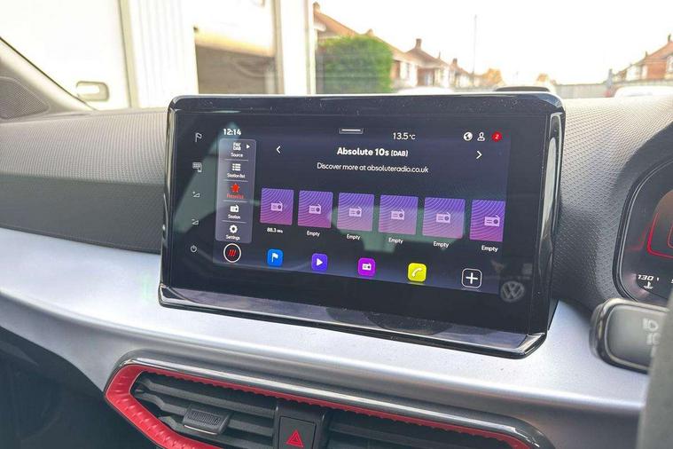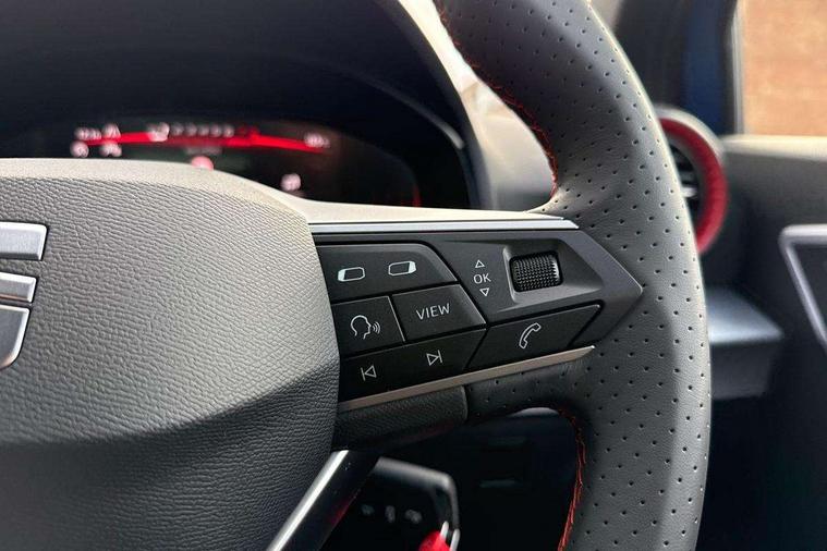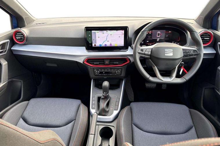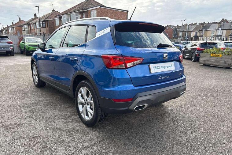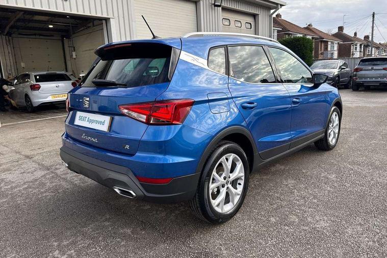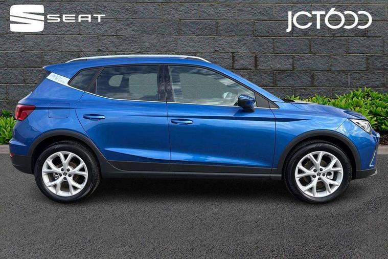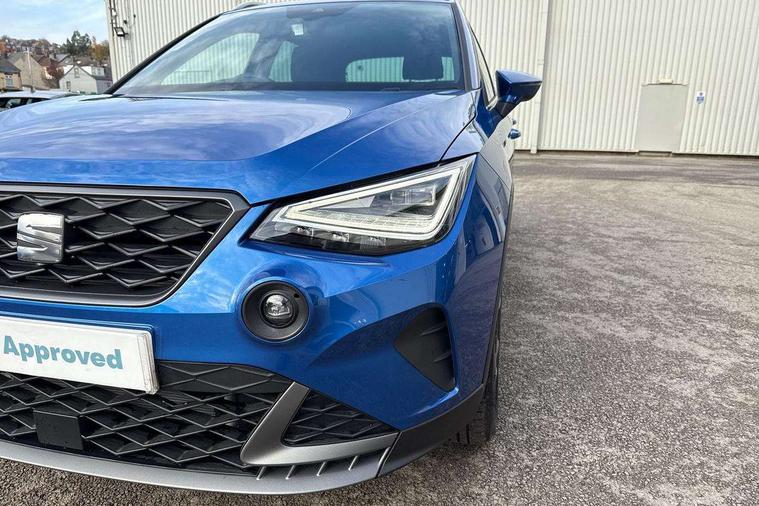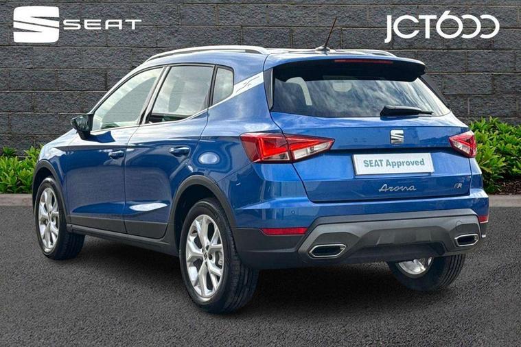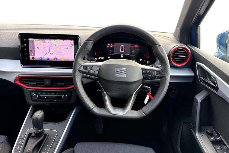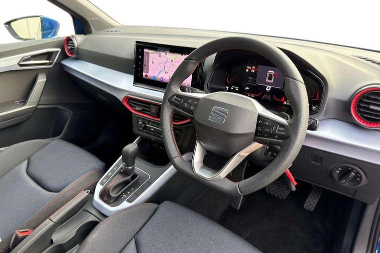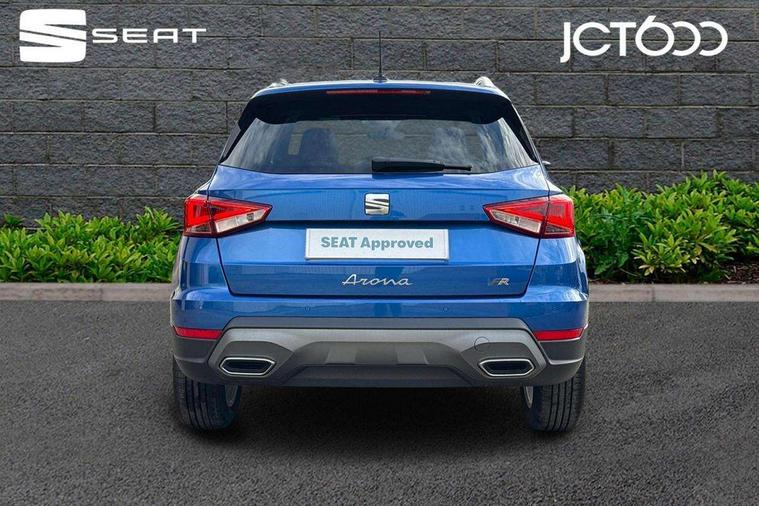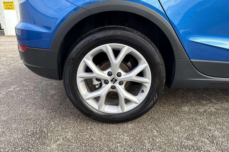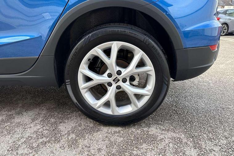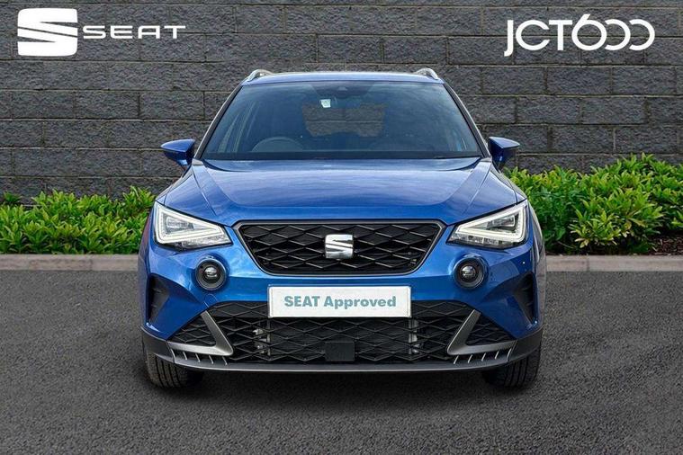 'Lights On' Reminder warning buzzer, 8" Digital cockpit, Digital clock, E-call, Electric speed sensitive power steering, Full link smartphone integration with mirror link, wireless apple carplay, Google android auto + USB Type C cable for apple and android devices, Lane keeping system, Low fuel warning light, Outside temperature display, RPM counter, SEAT Drive profile - Four different models normal-sport-eco-individual, steering response, throttle response and gear shifts mode, Trip computer, Wireless phone charger, 9.2" colour touchscreen with navigation system, voice control and USB port (type c), Bluetooth interface for hands free and audio streaming, DAB digital radio and AM/FM radio, Steering wheel mounted audio controls, Anti theft roof antenna, Auto dimming interior rear view mirror, Automatic activation of hazard warning lights, Body coloured bumpers, Body coloured door handle inserts, Chrome roof rails and window surrounds, Dark tinted rear windows, Electric front/rear windows, Electrically adjustable, heated and folding door mirrors, Front fog lights with cornering function and rear fog light, FULL LED automatic headlights with dynamic headlight range control, coming and leaving home, LED daytime running lights, LED rear tail lights and licence plate lights, Protective side mouldings, Rain sensing wipers, Rear side wing doors, Rear spoiler, Rear window wash/wipe, Roof colour door mirrors, Third brake light, Twin exhaust pipe styling hidden exhaust pipe, Visible VIN plate, 2 cupholders, 3 seat bench in 2nd row, 60/40 split folding rear seat, Aircare filter, Black interior roof, Cloth upholstery, Double boot floor, Driver sunvisor with covered mirror + card holder, Dual zone climate control, Front courtesy light with front reading lights, Gear shift indicator, Height adjustable front seats, Height/reach adjustable steering column, Illuminated air vent surrounds, Illuminated boot, Instrument lighting with brightness control, Interior ambient lighting, Interior light in footwell, central console and door panel, ISOFIX points in outer rear seats with top tether anchorage points, Passenger sunvisor with vanity mirror, Perforated flat bottomed leather steering wheel/gear knob/handbrake with red stitching and FR logo, Potentiometer, Single front passenger seat, Steering wheel mounted gearshift paddles, Two front and three rear height adjustable headrests, Interior chrome pack - Arona, Safe and driving pack (S) - Arona, 3 point seatbelts on all rear seats, ABS, Active front headrests, Child locks on rear doors, Driver and front passenger airbags with front passenger airbag de activation, front side and curtain airbags, Emergency Brake Assist (EBA) and front assist, Front and rear seatbelt reminder, Hill hold control, Multi-Collision braking, Tiredness recognition system, Traction control, Tyre pressure monitoring system, Alarm with back up horn with tow away protection, Deadlock, Electronic engine immobiliser, Locking wheel bolts, Remote central locking, Titan black dashboard, 17" Dynamic alloy wheels,
