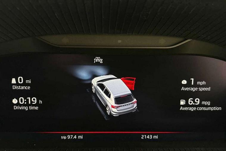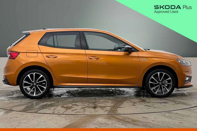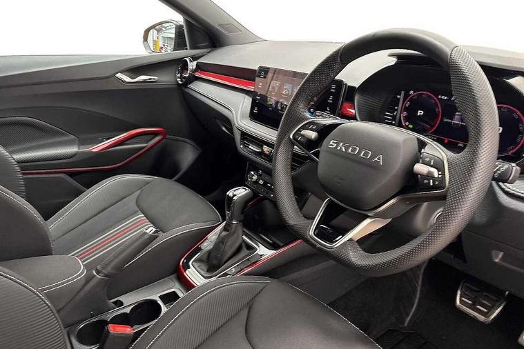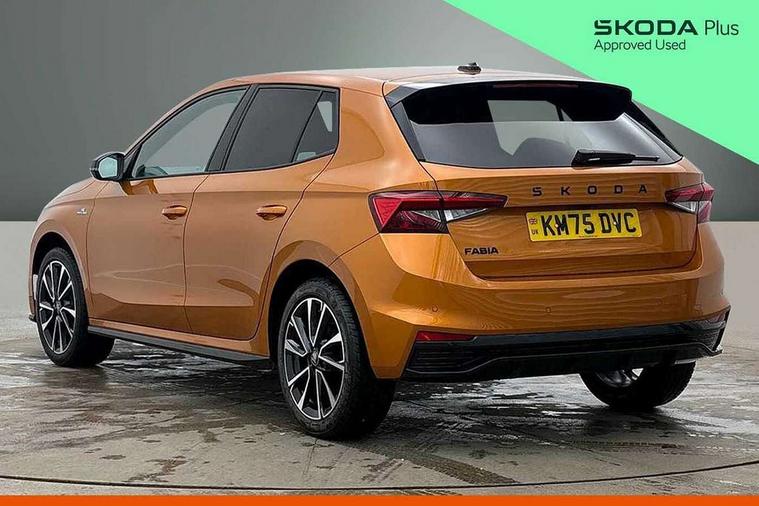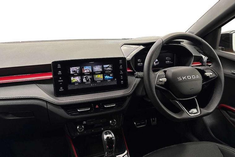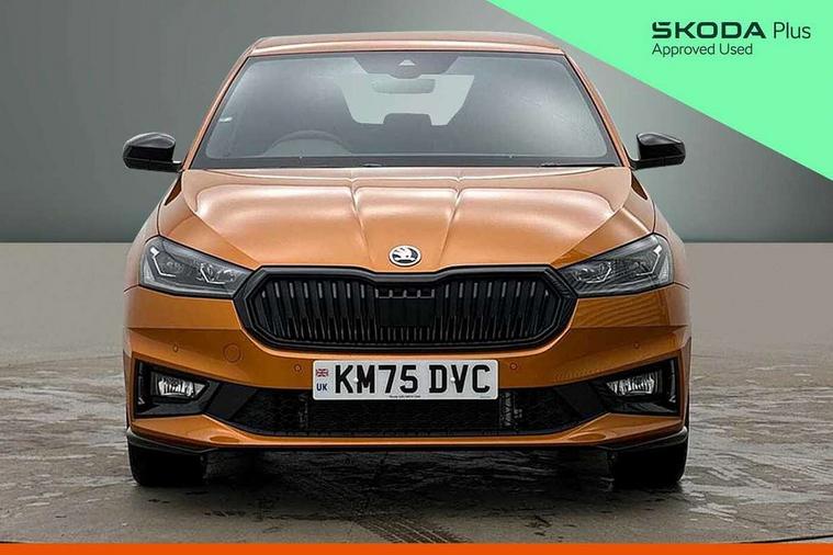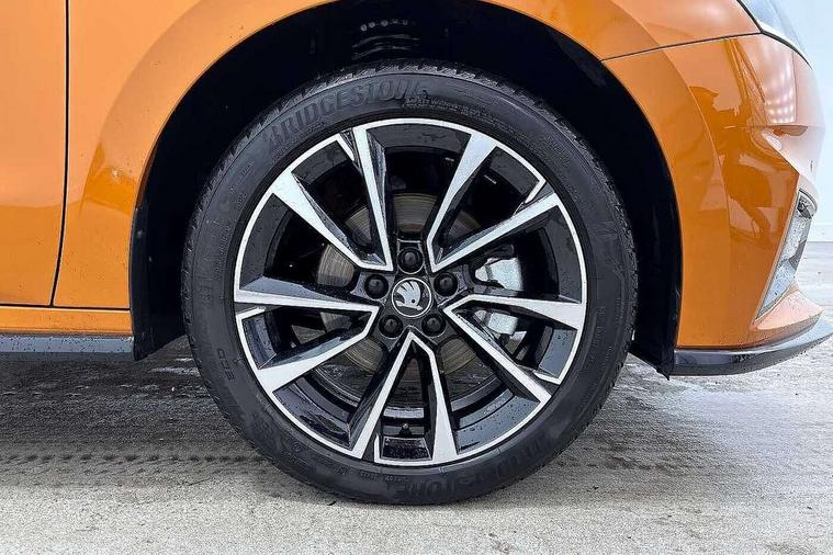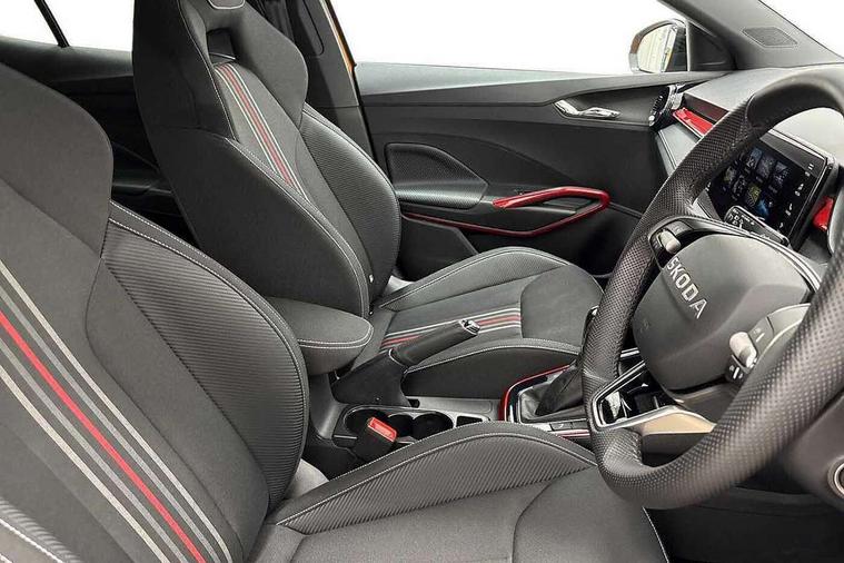 Advanced driver attention and drowsiness monitor, Bluetooth connection, Driver alert system, Electromechanical power steering, Exterior temperature gauge, Service interval indicator, Traffic sign recognition, Virtual cockpit with 10.25" colour display, Wireless SmartLink for Apple CarPlay and Android Auto, 6 Speakers (4 in front and 2 in rear), 9.2" colour display skoda navigation system with voice control and web radio, Auxiliary socket for external MP3 player, DAB digital radio reception, Auto dimming rear view mirror, Black radiator grille, Body coloured bumpers, Chrome window surround, Door mirror integrated indicators, Dynamic headlight range control, Front and rear electric windows, Front window wiper intermittent control, Ice scraper in fuel cap, LED 3rd brake light, LED daytime running lights with coming and leaving home feature, LED rear lights, Monte Carlo badging, Privacy glass, Rear LED fog light, Rear side wing doors, Rear window wiper with washing nozzles, Roof mounted spoiler, SKODA tailgate lettering in black, Sports bumpers, Unique dark chrome design logo on alloy wheels, 2 LED reading lights in front and rear, 3 rear headrests, Aluminium pedals, Backrest split and folding, Black headlining, Central console with fixed cup holder and storage box, Chrome handbrake release button, Door sills with fabia badging, Dual zone air conditioning with climatronic electronic control, Fabric/artificial leather upholstery, Front centre armrest, Front sports seats, Gearshift knob/handle in leather, Hand brake lever handle in leather, Height adjustable front headrests, Height adjustable front seats, Height adjustable steering wheel, ISOFIX and TopTether anchorage points to the outer rear seats, ISOFIX and TopTether on the front passenger seat, Luggage compartment lighting, Manually adjustable lumbar support in front seats, Metallic red interior door handles, Pollen filter, Rear seat bench unsplit, Single front passenger seat, Skoda lettering on steering wheel, Sun visors with mirror and airbag label on passenger side, Textile floor mats, Ticket holder, Umbrella in drivers door, Ambient lighting pack - Fabia Hatchback, Convenience pack - Fabia, Light and view pack plus - Fabia, 3-point height adjustable front seats belts with pretensioner and force limiter, Automatic warning lights in case of crash, Driver and passengers airbag with switch off function, e-Call+, ESC including ABS, MSR, ASR, EDS, HBA and XDS, Front and rear seat belt warning, FRONT ASSIST (AEB City and AEB Inter Urban), Front side airbags, Head airbags, Hill hold control, One tone horn, Pedestrian protection, Three rear 3-points safety seat belts with pretensioner and force limiter including stop function for outer rear seat belts, Tyre pressure monitoring system, Anti-theft alarm system including immobiliser, interior monitoring, backup horn, and towing protection, Central locking with radio remote control, interior controls, SAFE function and 2 foldable keys, Carbon effect door and side trim panels, Carbon effect lower decorative trim with white stitching, Grain satin black central console cover, Monte carlo air vents, Red metallic upper decorative trim, Anti-theft wheel bolts protection, Super-low rolling resistance tyres,