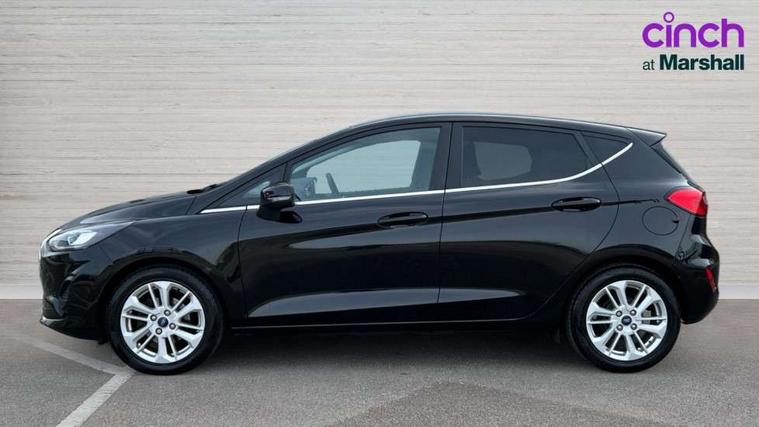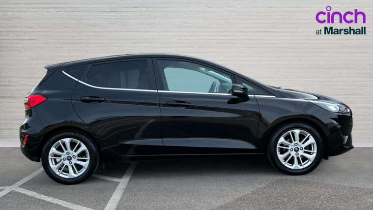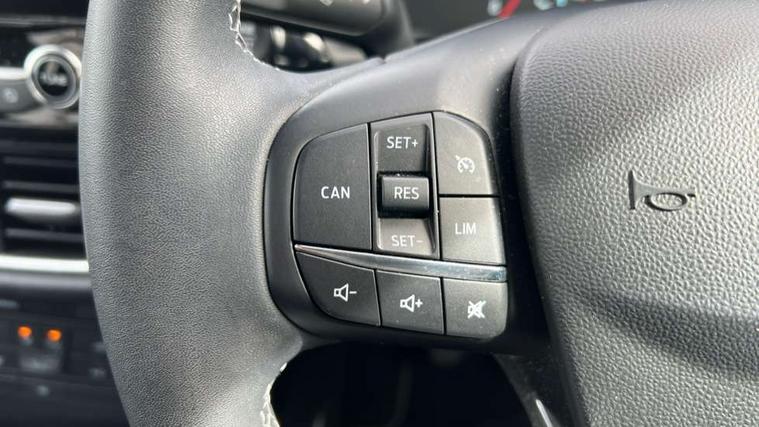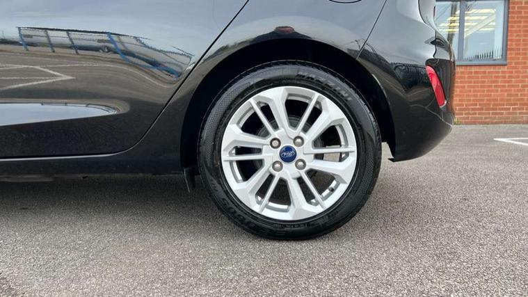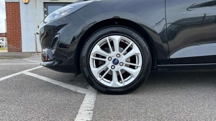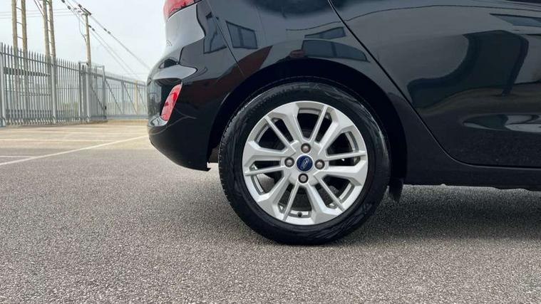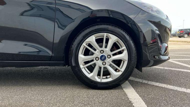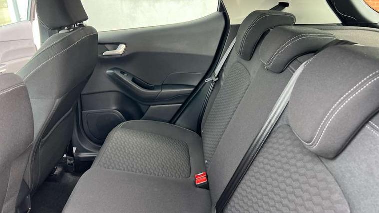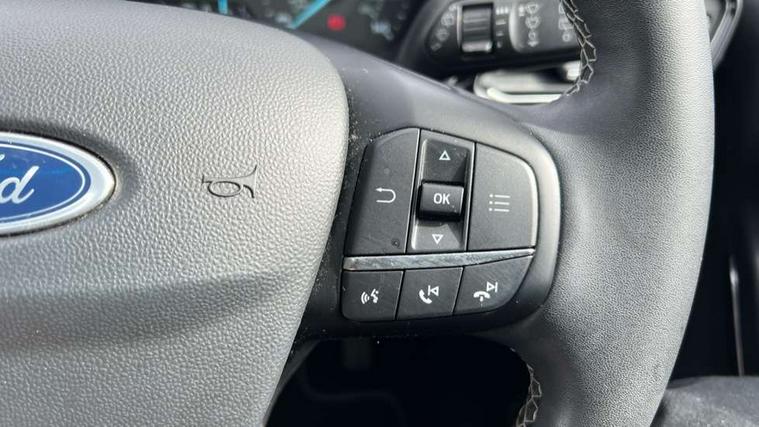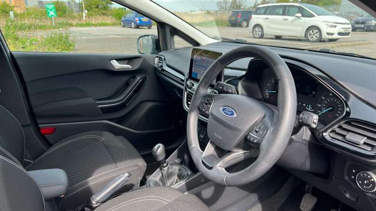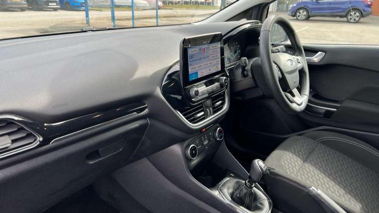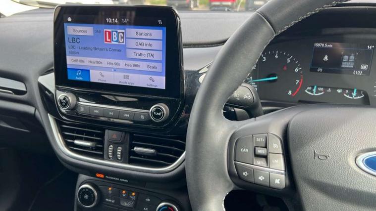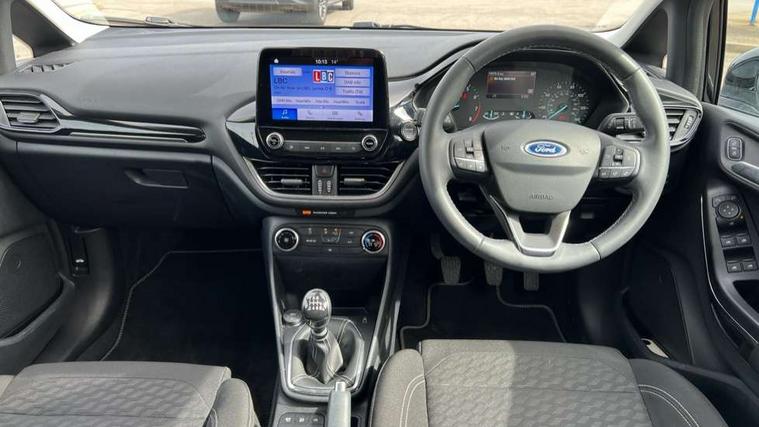 Bluetooth system, Electric power steering, Ford easy fuel, Ford SYNC 3 Navigation system incl 8" touchscreen, 7 speakers, FordPass connect, Apple carplay, android auto, voice control and emergency assistance, Rear parking distance sensors, Selectable drive modes (Normal, Sport, Track), Trip computer, 2 USB ports, Auxiliary input socket, DAB Digital radio, Steering wheel mounted controls, Body colour bumpers, Body colour door handles, Body colour rear spoiler, Body coloured electrically operated and heated door mirrors with side indicators, Chrome beltline trim, Chrome front grille, Chrome lower window surround, Cornering front fog lights, Electric front windows/one touch facility, Electric rear windows, Quickclear heated windscreen, Rain sensing wipers and auto dimming rear view mirror, Rear privacy glass, Rear wiper, 3 spoke leather trimmed steering wheel with audio control, 60/40 split folding rear seat, Adjustable head restraints, Boot carpet, Centre console with opening armrest, 2x cupholders, 12v and USB, Chrome inner door handles, Cloth upholstery, Footwell illumination, Front floor mats in velour, Front map reading lights, Front seat and rear pockets, Illuminated glovebox, Leather gaiter, Load area light, Luxury woven headliner, Manual 2 way passenger seat adjust, Manual 4-way driver seat adjust, Manual air conditioning, Overhead console with sunglasses holder, Pollen filter, Rake/reach adjustable steering wheel, Sensico wrapped steering wheel, NCAP Pack - Fiesta, 3 point seatbelts on all rear seats, ABS+EBA, Curtain airbags, Driver and passenger airbags, Drivers knee airbag, Electronic stability control with hill start assist, Front passenger airbag deactivation, Front side airbags, Seatbelt warning, Two tone horn, Tyre pressure monitoring system, Keyless start with 'Ford Power' starter button, MyKey system, Remote central locking & engine immobiliser, Thatcham Cat.1 alarm, 16" 10 spoke alloy wheels,