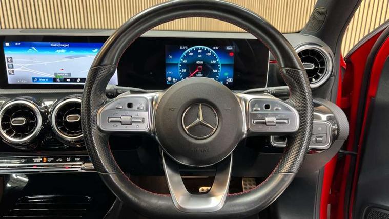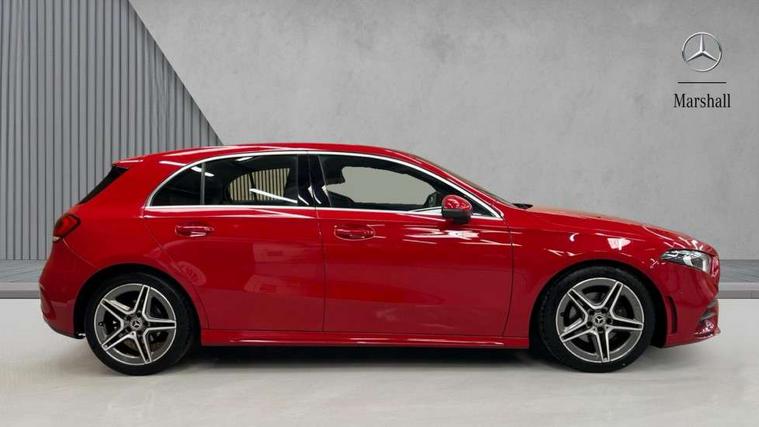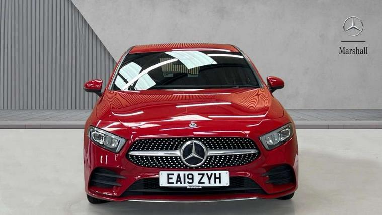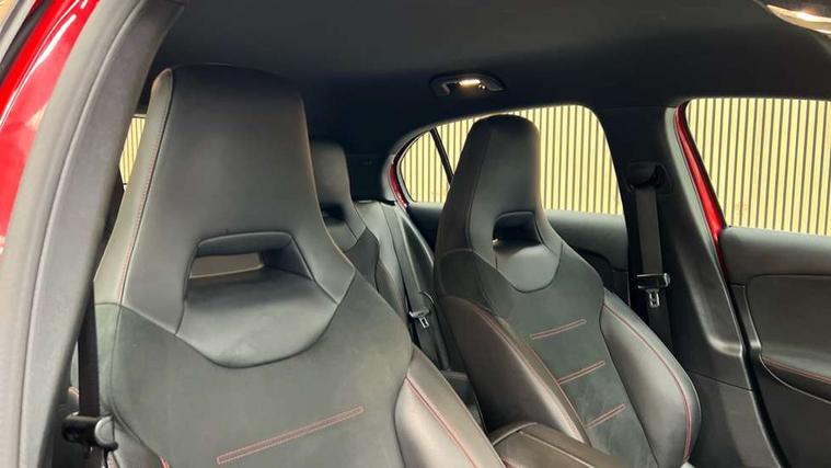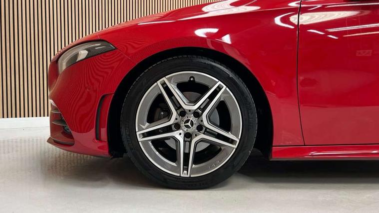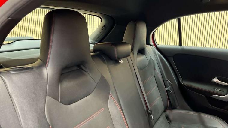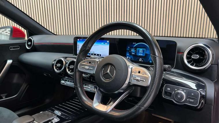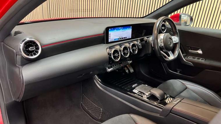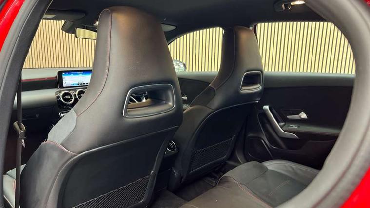 10.25" media display, 180 degree rear view camera with parking guidelines, 7" colour screen in instrument panel, Active lane keep assist, Active park assist with parktronic system including front and rear parking sensors, Attention assist, Brake pad wear indicator warning light, Direct steering, Direction indicators with lane change function, DYNAMIC SELECT with a choice of driving modes (ECO, Comfort, Sport, Sport+ and Individual), Fluid level warning indicator for fuel, oil, coolant and washer fluid, Hard-disk navigation, Lamp failure indicator, Mercedes me connect including emergency call system, accident recovery, breakdown management and maintenance, Outside temperature gauge, Radio aerial integrated into roof spoiler, Service indicator (ASSYST), Speed sensitive power steering, Stop/start system, Trip computer, Voice activation, Lowered comfort suspension, DAB Digital radio, Dual bluetooth interface, 2 USB ports (type C), MBUX multimedia system with DAB digital radio and touchpad including satellite navigation, Active aerodynamics with AIRPANEL in the front apron, Adaptive brake lights, AMG front, rear apron and side skirts, Blue tinted glass, Body colour bumpers, Body colour door handles, Body colour side skirt, Body coloured door mirrors, Chrome beltline trim, Diamond radiator grille with chrome pins and silver louvre + chrome insert, Electric adjustable and heated door mirrors with integrated LED side indicators, Electric front windows, Electric rear windows, Exhaust system - Twin trapezoidal tailpipes in polished stainless steel, Headlamp assist automatic headlamp activation, Heated glass rear windscreen + timer control, LED high performance headlamps with integrated LED daytime running lights, LED tail lamp, LED third brake light, Rain sensor windscreen wipers, Rear fog lights, Rear wiper, 12V socket, 3 Spoke flat bottom leather multi function steering wheel with perforated leather in grip area, 40:20:40 split folding rear seats, Air vents surround and cruciform nozzle in silver chrome, AMG floor mats with red stitching, Artico man-made leather/Microfibre Dinamica upholstery with red contrast stitching, Auto Mercedes-Benz child seat recognition sensor, Black roof lining, Brushed stainless steel sports pedals with rubber studs, Controller on centre console with chrome surround, Cup holder and stowage compartment lighting, Front centre armrest with storage compartment, Front door sills with Mercedes Benz lettering, Front doors with ambient and signal light, Front footwell lights, Front reading lamps, Front seat backs luggage nets, Front seat cushion length adjustment, Front signal exit lamp, Front vanity lights, Gearshift paddles on steering wheel, Handle recess/closing light, Heated front seats, Height/reach adjustable steering column, Illuminated glovebox, ISOFIX Child seat top tethers and anchor fixings, Load securing rings in luggage compartment, Luggage compartment cover, Manual height adjustable front seats, Oddments tray lighting, Rear head restraints, Rear Reading Lamps, Seat occupancy sensor for front passenger seat, Sports seats with integrated headrests, Storage compartment under load area floor, Sunvisors with illuminated vanity mirrors, Touchpad, Touchpad illumination, Twin front cupholders, Two zone thermotronic luxury automatic climate control, Mirror package - A Class, Seat comfort pack - A Class, 3 rear 3 point seatbelts, ABS with Brake Assist, Active bonnet, Adaptive brake assist with hold function and hill start assist, Black seatbelts, Brake calipers with Mercedes-Benz lettering + perforated brake discs, Childproof locks manually operated for rear doors and electrically operated for rear power windows, Crash responsive emergency lighting, Driver and passenger head and side airbags, Drivers knee airbag, Dual stage driver/passenger airbags, Electronic parking brake, ESP curve dynamic assist, ESP with ASR, Front and rear seatbelt reminder, Tyre pressure monitoring system, Warning triangle and first aid kit, Window airbags, Alarm system/interior protection/immobiliser, Keyless Go, Remote central locking and crash sensor with emergency opening function, 18" AMG 5 twin spoke light alloy wheels in titanium grey with highsheen finish, Tirefit sealant kit,