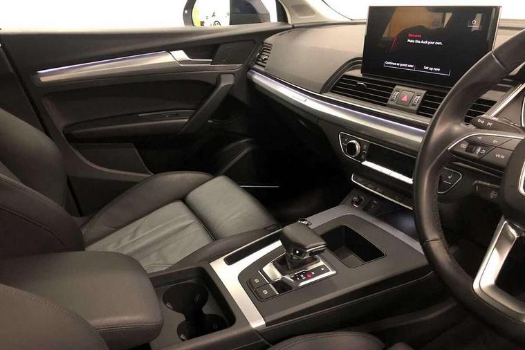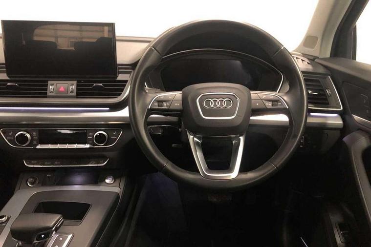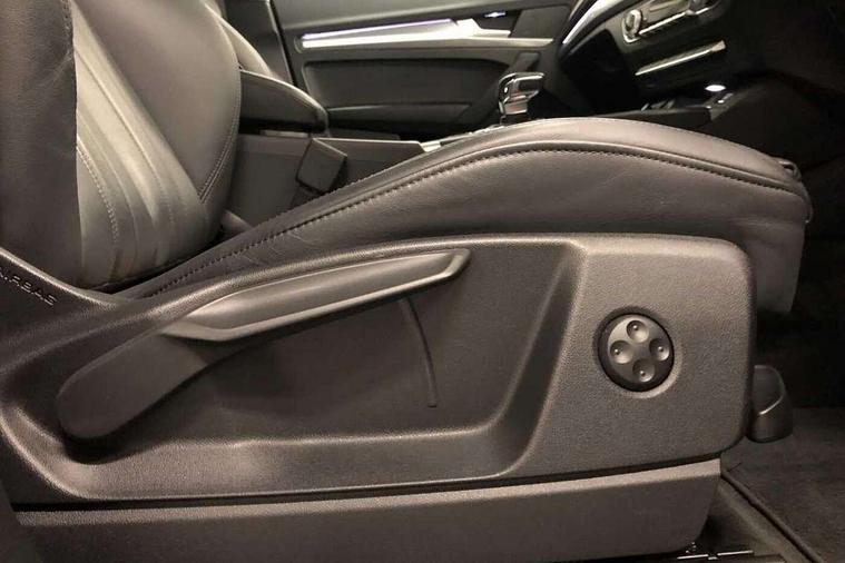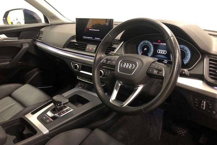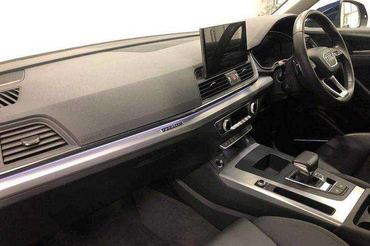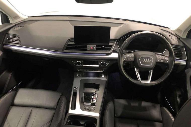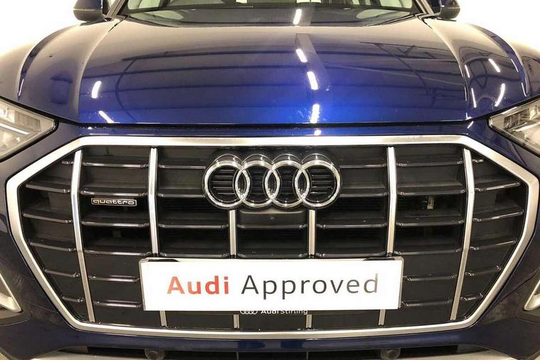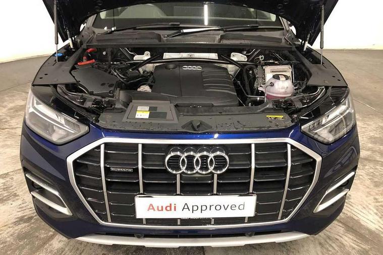 Audi connect safety and service (e-call), Audi connect with Amazon Alexa Integration, Audi drive select, Audi virtual cockpit plus with 12.3" screen and three different layout designs, Audi wireless smartphone interface, Automatic start-stop system with coasting functionality and efficiency programme, Bluetooth interface, Cruise control + speed limiter, Electro - mechanical power assisted steering, MMI navigation plus with 10.1" touch screen, Power tailgate, Reversing camera, Service interval indicator, Voice control system with Audi hotword activation "Hey Audi", Diesel particulate filter, Dynamic suspension, Quattro on demand, 2 x USB charging port with aux input socket, DAB Digital radio, Acoustic windscreen, Air inlets in matt titanium black with blades in matt aluminium silver, Aluminium roof rails, Auto dimming door mirrors, Auto dimming rear view mirror, Automatic headlight adjustment, Automatic headlights and windscreen wipers, Body colour bumpers, Body colour door mirrors, Chrome plated exhaust trims, Daytime running lights, Door sills in Selenite silver, Electric adjustable/heated/folding door mirrors, Front and rear electric windows, High level LED brake light, LED headlights and LED tail lights, Lower bumpers painted in contrast Manhattan grey, Matt selenite silver underbody protection, Matt twilight grey radiator grille with chrome vertical struts, Rear chrome trim strip below lights, Rear diffuser strip in selenite silver, Rear side wing doors, Rear spoiler, Rear wiper, Roof bars, 3 rear headrests, 3 spoke multifunction leather steering wheel with shift paddles, 40:20:40 split folding 3 rear bench seat in 2nd row with rear centre armrest, Comfort front centre armrest, Deluxe 3 zone electronic climate control, Door sills trims with aluminium inlays, Front/rear floor mats, Heated front seats, Height adjustable front head restraints, Height/reach adjustable steering column, ISOFIX child seat mounting and top tether, Luggage compartment cover, Manual seat adjustment with 4-way electric lumbar support, Removable luggage compartment floor, Silver cloth headlining, Single front passenger seat, Sunvisors with vanity mirrors, Twin leather upholstery + front sports seats, High gloss pack - Q5, LED interior light pack - Q5, 3 point seatbelts on all seats, 6 airbags - Driver, front passenger, curtain and side airbags, Electrically operated child locks on rear doors, Electromechanical parking brake, Electronic stabilisation control including ABS, ASR and EDL, Front passenger airbag deactivation, Hill descent control, Hill hold assist, Multi collision brake assist, Pop-up bonnet for pedestrian protection, Pre sense city, Seat belt force limiter, Seatbelt monitoring, Tyre pressure warning, Warning triangle and first aid kit, Anti theft alarm, Anti-theft wheel bolts, Keyless Go access/ignition system, Remote central locking, Aluminium rhombus inlay,