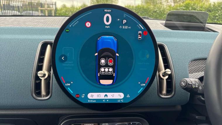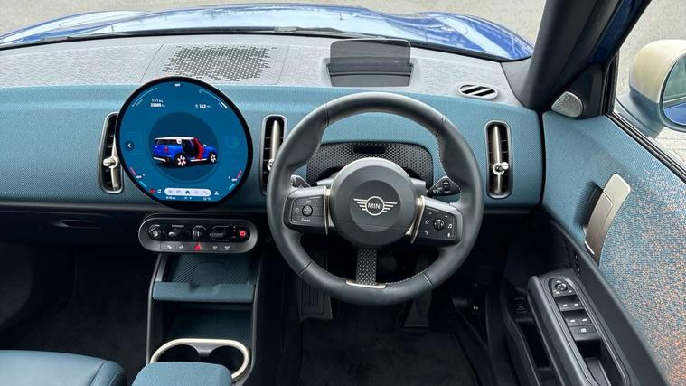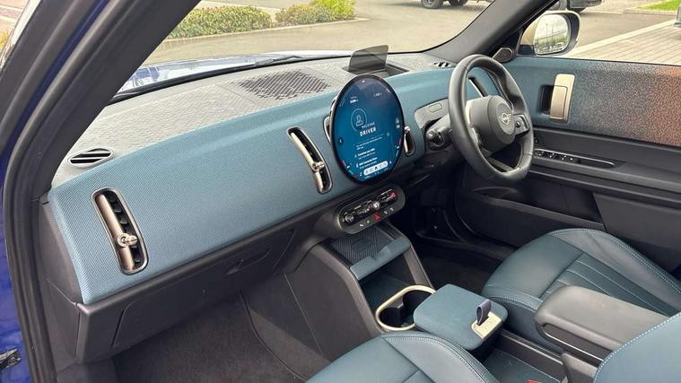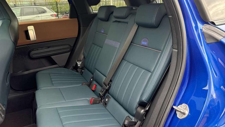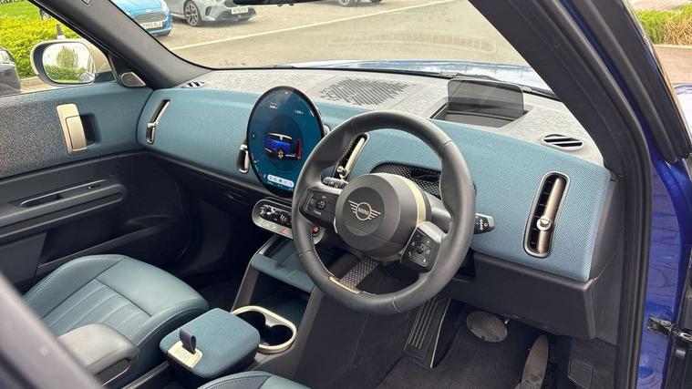 Bluetooth connection, Circular OLED Screen, Compatible mobile phone bluetooth with audio streaming, Cruise Control (DCC), Digital dashboard display, E-call, Electro-mechanical speed dependant steering assistance, MINI Experience Modes, Mini navigation system, MINI TeleServices, Parking assistant in camera and ultrasound based assistance system, rear view camera, parking aid and distance control, Auto transmission with Paddles, 6 speakers, DAB Digital radio, Personal eSim, Auto tailgate, Electric adjustable heated door mirrors, Front and rear electric windows, Heated rear window, LED daytime running lights, LED Headlights, LED rear lights, LED third brake light, Logos in Vibrant Silver, Rain sensor with auto headlights, Rear side wing doors, Rear window wiper, Roof rails, Vibrant silver grille surround, 3 seat bench in 2nd row, 60/40 split rear bench seat, Anthracite headliner, Auto air conditioning, Floor mats, Front armrest, Front headrests, Front sport seats, Heated steering wheel, Height and length steering column adjustment, Lidded storage box in Petrol knit, Rear headrests, Single front passenger seat, Sport Vescin Steering Wheel, Sunvisors with vanity mirrors, Vescin synthetic leather upholstery, Vibrant Silver sill inlay, 3x3 point rear seat belts, 6 Airbags - front, side, head and seat belt tensioners, ABS, DSC - Dynamic Stability Control, Electronic handbrake, Electronic Stability Programme (ESP), Front ISOFIX (iSize), Hill hold assist, Hill start assist, Manual rear child locks, Traction control, Tyre pressure monitoring system, Warning triangle, Alarm system with tilt sensor, monitoring doors, bonnet interior and tailgate, Auto drive away locking, Deadlocking function, Electronic vehicle immobiliser, Locking wheel bolts, Remote control locking, Start/stop toggle with keyless go, Petrol/Brown dashboard knit, MINI Mobility Kit,