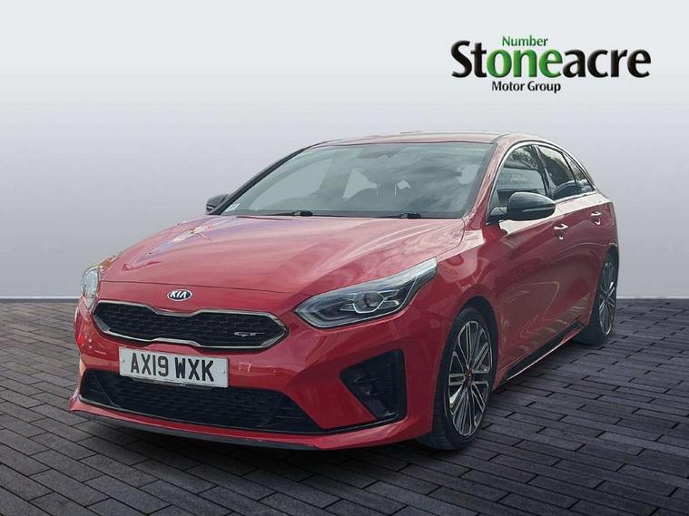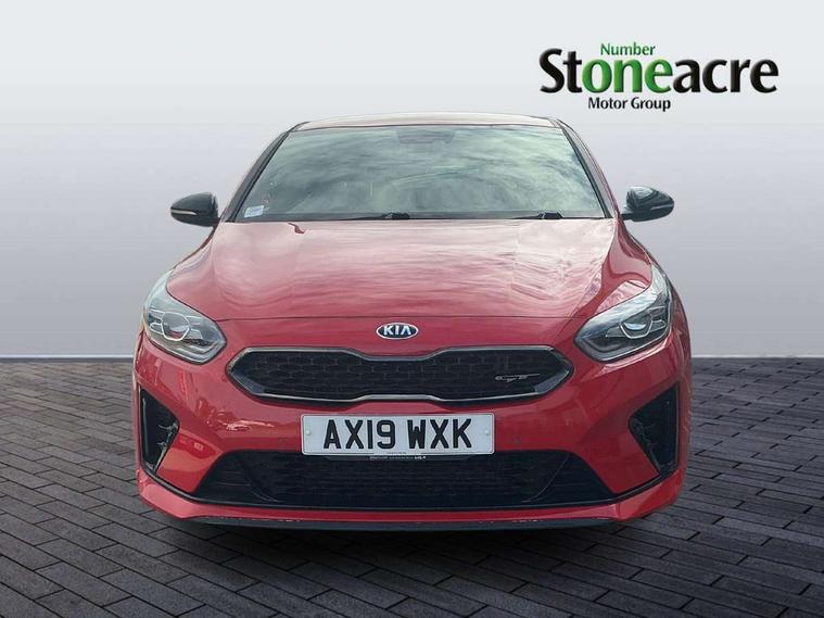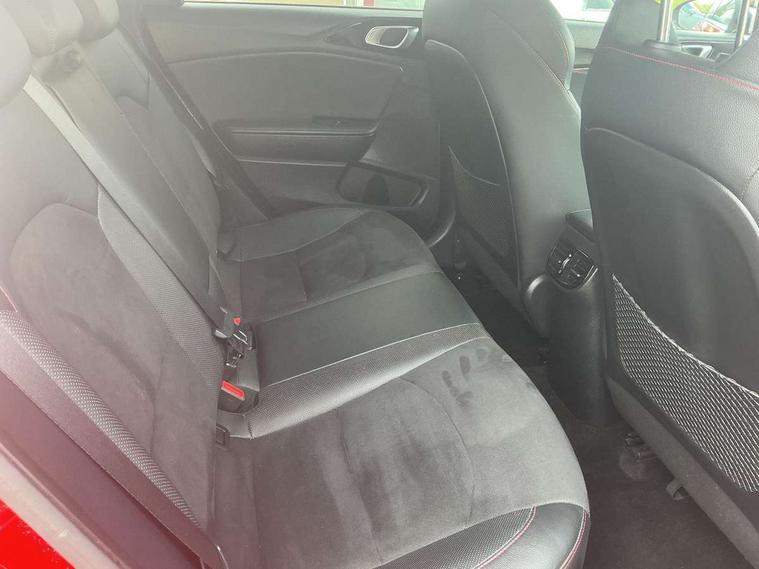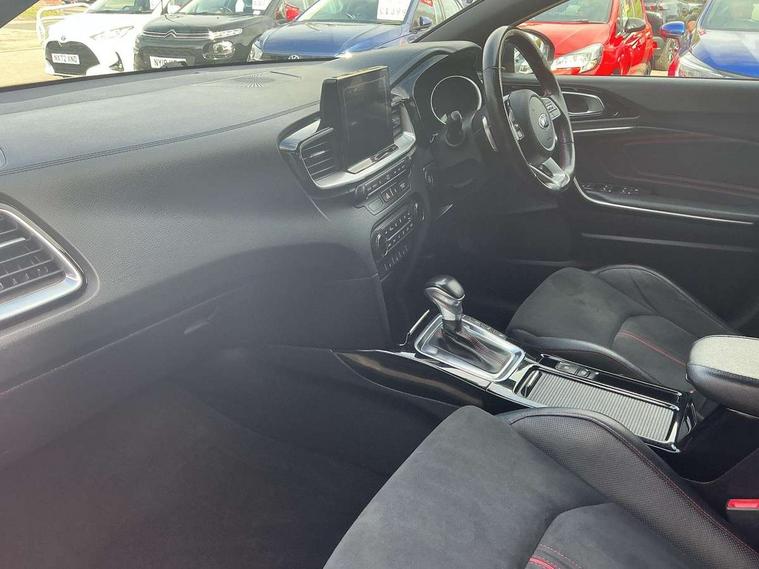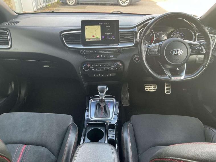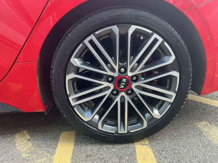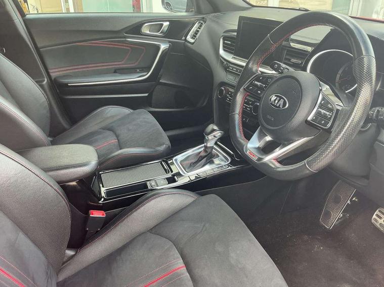 4.2" supervision cluster colour display with GT performance mode, 8" touchscreen satellite navigation with European mapping and traffic messaging channel, Apple car play/Android Auto, Bluetooth with Voice Recognition & Music Streaming, Cruise control + speed limiter, Drive mode selector, Driver attention warning, Emergency stop signalling system, Kia connected services featuring TomTom live, Lane keep assist, Motor driven power steering, Rear parking sensor, Reversing camera with dynamic guide lines, Smart park assist system (SPAS) with parallel/perpendicular/reverse with front/rear parking sensors, Trip computer, Intelligent Stop and Go, 6 speaker audio system, DAB Radio with MP3, Illuminated USB & aux ports, Steering wheel mounted controls, USB & AUX Ports for Connection of a Media Device, USB Fast Charger in Front Centre Console, Air intake with red accent lower lip, All-round Electric Windows with Front Auto Up & Down Function, Auto dimming rear view mirror, Automatic defog system, Automatic headlights, Body colour bumpers, Body colour exterior door handles, Body coloured rear roof spoiler with high gloss black trim, Chrome window surround, Electric adjustable/heated/folding door mirrors with LED Indicators and Kerbside Lights, Exterior front door handle illumination, Front fog lights, Front wiper de-icer, Headlamp levelling, Heated rear window with timer, High beam assistant, High gloss black and chrome with red insert radiator grille, High gloss black door mirrors, High gloss red side sill mouldings, LED Bi-Function headlights, LED daytime running lights, LED High-mounted Brake Light, LED rear fog light, LED rear lights, Privacy glass (rear side windows and rear screen), Projection headlights, Puddle lights, Rain sensing front wipers, Rear bumper with diffuser trim and dual exhaust, Rear wash/wipe, Wide view drivers door mirror, Windscreen Washer Level Warning, 2 x 12V Power sockets (Front centre console), 3 x passenger assist grips, 60/40 split folding rear seat, All-round height adjustable headrests, Black headlining, Centre console storage and sliding armrest, Cupholders in centre console, Cupholders in rear armrest, Dash illumination dimmer switch, Driver & Front Passenger Sunvisors with Vanity Mirror Illumination & Ticket Holder, Driver + front passenger electric lumbar support, Driver's seat height adjuster, Dual Height Luggage Area Floor, Dual zone automatic air conditioning, Faux leather door centre trim with red stitching, Front and rear door storage, Front map light with sunglasses case, Front Passenger Seat Height Adjuster, Front seat and rear pockets, Gear shift indicator, Heated front seats, Heated steering wheel, Illuminated ignition key hole, Interior door lock/unlock function, ISOFIX Child seat top tethers and anchor fixings, Leather D-Cut steering wheel with red stitching, Leather gearshift, Load area cover, Luggage area light, Luggage area parcel shelf, Luggage hooks, Paddle shifter, Part leather/faux suede upholstery, Premium centre console with sliding cupholder cover, Rear Air Ventilation, Rear centre armrest, Rear coat hooks, Satin chrome interior door handles, Stainless steel pedals, Tilt/telescopic adjustable steering wheel, ABS with Electronic Brakeforce Distribution (EBD) and Brake Assist System (BAS), All round 3-point seatbelts, Dual front side airbags, Dual horn, Electric parking brake, Electronic stability control (ESC) and vehicle stability management (VSM), Front passenger airbag deactivation, Height adjustable front seatbelts, Hill start assist control (HAC), Impact sensing auto door unlocking, Rear door child safety locks, Seatbelt reminder warning, Traction control, Twin curtain airbags, Twin front airbags, Tyre pressure monitoring system, Alarm system, Engine Immobiliser & Deadlocks, Engine Start/Stop Button with Smart Entry System, Locking wheel nuts, Speed sensitive auto door locking, Black high gloss front console tray garnish & door trim, Satin Chrome Fascia Trim, 18" Alloy wheels with red centre cap, Tyre mobility system,