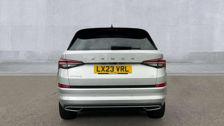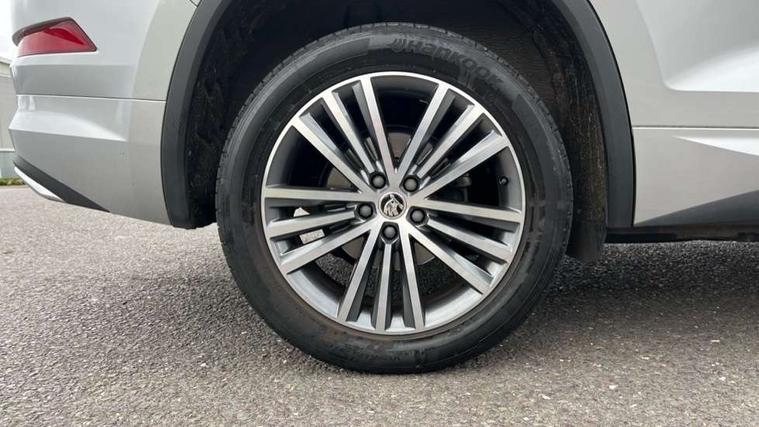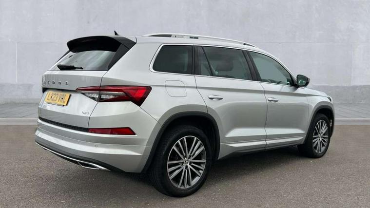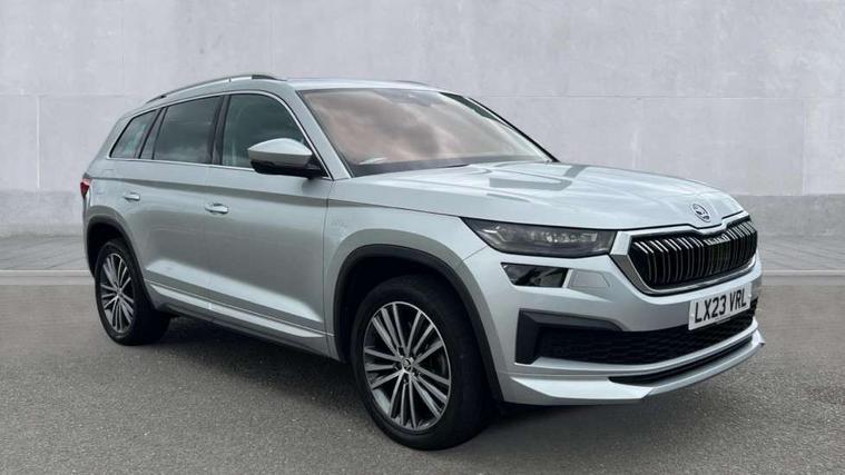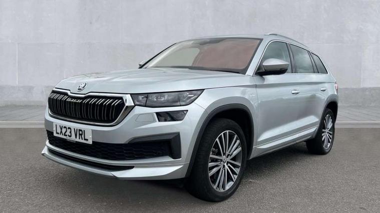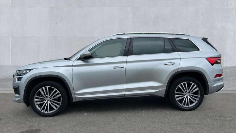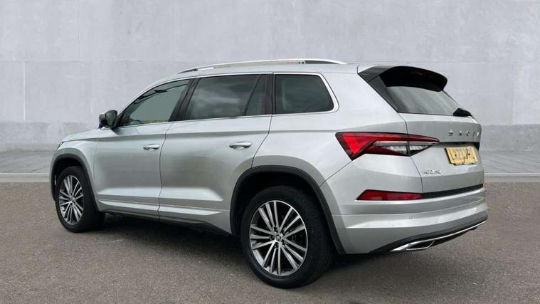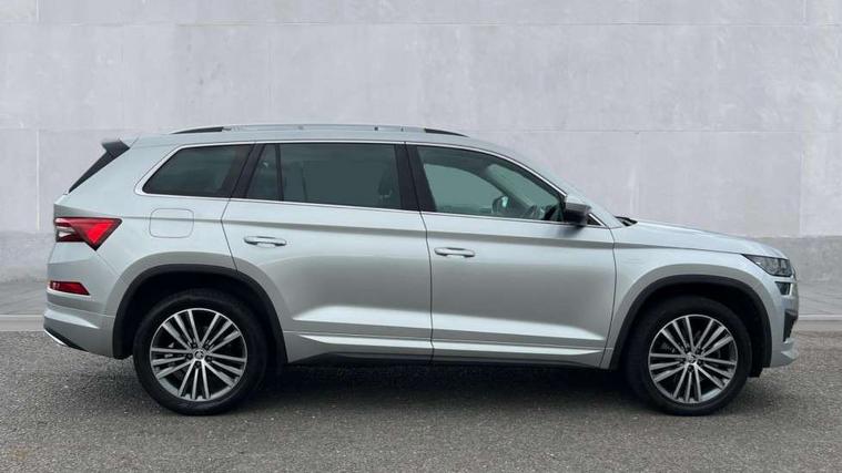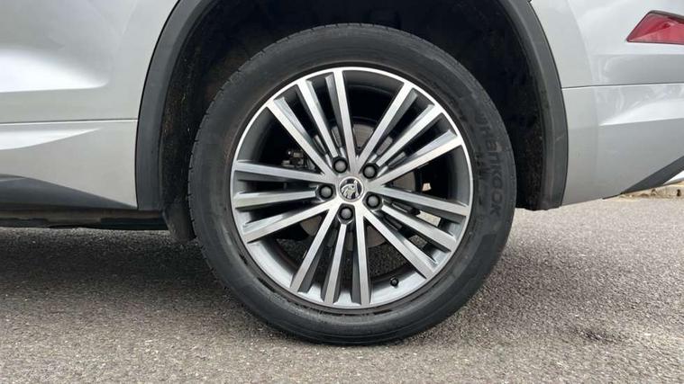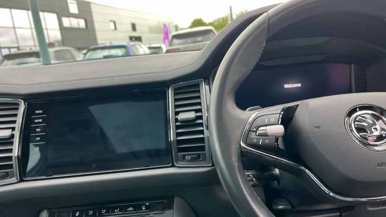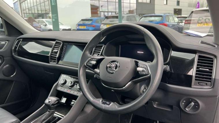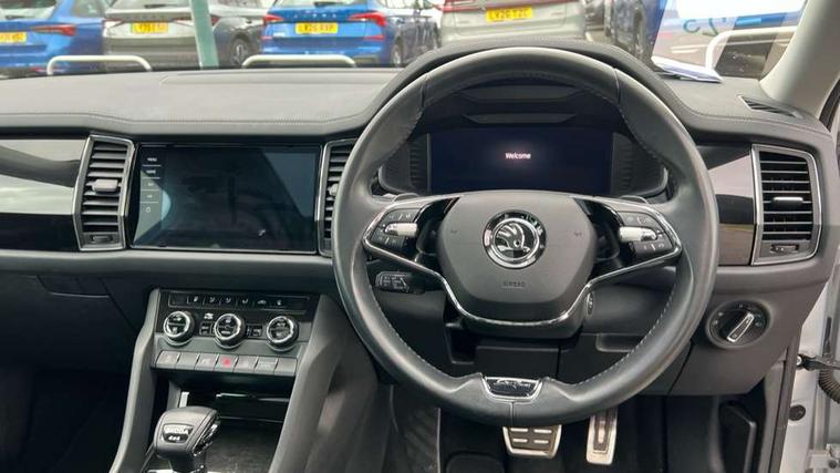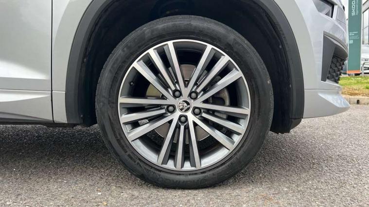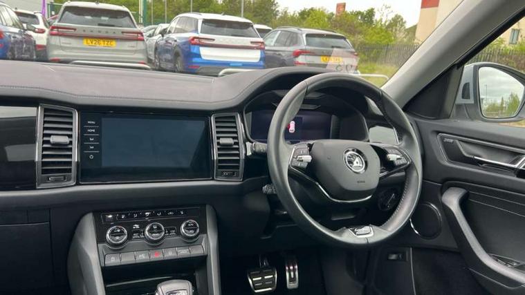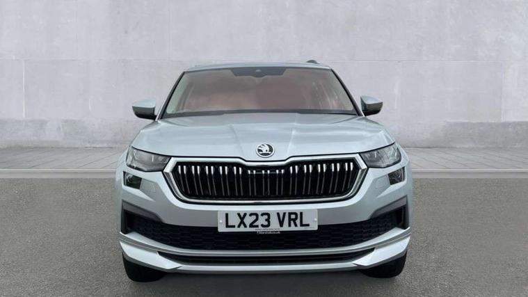 Area view, Blind spot detection system, Bluetooth system, Columbus satellite navigation with 9.2" touchscreen, integrated Wi-Fi, web radio, Digital voice enhancement, e call+, ECO Stop/start function, Exterior temperature indicator, Progressive steering, Smartlink wireless for apple carplay and wired for android auto, Speed limiter, Tailgate unlocking from outside, USB C Port x 2 in front centre console, Virtual Cockpit - 10.25" digital display, Wireless charging, Canton sound system, DAB Digital radio, Aero front windscreen wipers with intermittent function, Aero rear window wiper, Auto dimming rear view mirror, Black wheel arch surrounds, Body colour bumpers, Body colour door mirrors and handles, Body colour door panels, Chrome front grille, Chrome roof rails with chrome window surround, Electric adjustable/heated/folding door mirrors, driver side auto dimming with boarding sports and memory function, Electric front and rear windows, Extended rear spoiler with finlets in gloss black, Front fog lights, Full LED matrix headlights with AFS (adaptive front light system), cornering function and AWL (all weather lighting system), Headlight washers, Heated rear window, Invisible tailpipe, L&K front and rear bumpers including lower rear chrome strip, LED daytime running lights, LED rear fog light, LED third brake light in rear spoiler, Light assistant (coming/leaving home/tunnel light), Off-road style lower front bumper element, Panoramic sunroof, Privacy glass, Rain and light sensors, Rear LED lights (high functionality) with welcome effect and dynamic indicators, Rear side wing doors, Safety reflectors on front and rear doors, Window control switches with black trim, Without engine designation, 12V socket in boot, 2 rails with 2 hooks, 2 seat bench in 3rd row, 3 seat bench in 2nd row, 4 foldable roof handles with rear coat hooks, 60:40 foldable rear seat with sliding adjustment and backrest angle adjustment, Aluminium pedals, Bottle holders in door panel in the 1.5 litre front and 1 litre rear, Cargo storage compartments, Chrome headlight control button, Chrome interior door handles, Coat hooks on B pillar, Covered storage compartment on driver side, Decorative door sill covers, Front centre armrest with storage compartment, cup holder and 12V socket, Front courtesy lights, Gear shift lever with chrome frame and black gloss insert, Grey stitching in front and rear armrests and door armrests + door inserts, Height adjustable front headrests, Illuminated and cooled glovebox, Illuminated luggage compartment, Isofix child seat fittings in outer rear seats with top tether, Manually adjustable steering column, Net programme in boot (1x horizontal Net, 2x vertical Nets), Overhead glasses storage compartment, Pollen filter, Rear centre armrest with cupholders, Single front passenger seat, Sliding trunk cover, Small Bags on the inner sides of the front backrests, Sunvisors with illuminated vanity mirrors, Three rear height adjustable headrests, Ticket holder on A Pillar, Umbrella in door panel, Variable boot floor, LED Interior light pack - Kodiaq, Auto door release and activation of warning lights in the event of an accident, Child locks on rear doors, Driver and front passenger airbag with knee airbag and front passenger airbag deactivation, Electronic parking brake with hill start assist, Emergency rear braking signal, ESC (incl. ABS+MSR+ASR+EDS+HBA+DSR+RBS+MKB), Front assist with autonomous emergency braking, Front side airbags with curtain airbags, Fuel cut off safety device, Height adjustable front 3 point seatbelts + pretensioners, Hill hold control, Rear disc brakes, Safety vest holder in door, Seat belt reminder for all seats, Three point rear seat belts, Two tone horn, Tyre pressure monitor, Alarm with interior monitoring and tilt sensor with safe function, Anti-theft wheel bolts, Immobiliser, Keyless entry and start system (KESSY), Remote central locking with 2 keys, Grey stitching in dashboard, Piano black decorative inserts, Plaquette L&K front fenders, Temporary spare wheel (space saver),