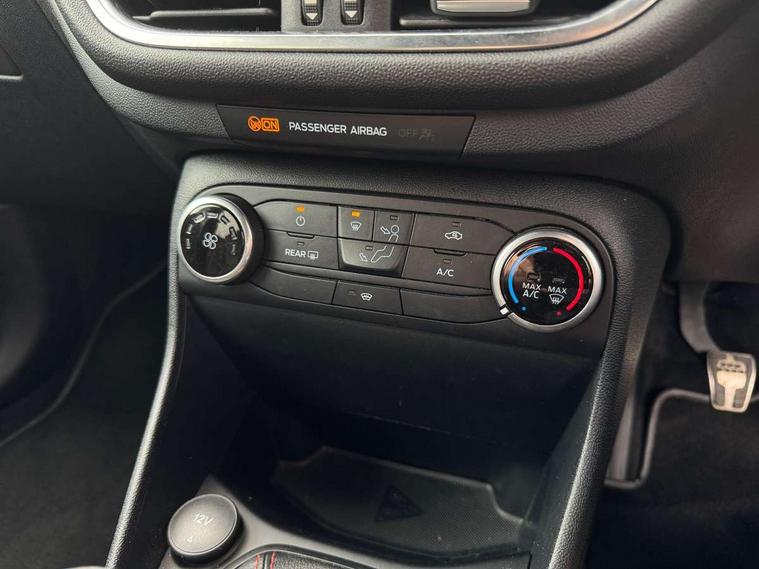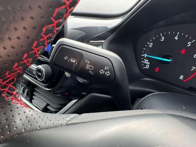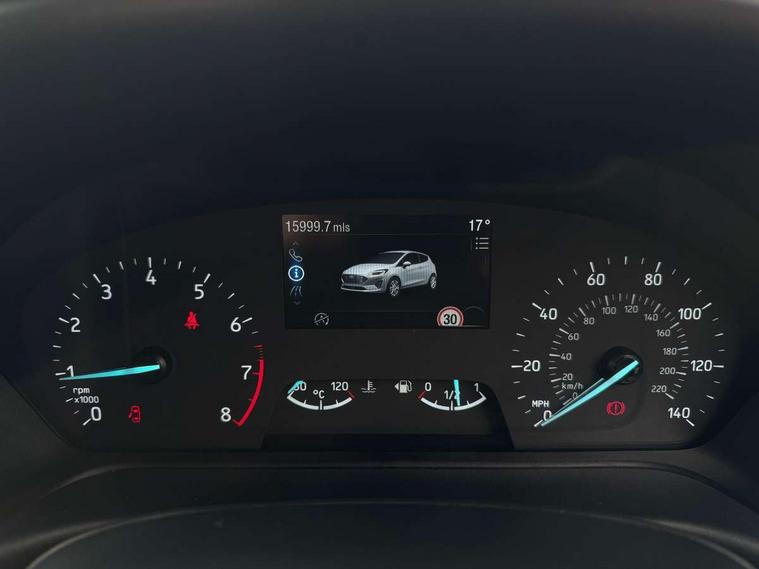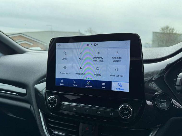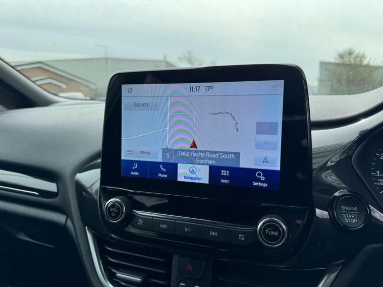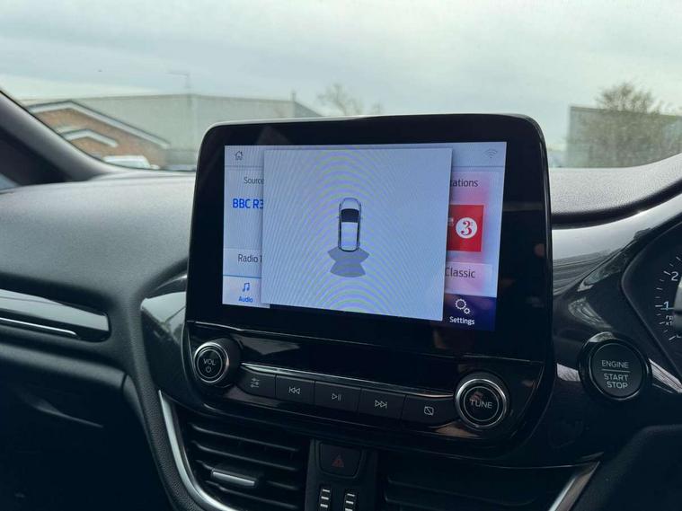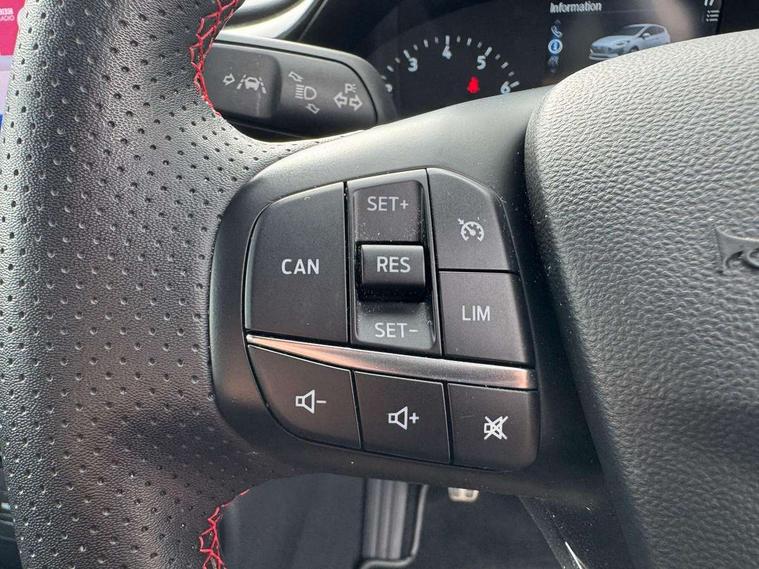4.2" Colour TFT Ice blue illumination analogue cluster, Driver alert system, Electric power steering, Ford easy fuel, Ford SYNC 3 Nav with DAB radio, 8" touch screen, voice control, emergency assist, Apple CarPlay/Android auto, 2x USB, 6 speaker, Ford pass connect, Rear parking distance sensors, Selectable drive modes (Normal, Sport, Track), Speed sign recognition, Trip computer, Sports suspension, 3rd brake light, Auto high beam, Body colour bumpers, Body colour large rear spoiler, Body coloured electrically operated with side indicators, Electric front windows/one touch facility, Quickclear heated windscreen, Rain sensing wipers and auto dimming rear view mirror, Rear privacy glass, Rear side wing doors, Rear wiper, Red air vent inserts, Unique ST-Line upper grille & full bodystyling kit with ST-Line wing badges, 3 seat bench in 2nd row, Adjustable head restraints, Black headlining, Centre console with opening armrest, 2x cupholders, 12v and USB, Cloth upholstery with red stitching, Drivers and Passenger lumbar support, Front floor mats in velour, Leather gaiter, Manual 2 way passenger seat adjust, Manual 4-way driver seat adjust, Manual air conditioning, Sensico wrapped steering wheel, Single front passenger seat, NCAP Pack - Fiesta, 3 point seatbelts on all rear seats, Electronic stability control with hill start assist, Tyre pressure monitoring system, Keyless start with 'Ford Power' starter button, MyKey system, Remote central locking, Thatcham alarm with power door dead locks, 17" 5x2 spoke alloy wheels with rock metallic finish,