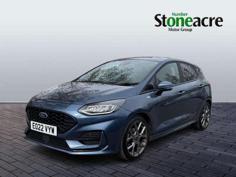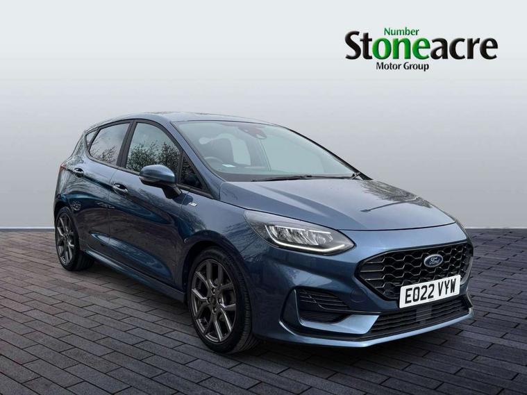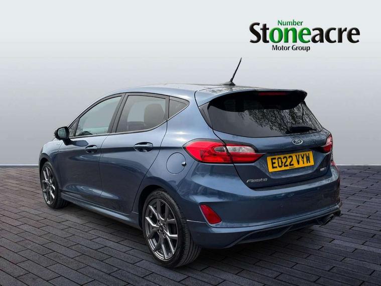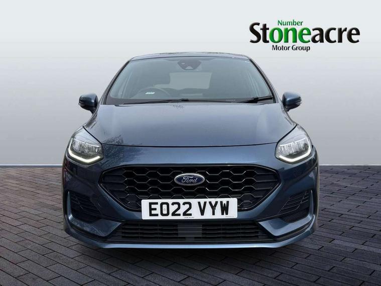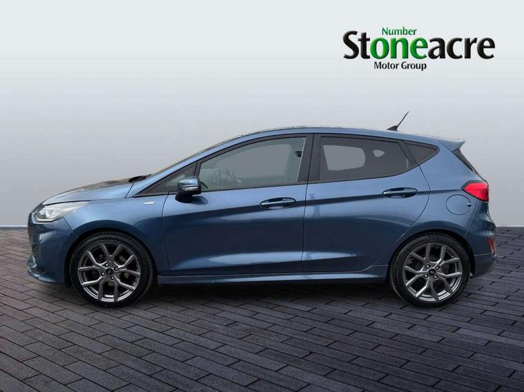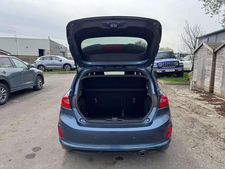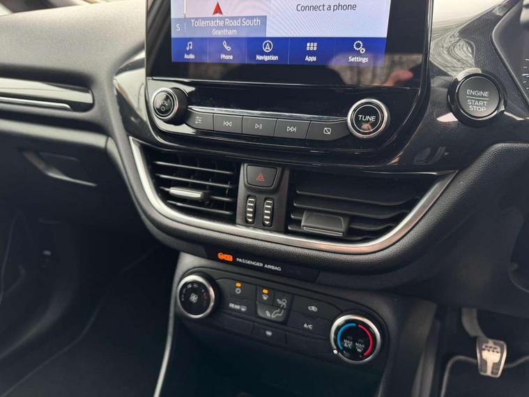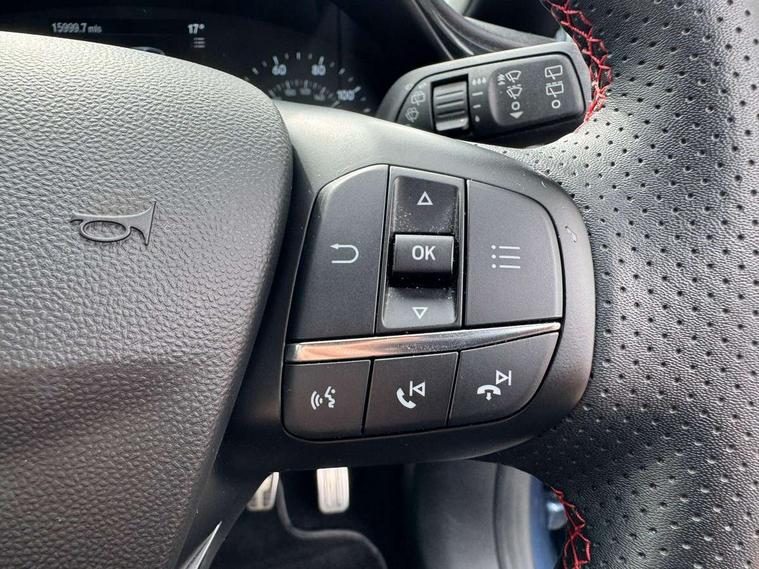 4.2" Colour TFT Ice blue illumination analogue cluster, Driver alert system, Electric power steering, Ford easy fuel, Ford SYNC 3 Nav with DAB radio, 8" touch screen, voice control, emergency assist, Apple CarPlay/Android auto, 2x USB, 6 speaker, Ford pass connect, Rear parking distance sensors, Selectable drive modes (Normal, Sport, Track), Speed sign recognition, Trip computer, Sports suspension, 3rd brake light, Auto high beam, Body colour bumpers, Body colour large rear spoiler, Body coloured electrically operated with side indicators, Electric front windows/one touch facility, Quickclear heated windscreen, Rain sensing wipers and auto dimming rear view mirror, Rear privacy glass, Rear side wing doors, Rear wiper, Red air vent inserts, Unique ST-Line upper grille & full bodystyling kit with ST-Line wing badges, 3 seat bench in 2nd row, Adjustable head restraints, Black headlining, Centre console with opening armrest, 2x cupholders, 12v and USB, Cloth upholstery with red stitching, Drivers and Passenger lumbar support, Front floor mats in velour, Leather gaiter, Manual 2 way passenger seat adjust, Manual 4-way driver seat adjust, Manual air conditioning, Sensico wrapped steering wheel, Single front passenger seat, NCAP Pack - Fiesta, 3 point seatbelts on all rear seats, Electronic stability control with hill start assist, Tyre pressure monitoring system, Keyless start with 'Ford Power' starter button, MyKey system, Remote central locking, Thatcham alarm with power door dead locks, 17" 5x2 spoke alloy wheels with rock metallic finish,