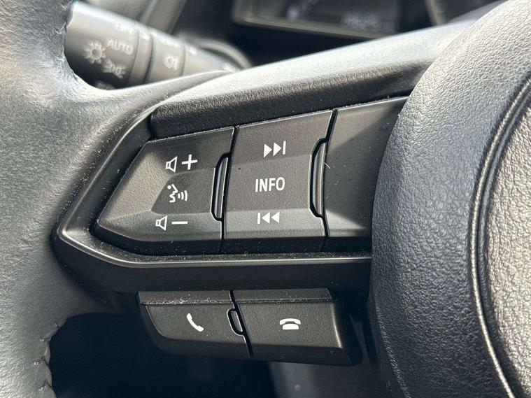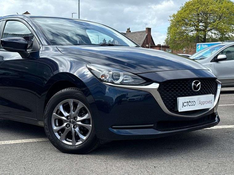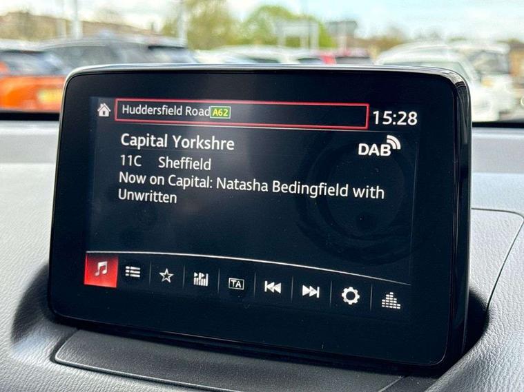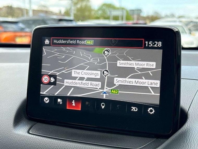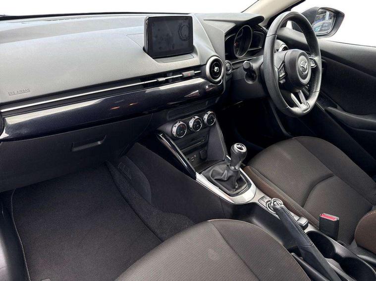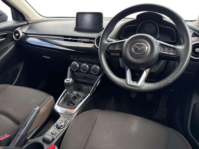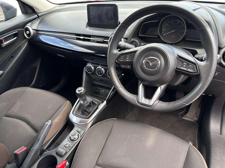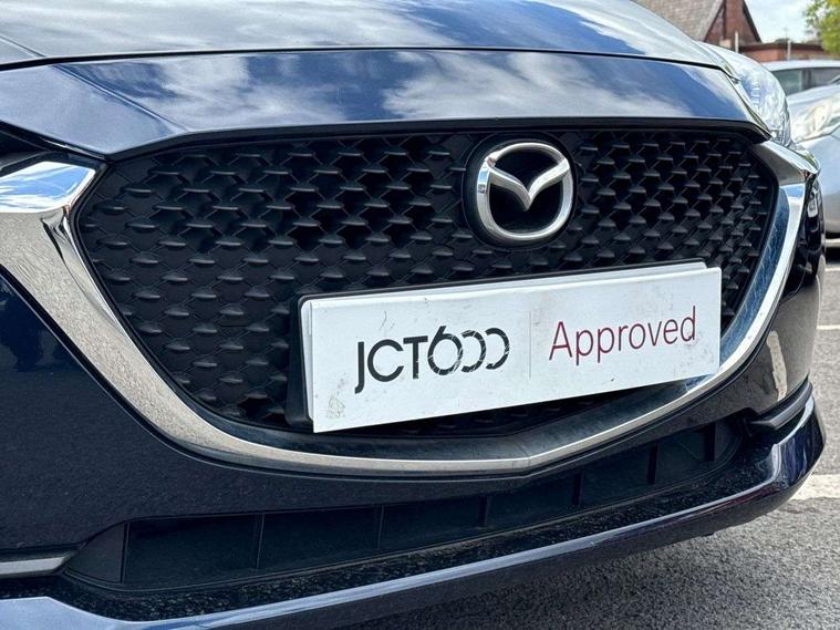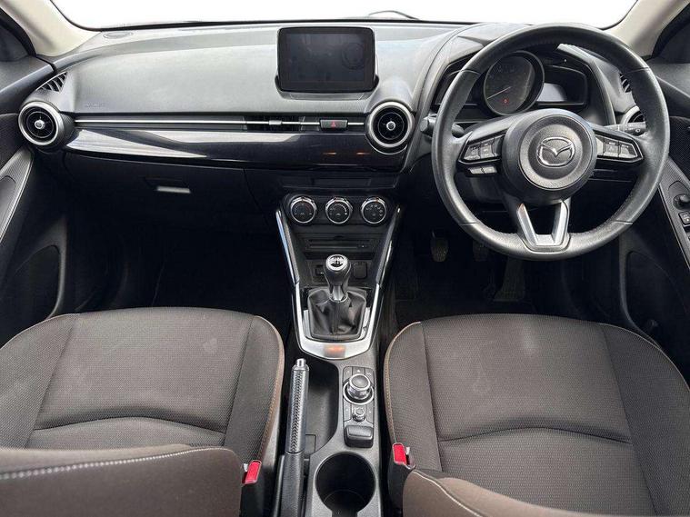 Adjustable speed limiter, Analogue speed display meter, Apple car play/Android Auto, Cruise control, Digital instrument cluster, Emergency stop signalling system, Integrated bluetooth with hands-free calling, bluetooth audio and easy access to phone contacts, Lane departure warning system, Lane keep assist, Mazda connect with 7" colour touch screen, Multimedia Commander, Navigation system, PAS, Rear parking sensor, Service indicator, Trip computer, i-stop, 2 USB interfaces and Aux-In jack, Audio system with 6 speakers with 2 in driver headrest, AM/FM/DAB radio and single CD/MP3, Steering wheel mounted audio/bluetooth controls, Auto dimming rear view mirror, Black front grille, Black front lower bezel, Black rear lower bezel, Body coloured bumpers, Coming/leaving home lighting function, Dusk sensing headlights, Electric adjustable/heated/folding door mirrors, Electric front/rear windows with one touch, Halogen daytime running lights, LED Headlights, LED indicator lights, LED third brake light, Rain sensing front wipers, Rear wiper, 60/40 split rear seats, Climate control air conditioning, Cloth upholstery, Driver, Front passenger and two rear grab handles with coathooks, Drivers seat manual slide recline and height adjustment, Drivers/front passengers covered vanity mirrors and drivers ticket holder, Folding rear seats, Front head restraints, Front passenger and driver door pockets, Front passenger seatback pockets, Gear shift indicator, Glovebox, Interior courtesy light with integrated spotlight, ISOFIX child seat anchorage points attached on outer rear seats, Leather handbrake, Leather steering wheel and gear knob, Luggage compartment light, Passenger seat manual slide and height adjustment, Three height adjustable rear head restraints, Tilt/telescopic adjustable steering wheel, 3 point seatbelts on all seats, Anti-lock braking system (ABS), Collision mitigation braking system, Dual front airbags, Dynamic stability control + Traction control, ESP, Front and rear curtain airbags, Front driver, passenger and rear seat seatbelt warning, Front side airbags, Front smart city brake support, G-Vectoring control plus, Hill hold assist, Passenger airbag cut-off switch, Tyre pressure monitoring system, Alarm, Immobiliser, Remote central locking, Black dashboard, 15" alloy wheels, Emergency tyre repair kit,