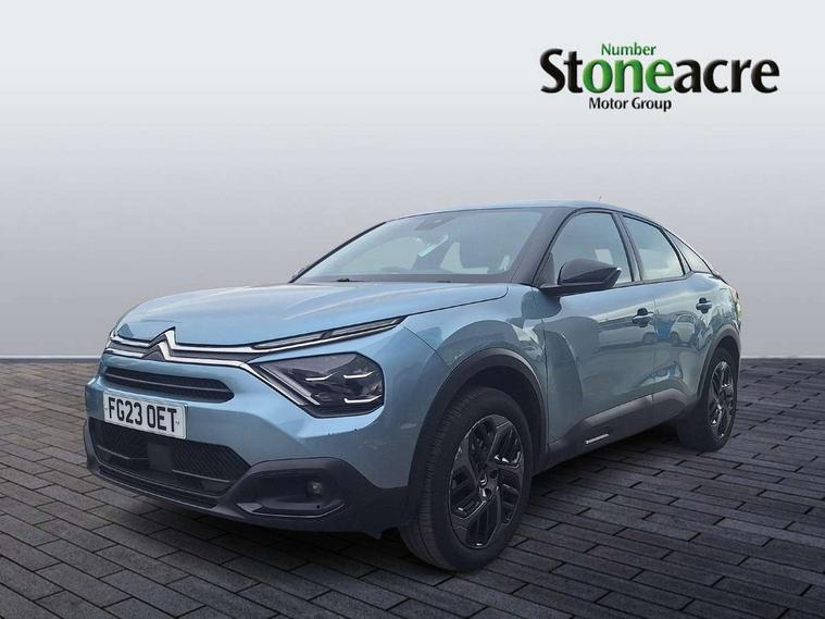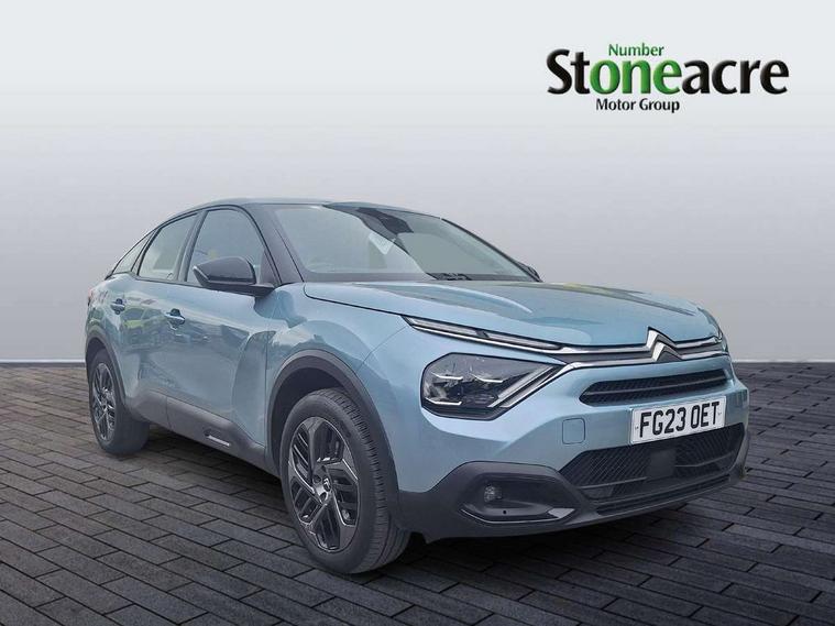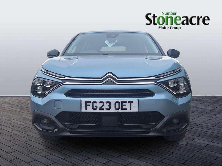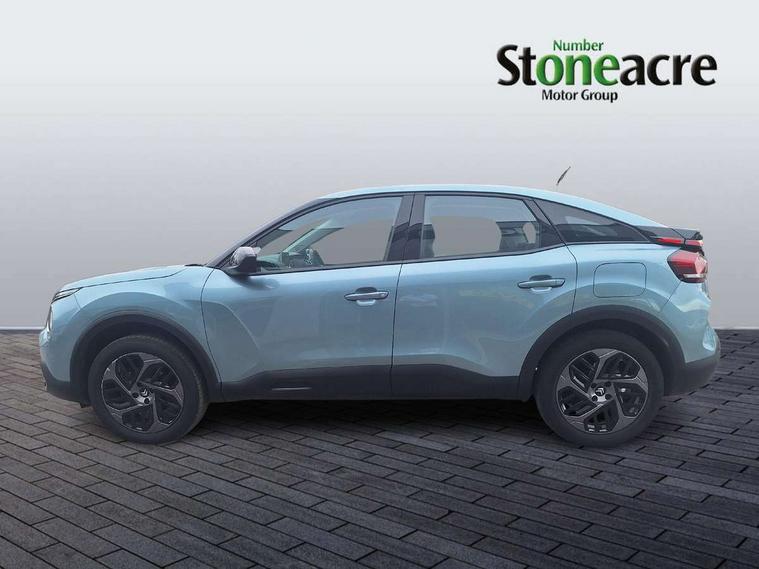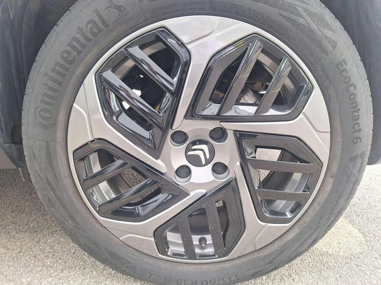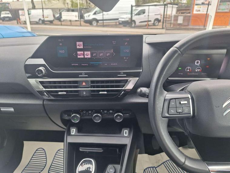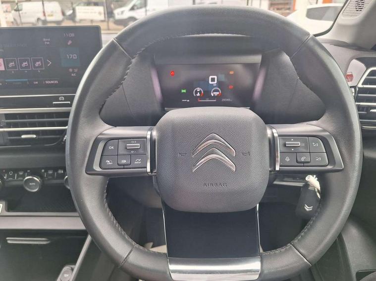 5.5 inch backlit full TFT driver's instrument cluster with LED ambient lighting, Apple car play and Android auto, Citroen connect box emergency and assistance system, Citroen Smart Pad Support - integrated support for attaching a tablet computer for front passenger, Cruise control + speed limiter, Driver's head-up display, Electronic Power Steering (EPS), In-crash braking, My Citroen Drive Plus: 10" high-resolution touchscreen user interface, controlling media, connectivity, vehicle settings + connected nav, Rear parking sensors, Tailgate, Top rear vision reversing camera, Voice commands, Advanced comfort suspension - double hydraulic stops on front suspension and single on rear suspension, 6 speakers, Bluetooth telephone and audio streaming, DAB Digital radio, 3rd brake light, Automatic headlights, Body colour bumpers, Body colour door handles, Boot spoiler, Electrically heated, folding and adjustable external rear view mirrors, Front and rear electric windows, Gloss black rear skirt, LED daytime running lights in V signature, LED front fog lamps with static cornering function, LED front headlamps, Perla Nera black painted external rear view mirrors, Rain sensing automatic front windscreen wipers, Rear side wing doors, Rear wiper, Shark fin roof aerial, Standard interior rear-view mirror with manual day-night switching, Welcome and goodbye lighting, 12V power outlet, 1x USB Type-C socket charging & data connection and 1x USB Type-A socket in 1st row and 1x USB Type-A socket charging in 2nd row, 3 rear headrests, 3 seat bench in 2nd row, Boot light, Chevrons cloth and leather effect textile seat upholstery, Dashboard tray in front cabin, Driver and passenger sunvisors with illuminated vanity mirrors, Dual zone automatic air conditioning, Front and rear LED interior lighting, Front head restraints, Grained leather steering wheel with two command blocks, Height adjustable driver's seat with adjustable lumbar support, Height adjustable front passenger seat, Height and reach adjustable steering wheel, Map pockets in rear of front seats, Raised centre console with armrest and two cup holders, Single front passenger seat, Split folding rear seats, Two position boot floor, High level acoustic insulation pack - C4/C4 X/e-C4 X, 3x3 point rear seatbelts, ABS, Driver and front passenger airbags, Electric parking brake, ESP, Front seatbelt pretensioners, Hill start assist, Manual child lock in second row, Manual deactivation of front passenger airbag, Row 1 and 2 curtain airbags, Row 1 side thorax airbags, Seatbelt unfastened on the move warning, Tyre underinflation detection, Anti-theft alarm (volumetric protection), Immobiliser, Remote locking with deadlocks, Two remote keys, 18" Bi-tone painted aeroblade alloy wheels with anti-theft locking wheel nuts, Puncture repair kit with compressor,