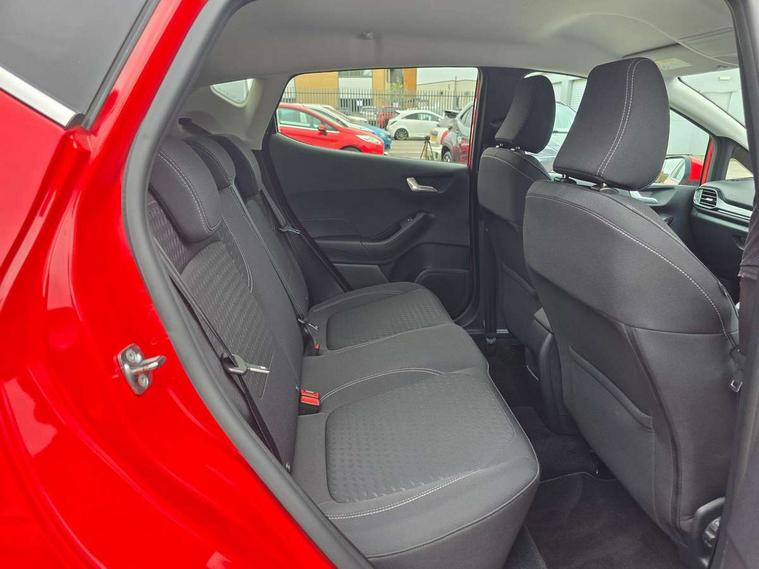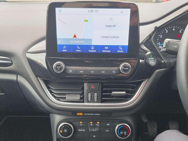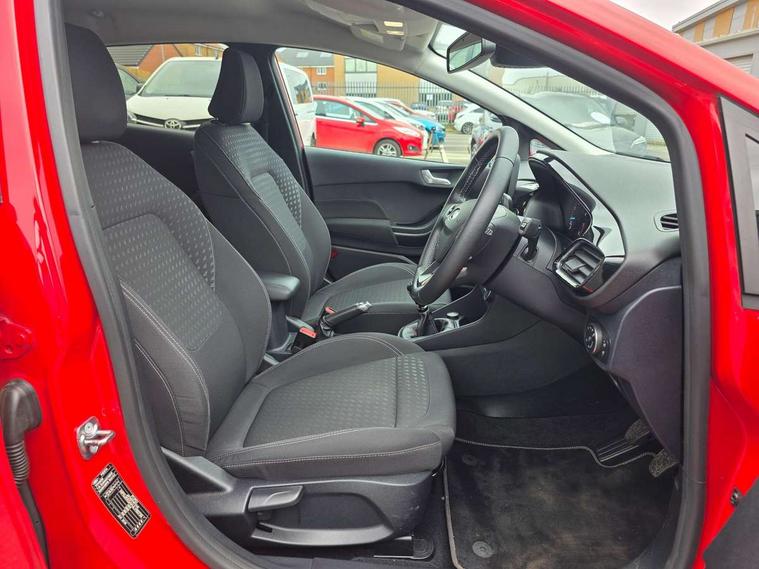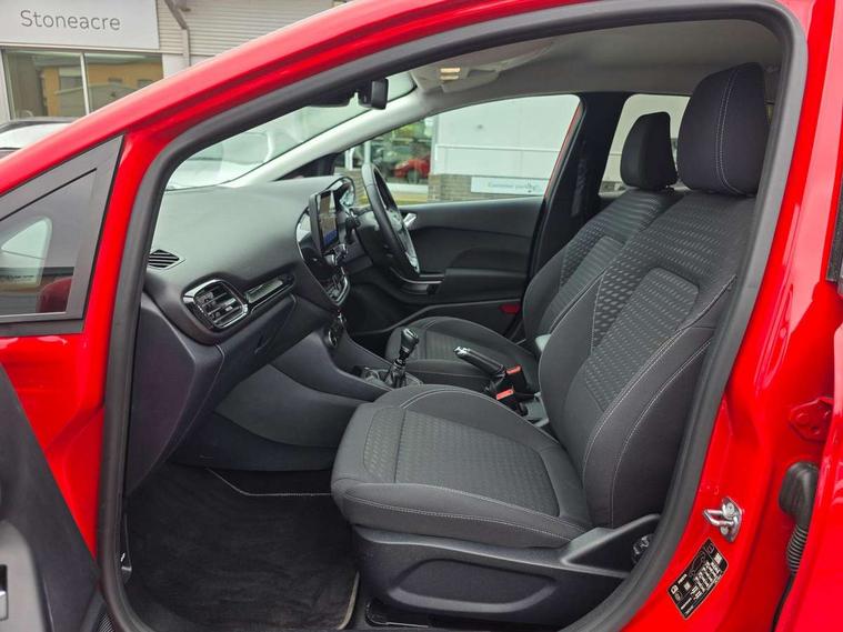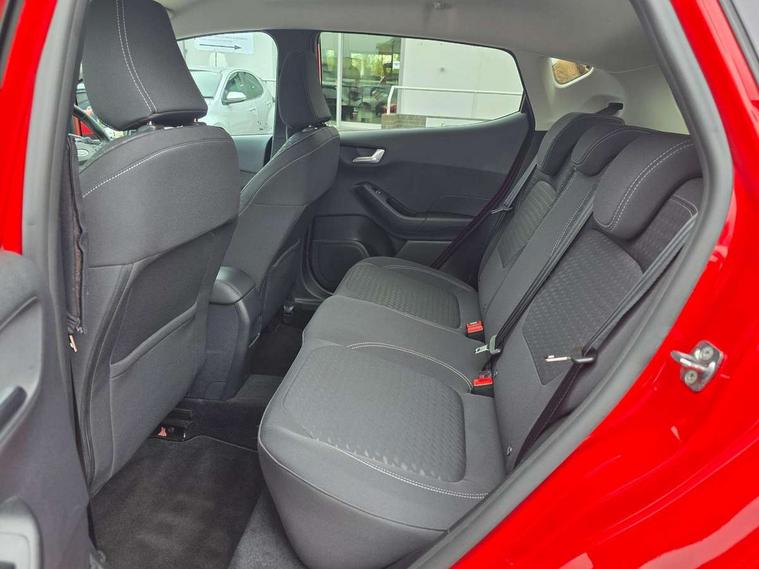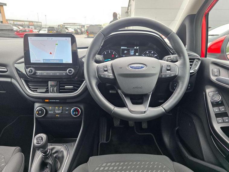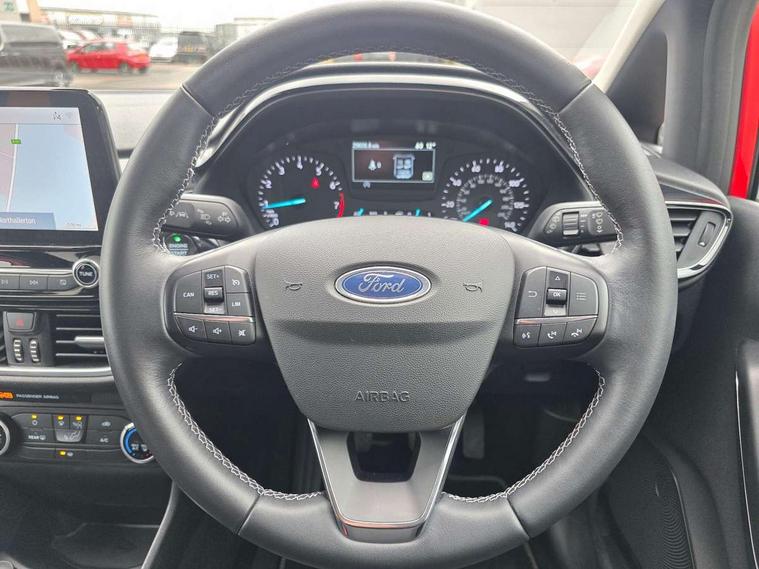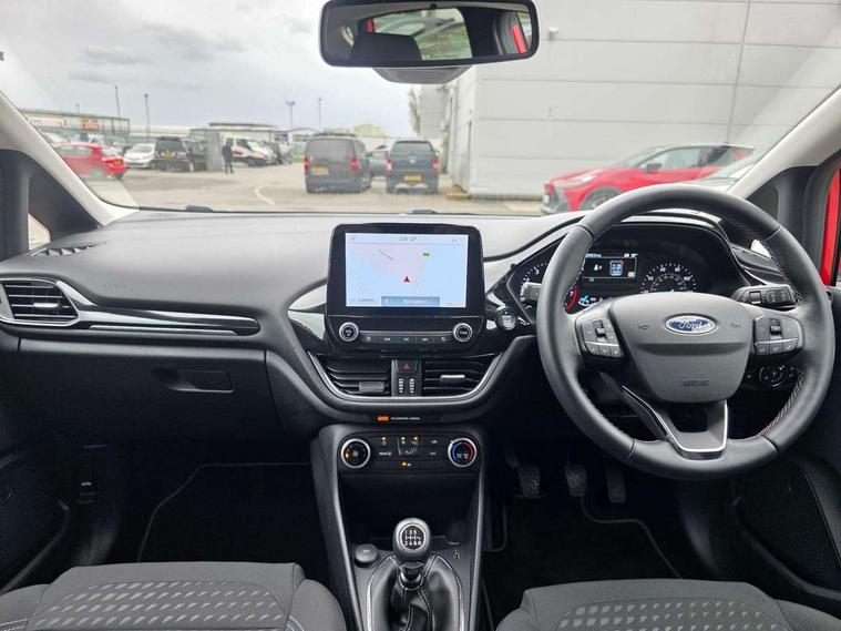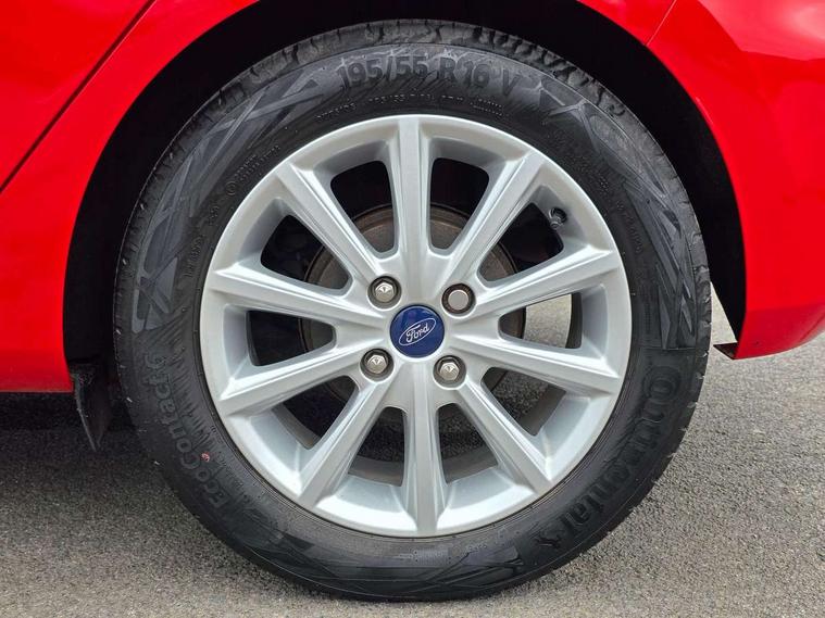 Bluetooth system, Electric power steering, Ford easy fuel, Ford SYNC 3 Navigation system incl 8" touchscreen, 7 speakers, FordPass connect, Apple carplay, android auto, voice control and emergency assistance, Rear parking distance sensors, Trip computer, 2 USB ports, Auxiliary input socket, DAB Digital radio, Steering wheel mounted controls, Body colour bumpers, Body colour door handles, Body colour rear spoiler, Body coloured electrically operated and heated door mirrors with side indicators, Chrome beltline trim, Chrome front grille, Chrome lower window surround, Cornering front fog lights, Electric front windows/one touch facility, Electric rear windows, Power foldable door mirrors with puddle lights, Privacy glass, Quickclear heated windscreen, Rain sensing wipers and auto dimming rear view mirror, Rear wiper, 12V Accessory socket in centre console, 3 spoke leather trimmed steering wheel with audio control, 60/40 split folding rear seat, Adjustable head restraints, Boot carpet, Centre console with armrest and illuminated cupholders, Chrome inner door handles, Cloth upholstery, Footwell illumination, Front floor mats in velour, Front map reading lights, Front seat and rear pockets, Height adjustable driver's seat, Illuminated glovebox, LED ambient lighting, Load area light, Luxury woven headliner, Manual air conditioning, Overhead console with sunglasses holder, Pollen filter, Rake/reach adjustable steering wheel, Sensico leather steering wheel/gear knob/handbrake, NCAP Pack - Fiesta, 3 point seatbelts on all rear seats, ABS+EBA, Curtain airbags, Driver and passenger airbags, Drivers knee airbag, Electronic stability control with hill start assist, Front passenger airbag deactivation, Front side airbags, Seatbelt warning, Two tone horn, Tyre pressure monitoring system, Keyless start with 'Ford Power' starter button, MyKey system, Remote central locking & engine immobiliser, Thatcham Cat.1 alarm, 16" 10 spoke alloy wheels,