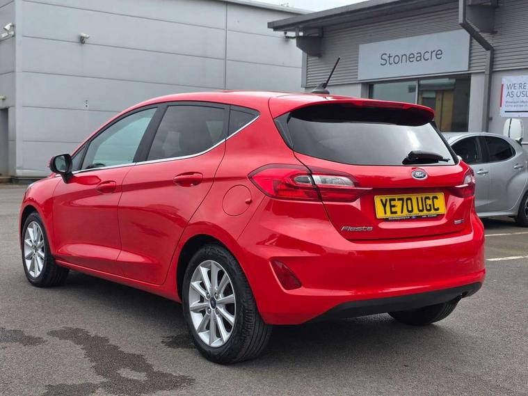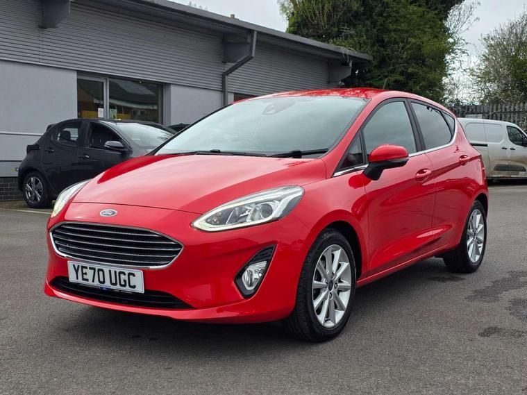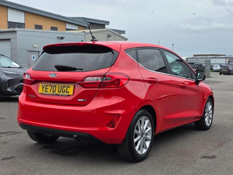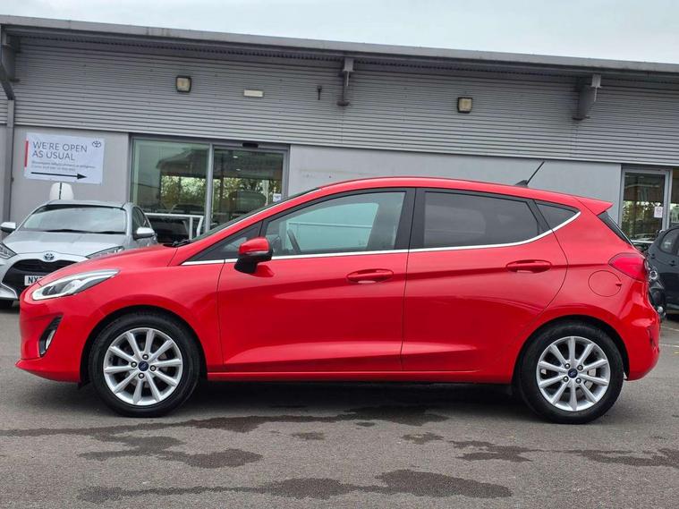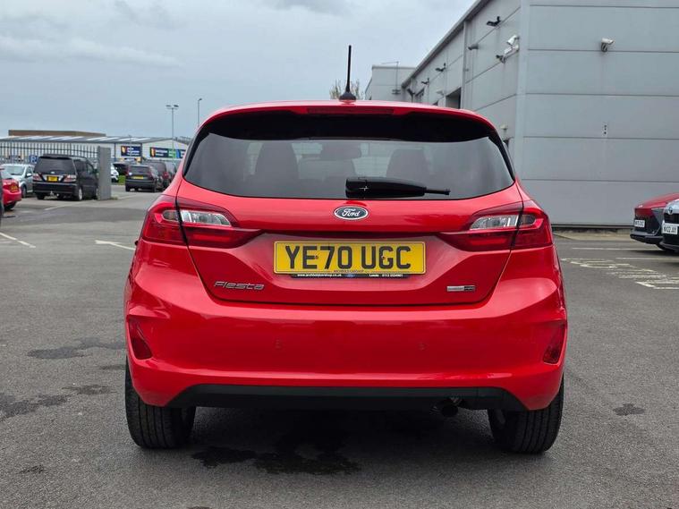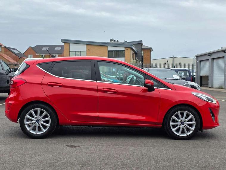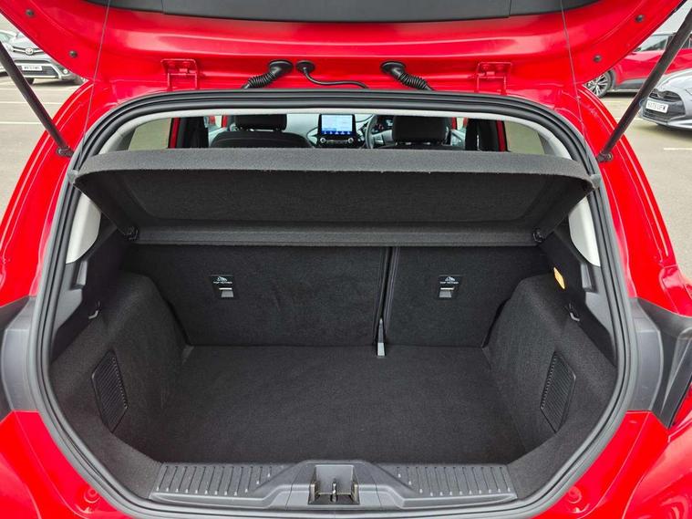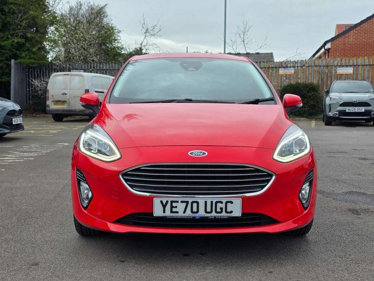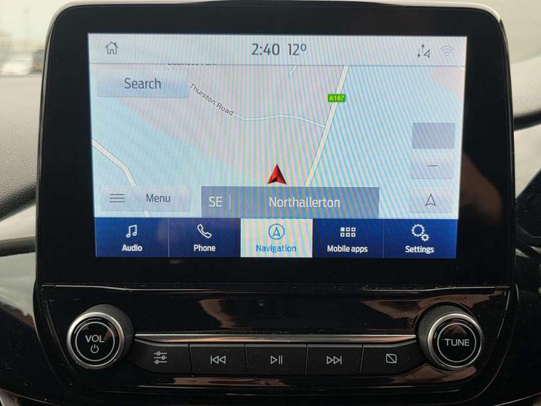Bluetooth system, Electric power steering, Ford easy fuel, Ford SYNC 3 Navigation system incl 8" touchscreen, 7 speakers, FordPass connect, Apple carplay, android auto, voice control and emergency assistance, Rear parking distance sensors, Trip computer, 2 USB ports, Auxiliary input socket, DAB Digital radio, Steering wheel mounted controls, Body colour bumpers, Body colour door handles, Body colour rear spoiler, Body coloured electrically operated and heated door mirrors with side indicators, Chrome beltline trim, Chrome front grille, Chrome lower window surround, Cornering front fog lights, Electric front windows/one touch facility, Electric rear windows, Power foldable door mirrors with puddle lights, Privacy glass, Quickclear heated windscreen, Rain sensing wipers and auto dimming rear view mirror, Rear wiper, 12V Accessory socket in centre console, 3 spoke leather trimmed steering wheel with audio control, 60/40 split folding rear seat, Adjustable head restraints, Boot carpet, Centre console with armrest and illuminated cupholders, Chrome inner door handles, Cloth upholstery, Footwell illumination, Front floor mats in velour, Front map reading lights, Front seat and rear pockets, Height adjustable driver's seat, Illuminated glovebox, LED ambient lighting, Load area light, Luxury woven headliner, Manual air conditioning, Overhead console with sunglasses holder, Pollen filter, Rake/reach adjustable steering wheel, Sensico leather steering wheel/gear knob/handbrake, NCAP Pack - Fiesta, 3 point seatbelts on all rear seats, ABS+EBA, Curtain airbags, Driver and passenger airbags, Drivers knee airbag, Electronic stability control with hill start assist, Front passenger airbag deactivation, Front side airbags, Seatbelt warning, Two tone horn, Tyre pressure monitoring system, Keyless start with 'Ford Power' starter button, MyKey system, Remote central locking & engine immobiliser, Thatcham Cat.1 alarm, 16" 10 spoke alloy wheels,